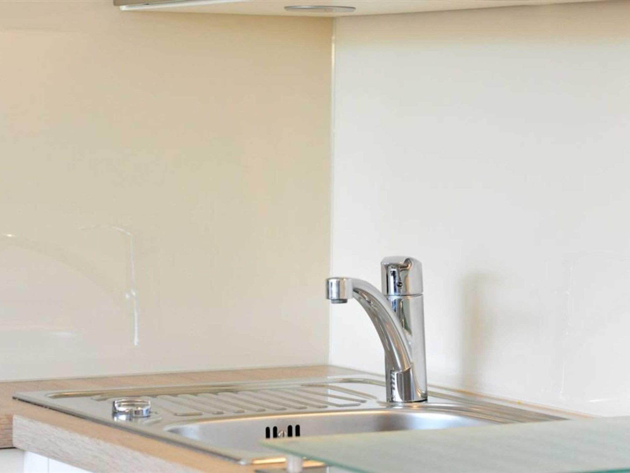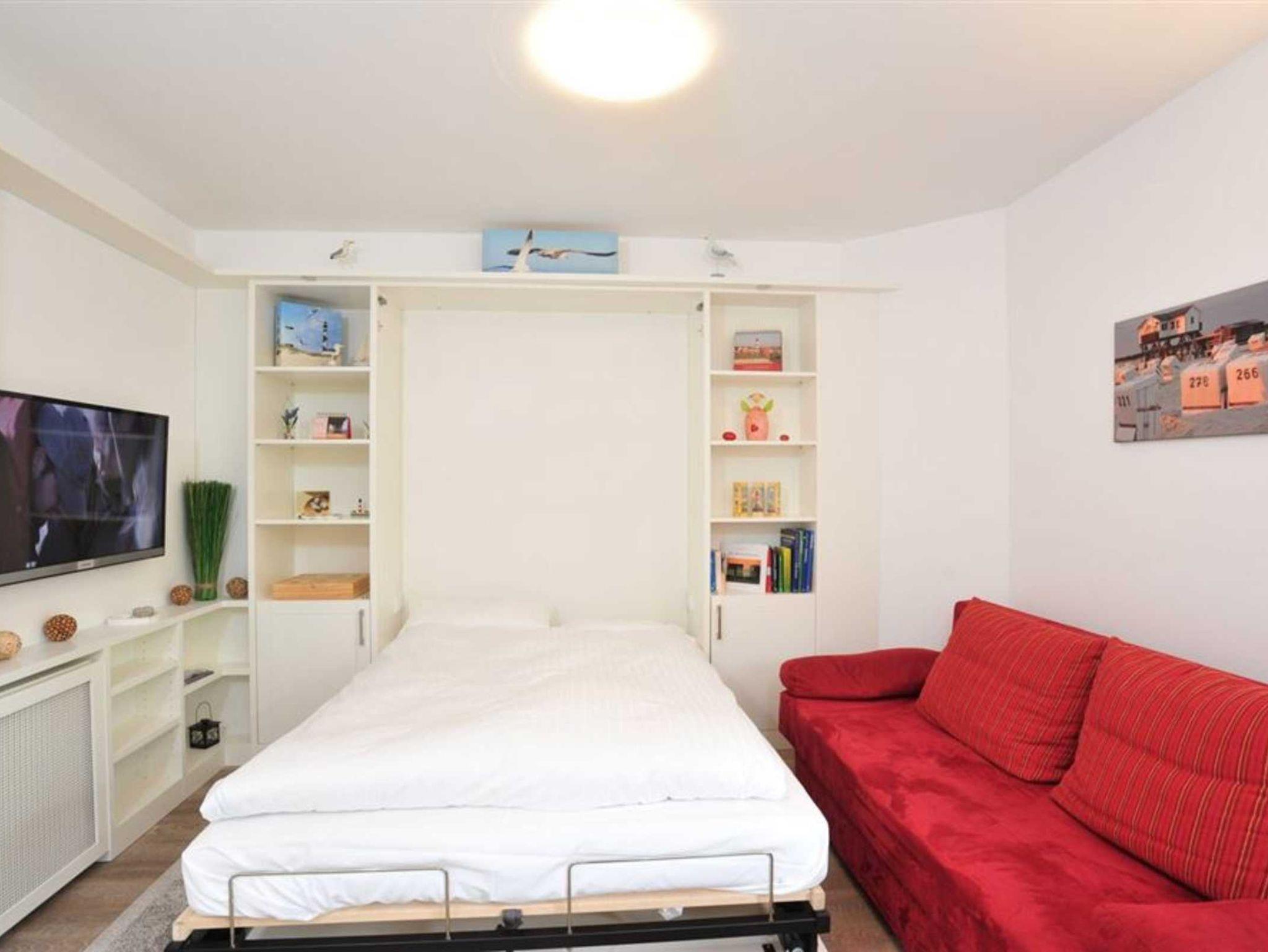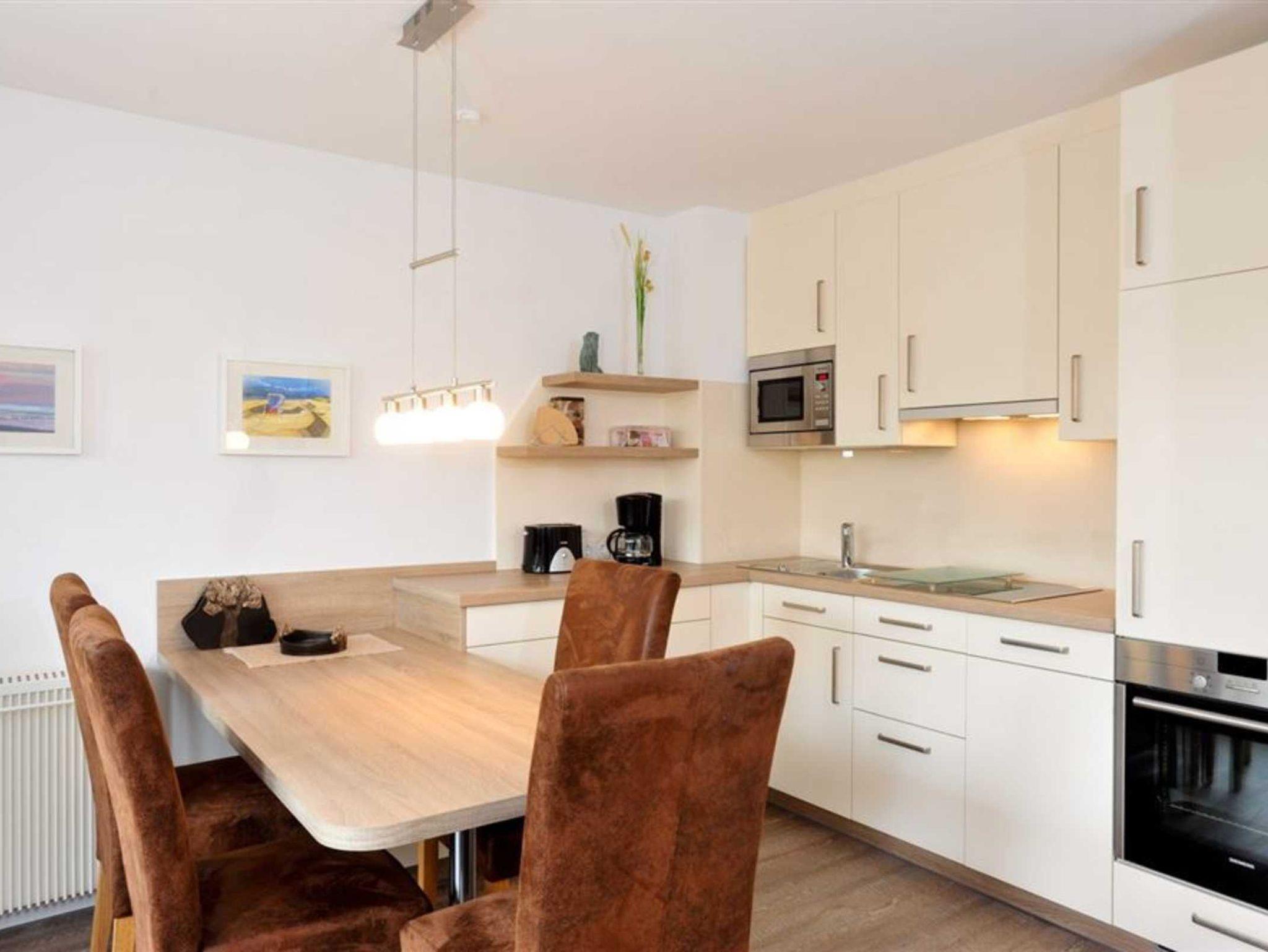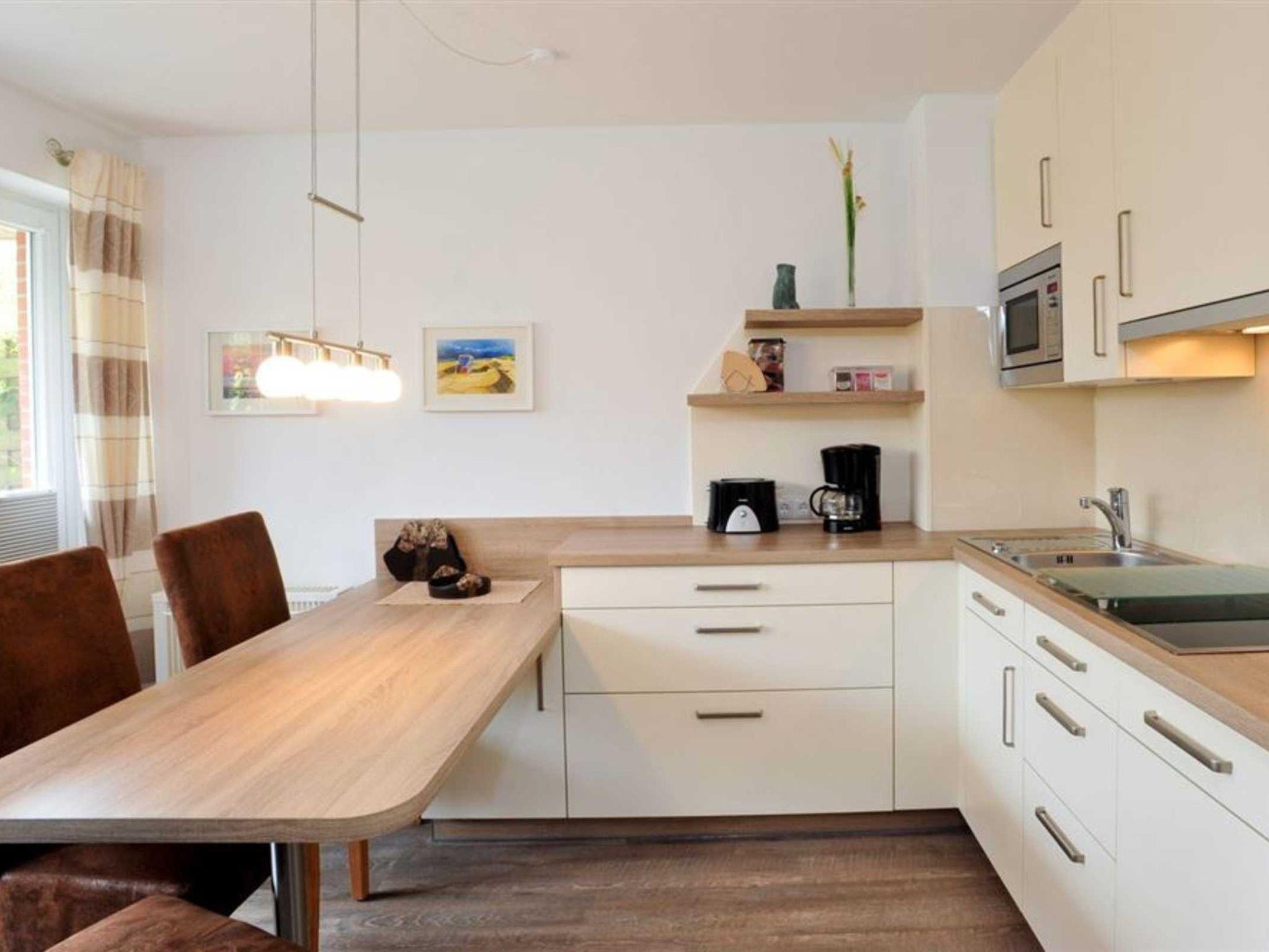 Wohn- und Schlafzimmer mit Sofa, Schrank-Doppelbett (140x200cm), Sessel, TV (Sat) und Esstisch mit 4 Stühlen. Direkter Zugang zur möblierten Terrasse mit Strandkorb nach Südosten. Moderne offene Küche mit Backofen, Mikrowelle, Geschirrspüler und Kühlschrank mit Gefrierfach.