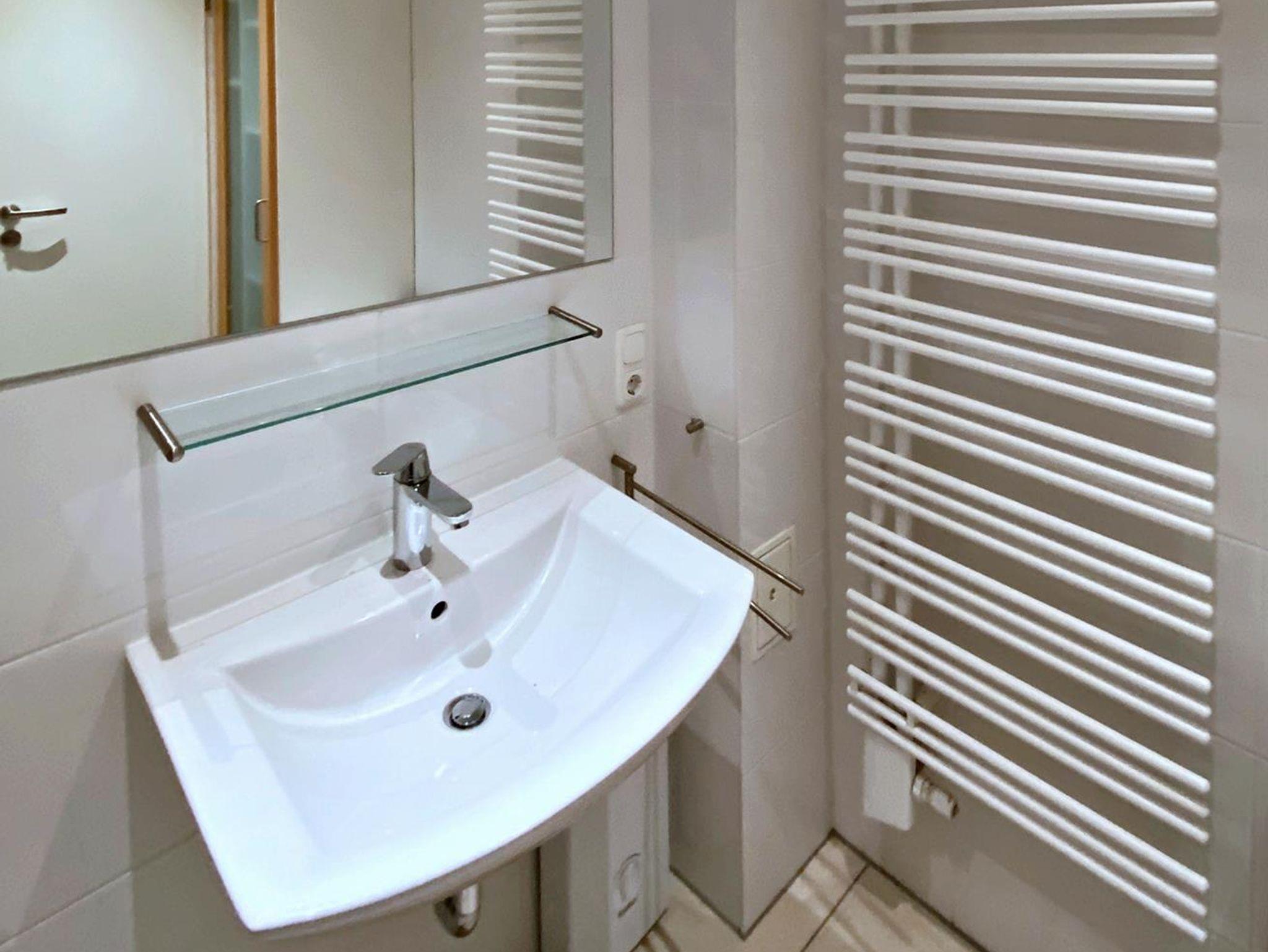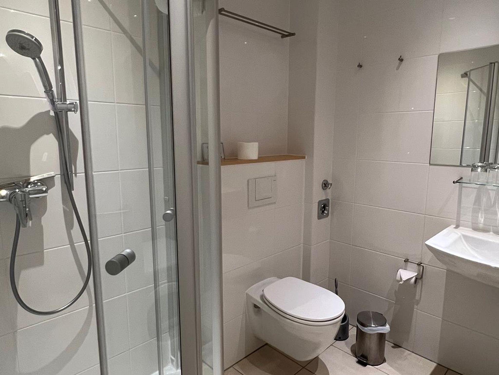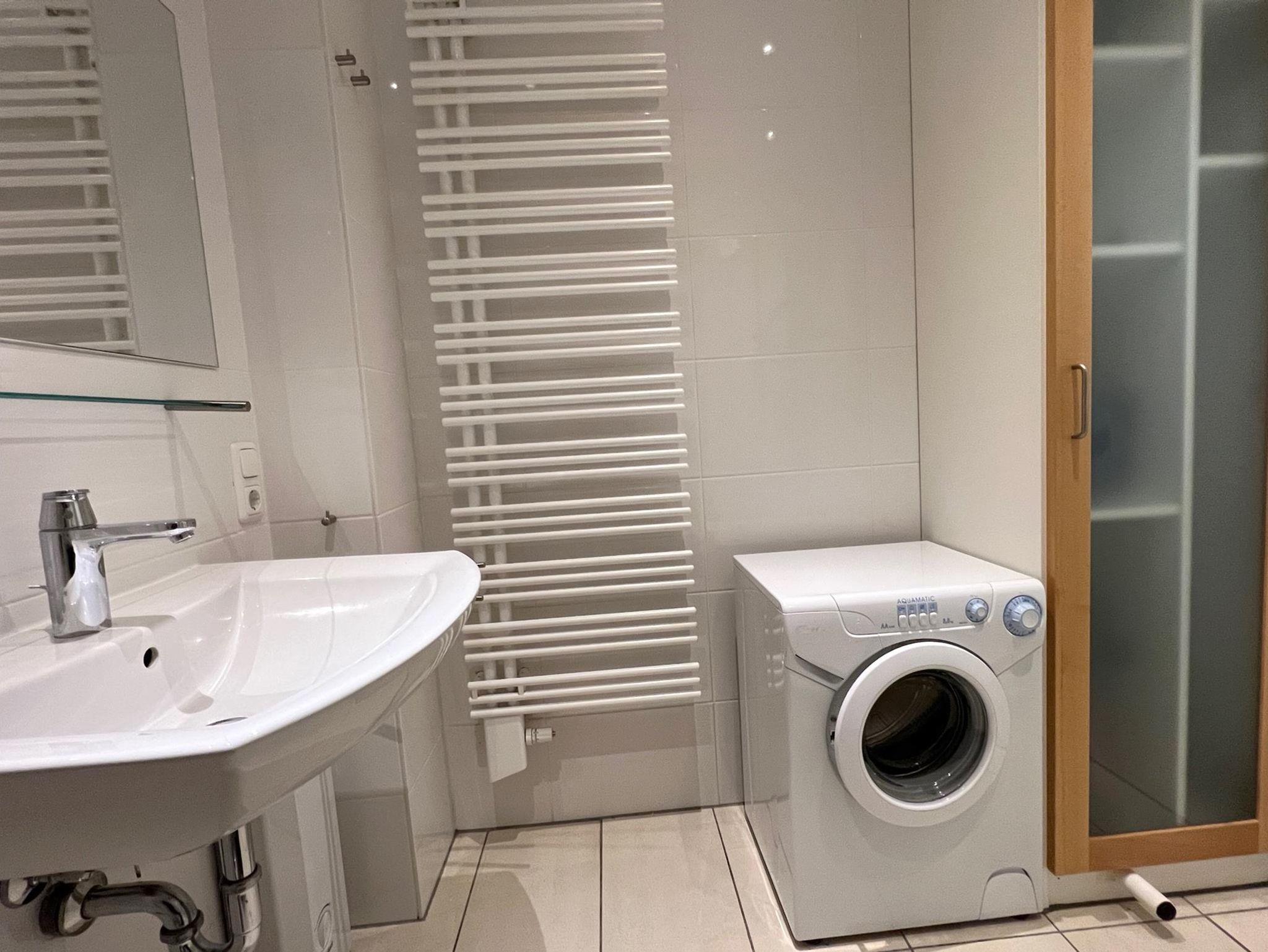 Bad: Dusche, Waschbecken, WC, Schrank, Staubsauger, Waschmaschine, Duschkabine, Musik über die Stereoanlage vom Wohnzimmer