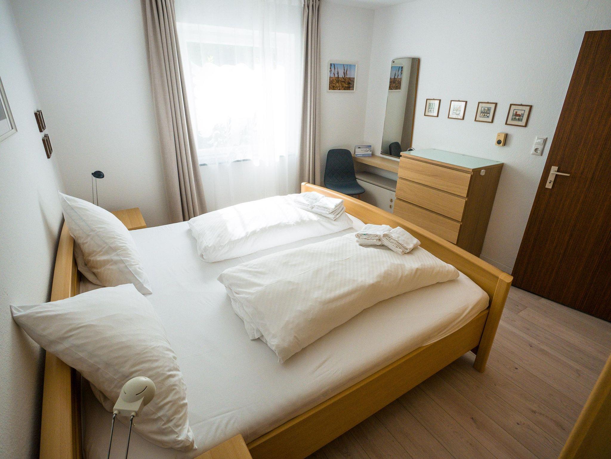 Im Schlafzimmer befindet sich ein Ehebett (2 Matratzen à 1,0 m x 2 m, Lattenrost und Matratzen 2023 erneuert), das Kinderzimmer ist mit einem Doppelstockbett (0,9 m x 2 m) ausgestattet. Zusätzlich lässt sich die Couch im Wohnzimmer zu einem Bett umbauen, so dass auch 6 Personen eine Schlafgelegenheit finden.