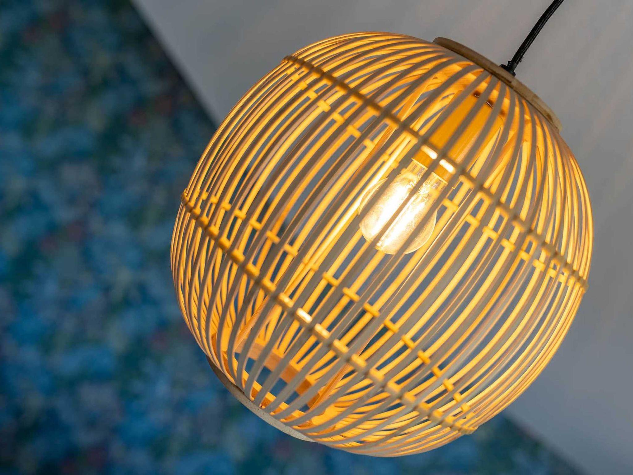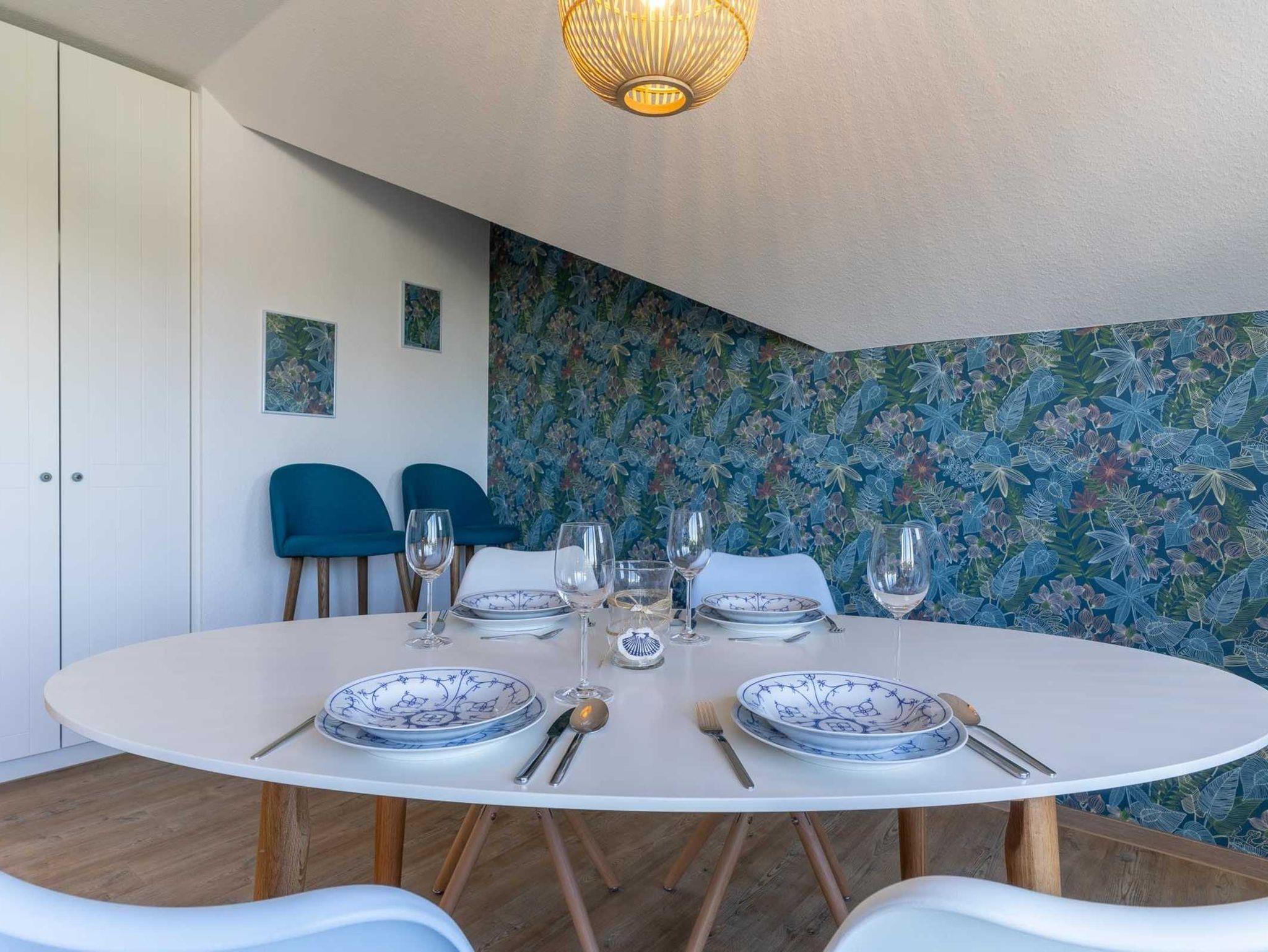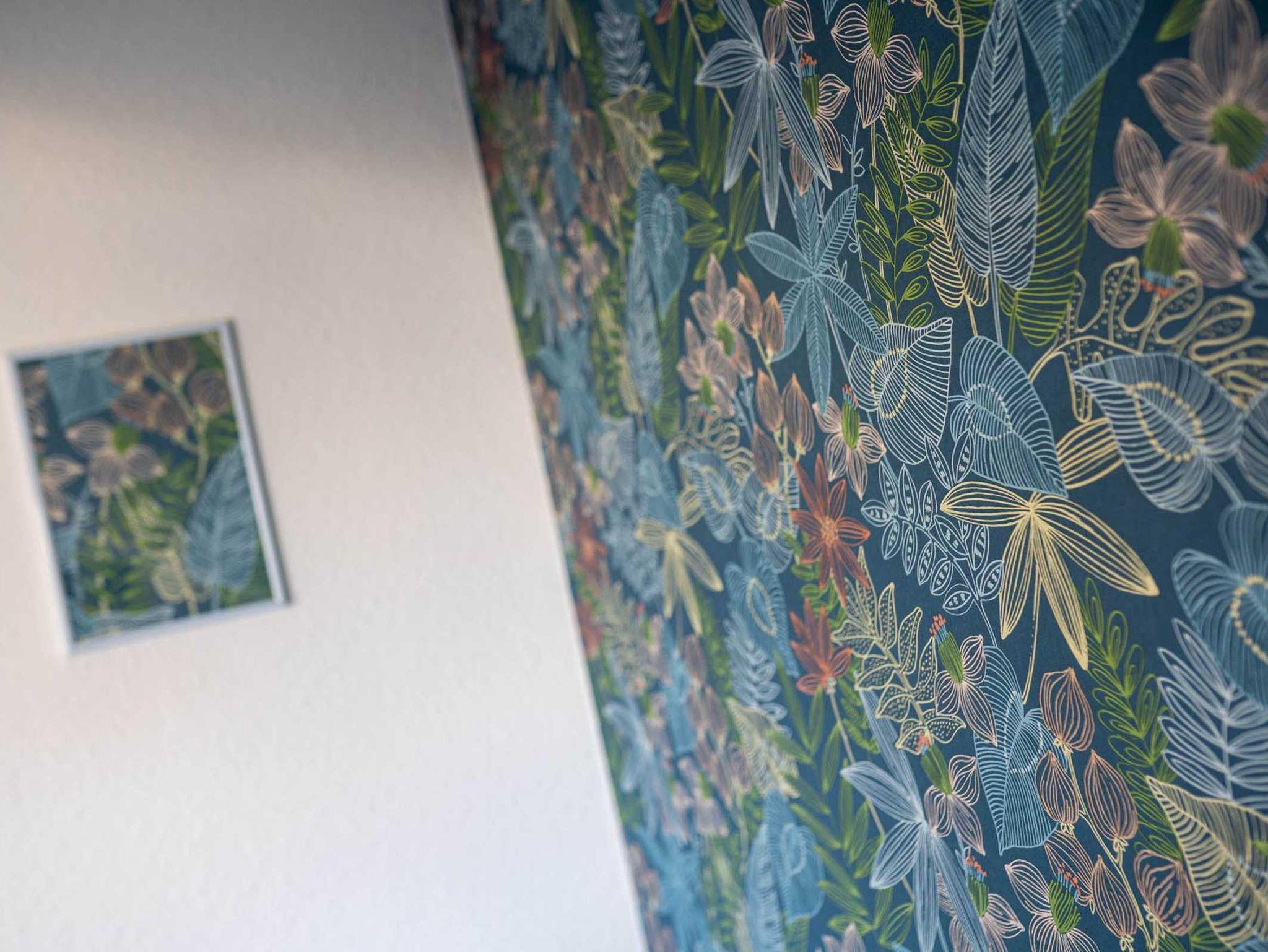 Der Essbereich ist mit einer farbenfrohen Tapete gestaltet, die einen Blickfang schafft, eingerahmt von warmen Holz- und klaren Weißtönen.