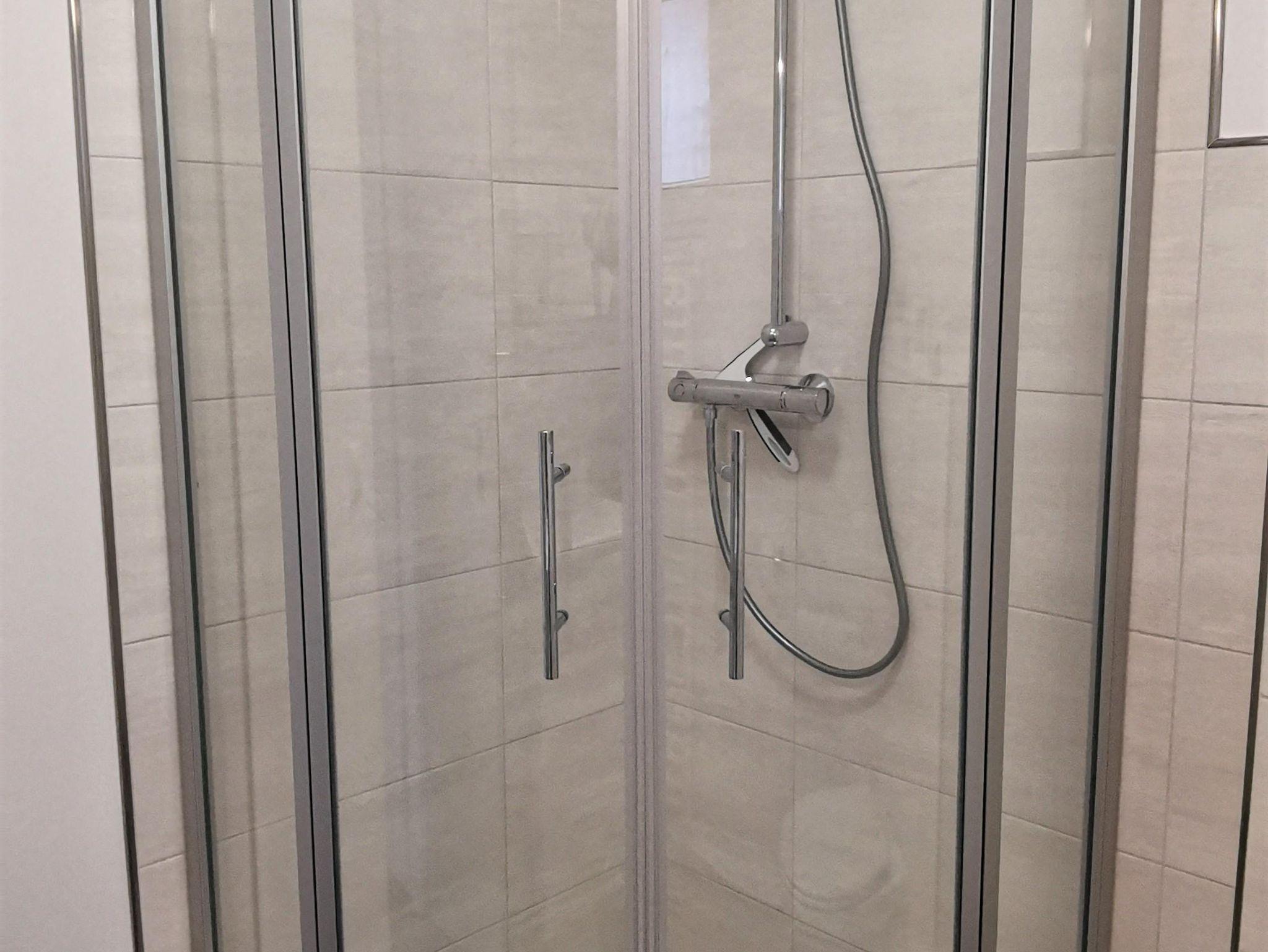 Ein modernes Duschbad von 2022 mit Fenster, Waschtisch und Spiegelschrank; ausreichend Platz für die Familie.