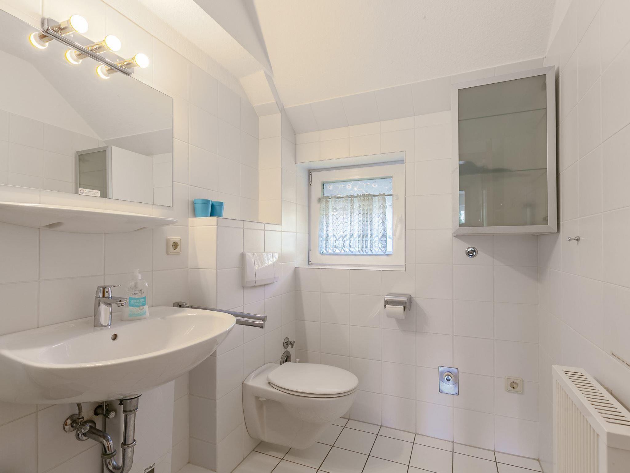 Badezimmer (Duschbad) mit Dusche, WC, Tageslicht und Föhn.