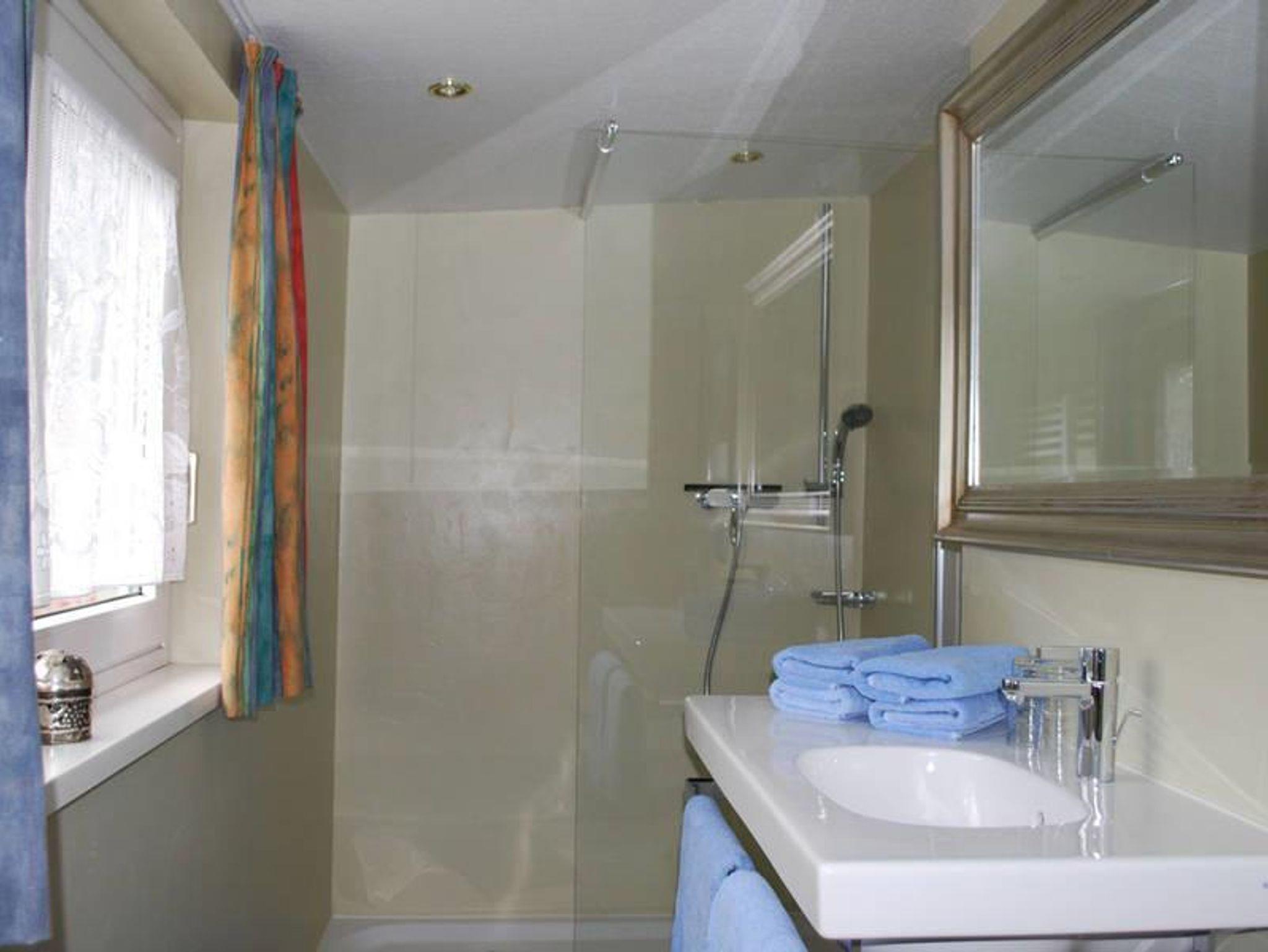 Das Bad mit großer Duschzelle, Föhn und Wandschränken ist edel ausgestattet.