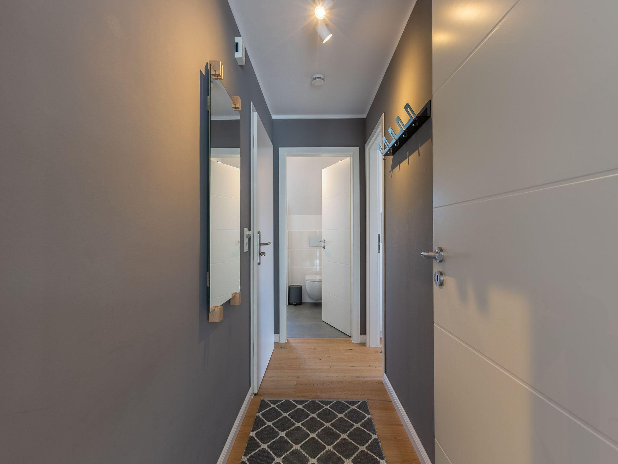 Flur mit Spiegel. Schuhablage vor dem Eingang.