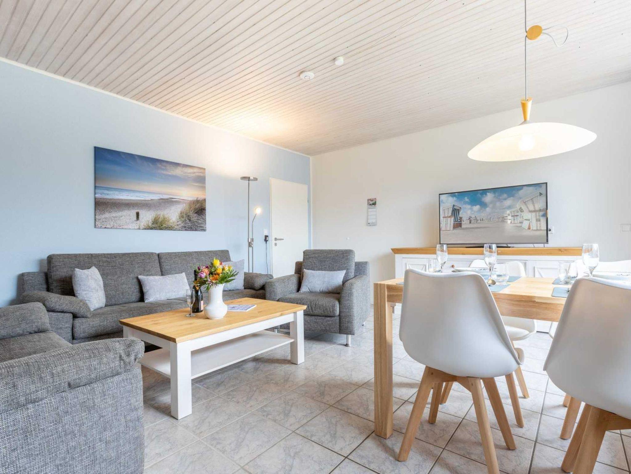1. Wohnzimmer (EG) mit 2 Sofas (3er und 2er), Sessel, großem SMART-TV (Sat), Radio, Esstisch für 5 Personen und direktem Zugang zur möblierten Südterrasse.