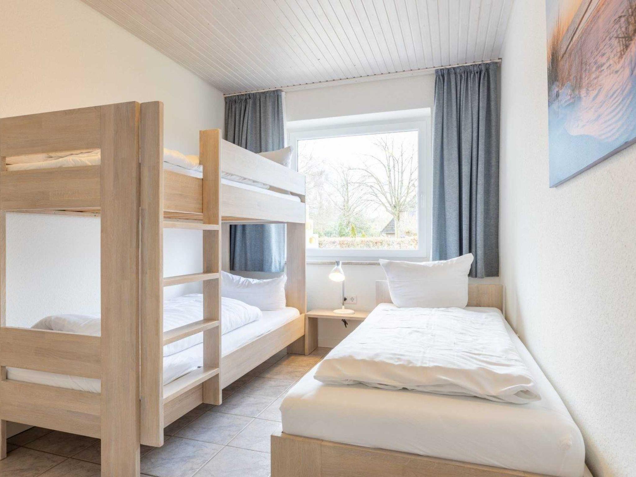 2. Schlafzimmer mit Einzelbett (90x200cm), 2 Etagen-Einzelbetten (je 90x200cm) und Kleiderschrank.