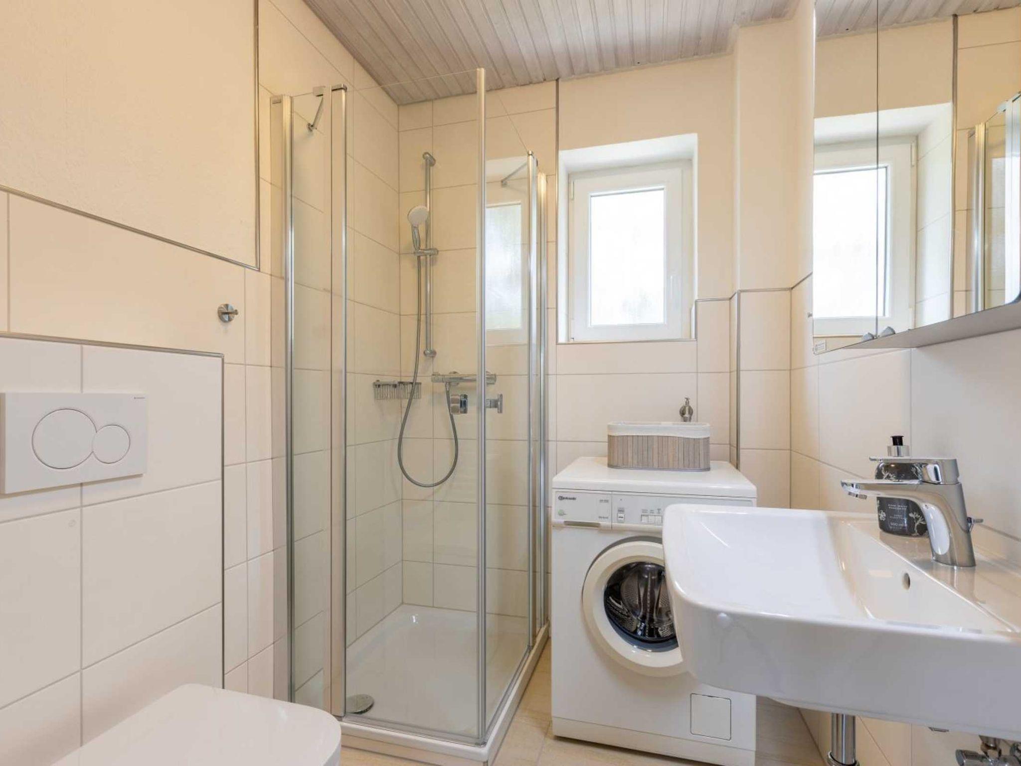 2. Badezimmer (OG) mit Dusche, WC, Waschmaschine, Handtuchwärmer und Tageslicht.