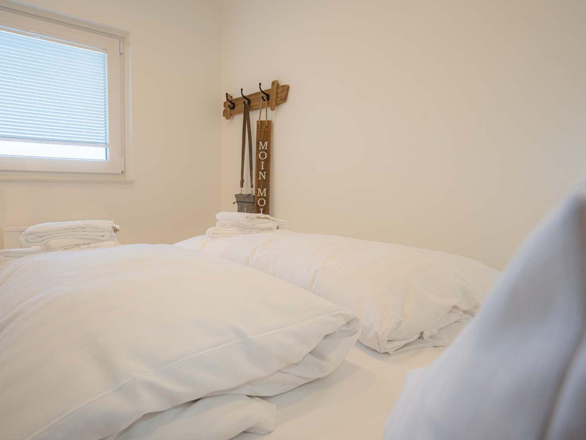 Schlafzimmer mit Doppelbett (2x 80x200cm) und Stuhl.