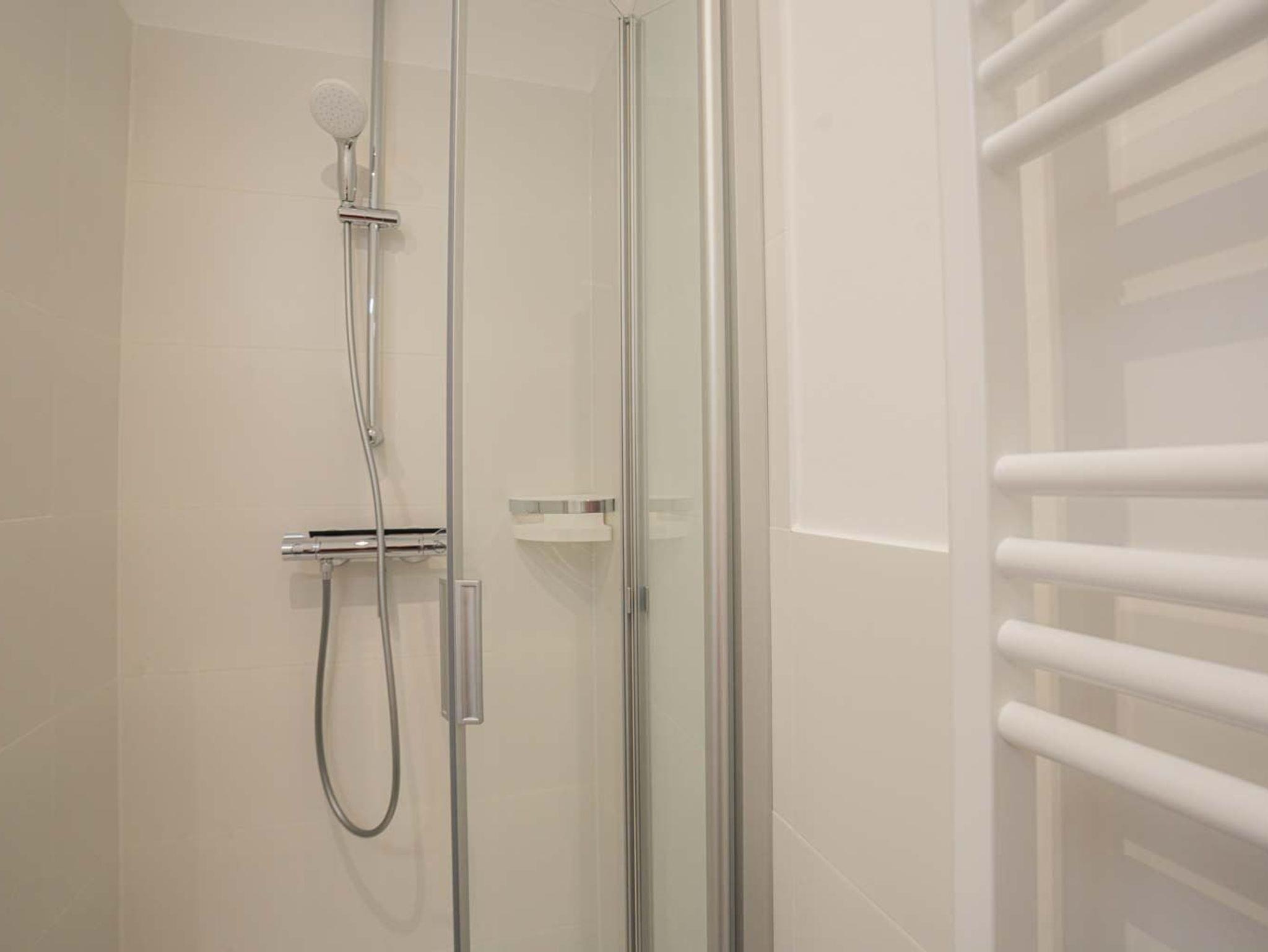 Badezimmer (Duschbad) mit Dusche (niedriger Eintritt), WC, Handtuchwärmer und Föhn.