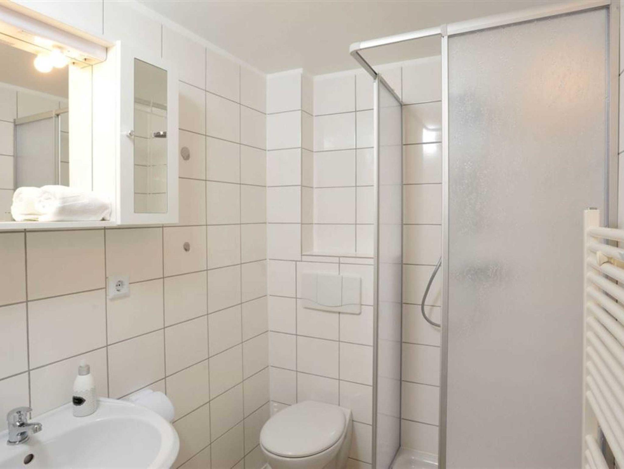 Badezimmer (Duschbad) mit Dusche, WC, Handtuchwärmer und Föhn.
