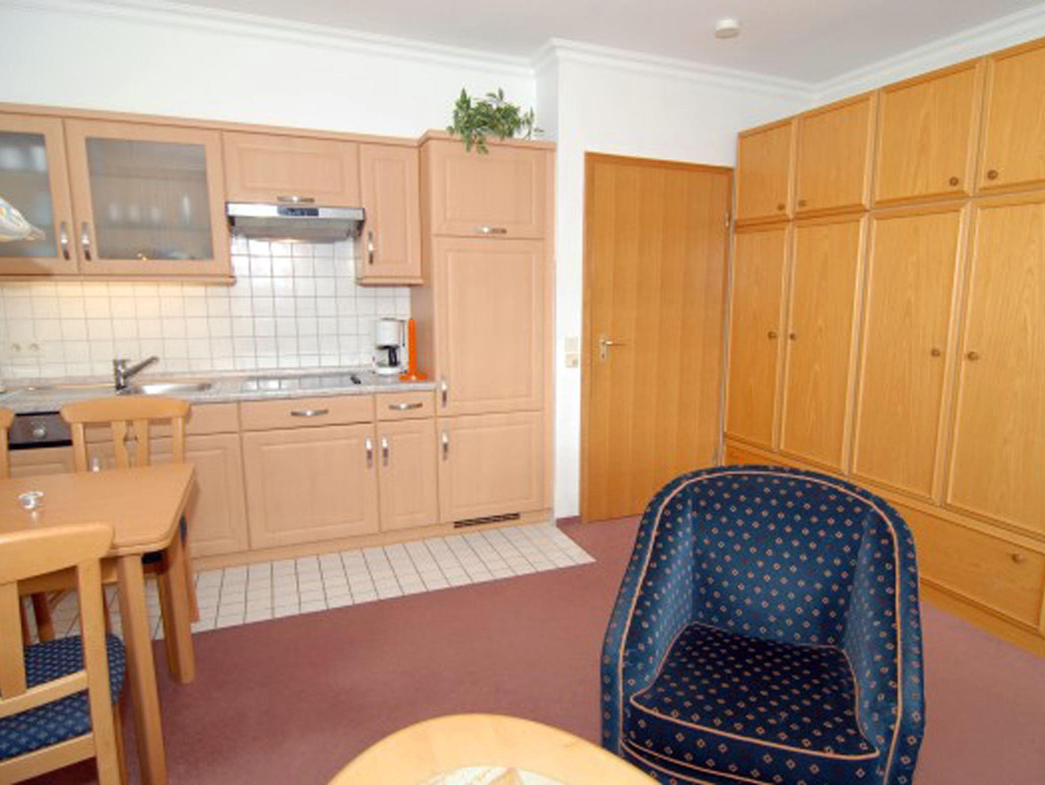 Wohnzimmer: Couch, Couchtisch, Stehlampe, Nachtspeicherofen, 2 Einzelschrankbetten, Kleiderschrank, Regalschrank, TV-Schrank, Kabel-TV, Kofferradio mit CD-Player, Esstisch, 4 Stühle, Küchenzeile, 4 Plattenherd mit Ceranfeld, Dunstabzugshaube, Kühlschrank, Spülmaschine, Kaffeemaschine, Wasserkocher, Toaster, Geschirr, Kochtöpfe