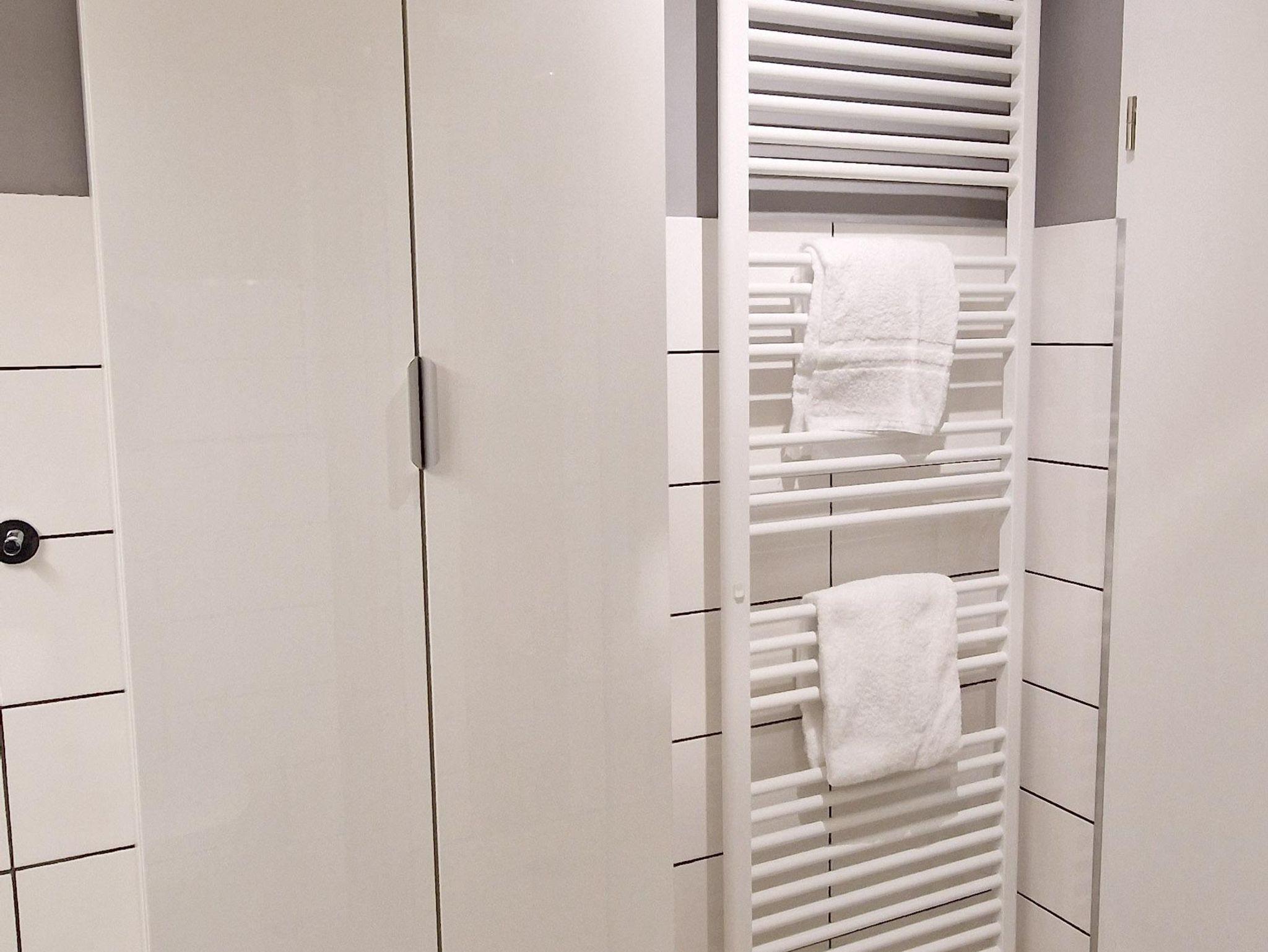 Bad: Dusche befahrbar, Waschbecken, WC, Schrank, Hocker, Staubsauger