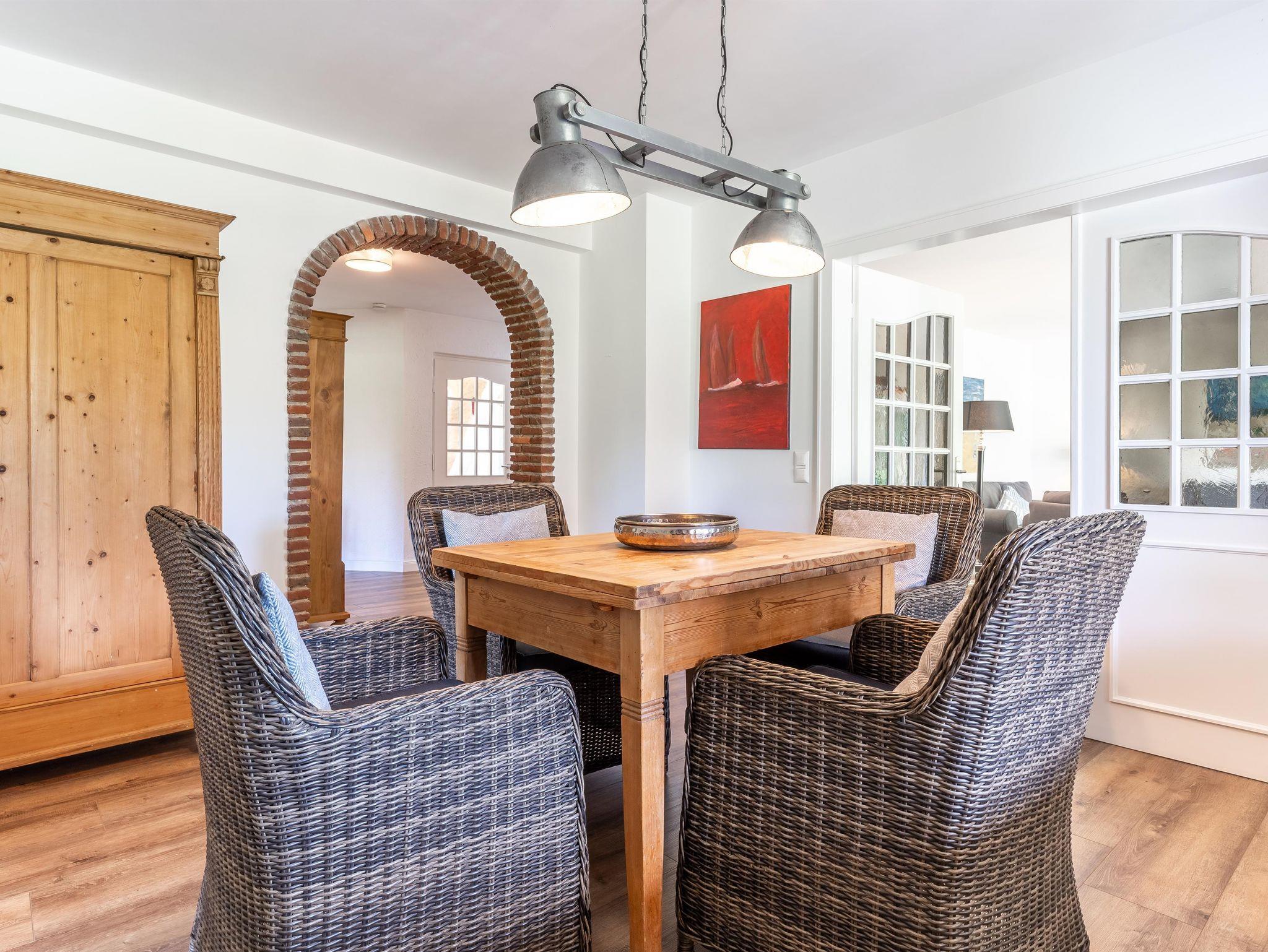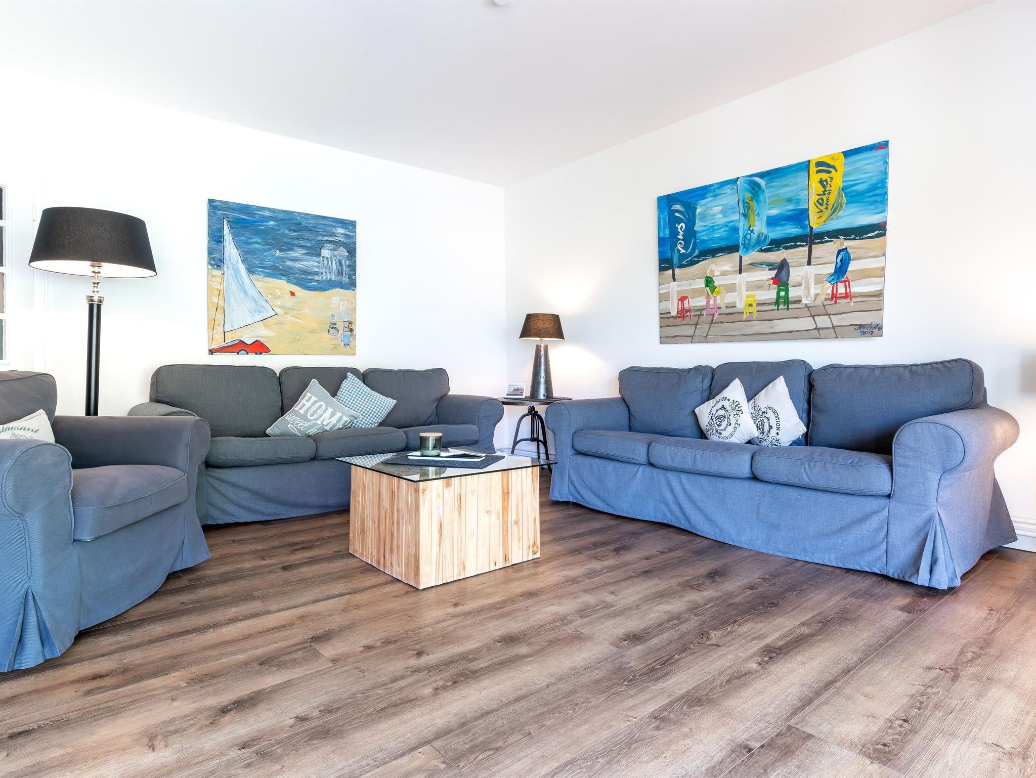 Die Wohnung verfügt über eine voll eingerichtete Küche mit Geschirrspüler, Mikrowelle, Herd, Backofen, Kühlschrank und Eisschrank. Die gemütliche Wohnung bietet für 4 Personen Platz. Die Schlafzimmer sind klassisch mit einem Ehebett und zwei Einzelbetten sowie alten Bauernschränken möbliert. Selbstgemalte Bilder runden die individuelle Einrichtung ab. Das Bad hat eine Badewanne mit Duschvorrichtung. Vom großem Wohnzimmer mit aufschiebbaren Fensterelementen blickt man auf eine kleine Düne und erreicht ebenfalls die Terrasse. An kühlen Tagen kann der Kaminofen beheizt werden.