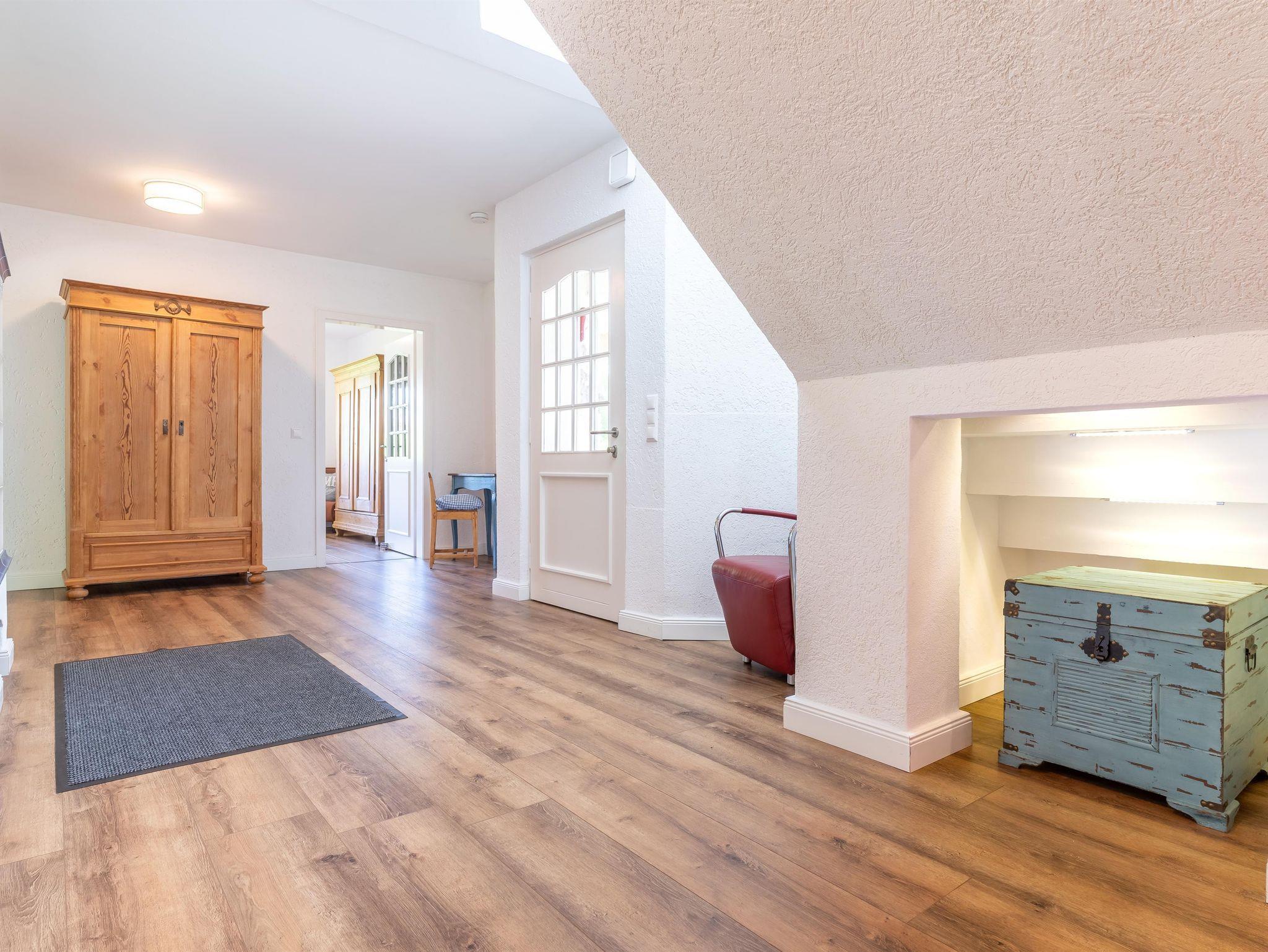 Die Wohnung ist mit hellem hochwertigen Vinyl ausgelegt und mit antiken Bauernmöbeln neben selbstgemalten Bildern geschmackvoll eingerichtet. Durch die Gauben erhält das Appartment einen gemütlichen Charakter. Ein kleiner Teepavillon im Garten lädt zum Verweilen oder Sonnen ein.