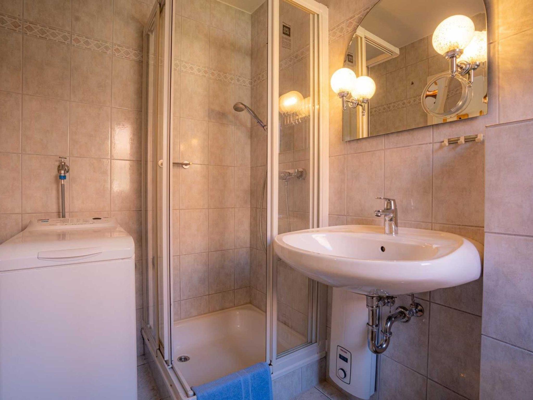 Badezimmer (Duschbad) mit Dusche, WC, Waschmaschine und Tageslicht.