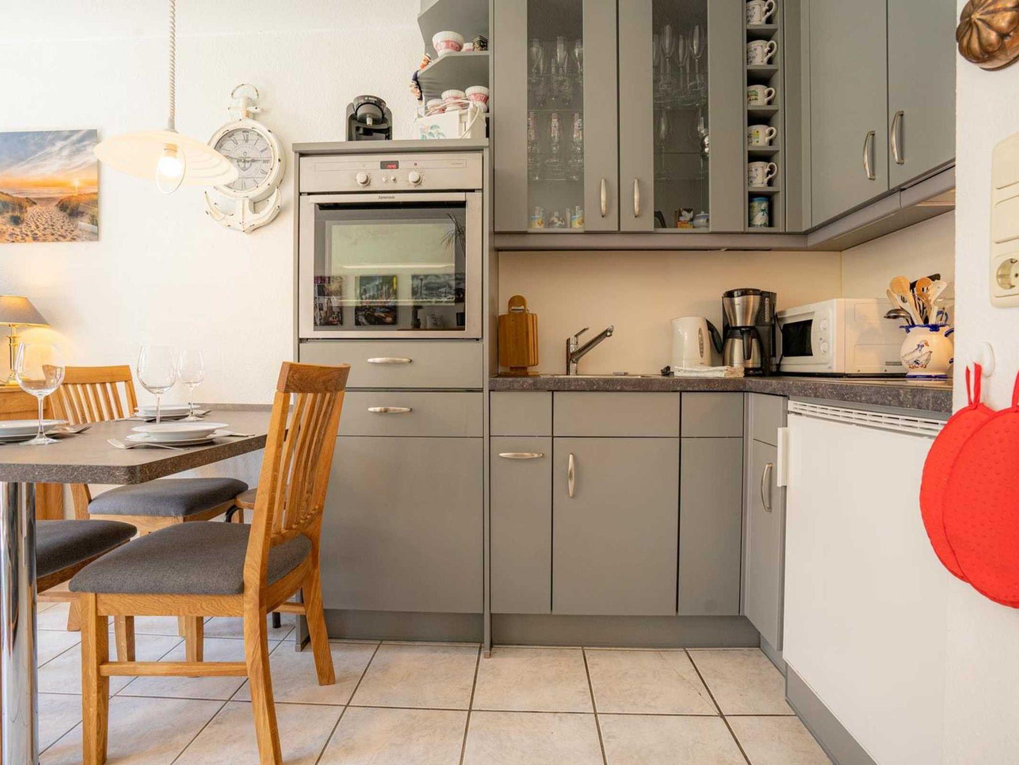 Wohnzimmer mit 2 Sofas (2er, 3er), TV (Kabel), Bluetooth-Soundsystem mit CD-Player und Esstisch für 4 Personen. Offene Küche zum Wohnzimmer mit Backofen, Mikrowelle, Geschirrspüler und Kühlschrank mit Eisfach. Direkter Zugang zur möblierten Süd-Terrasse mit Markise (Handkurbel).