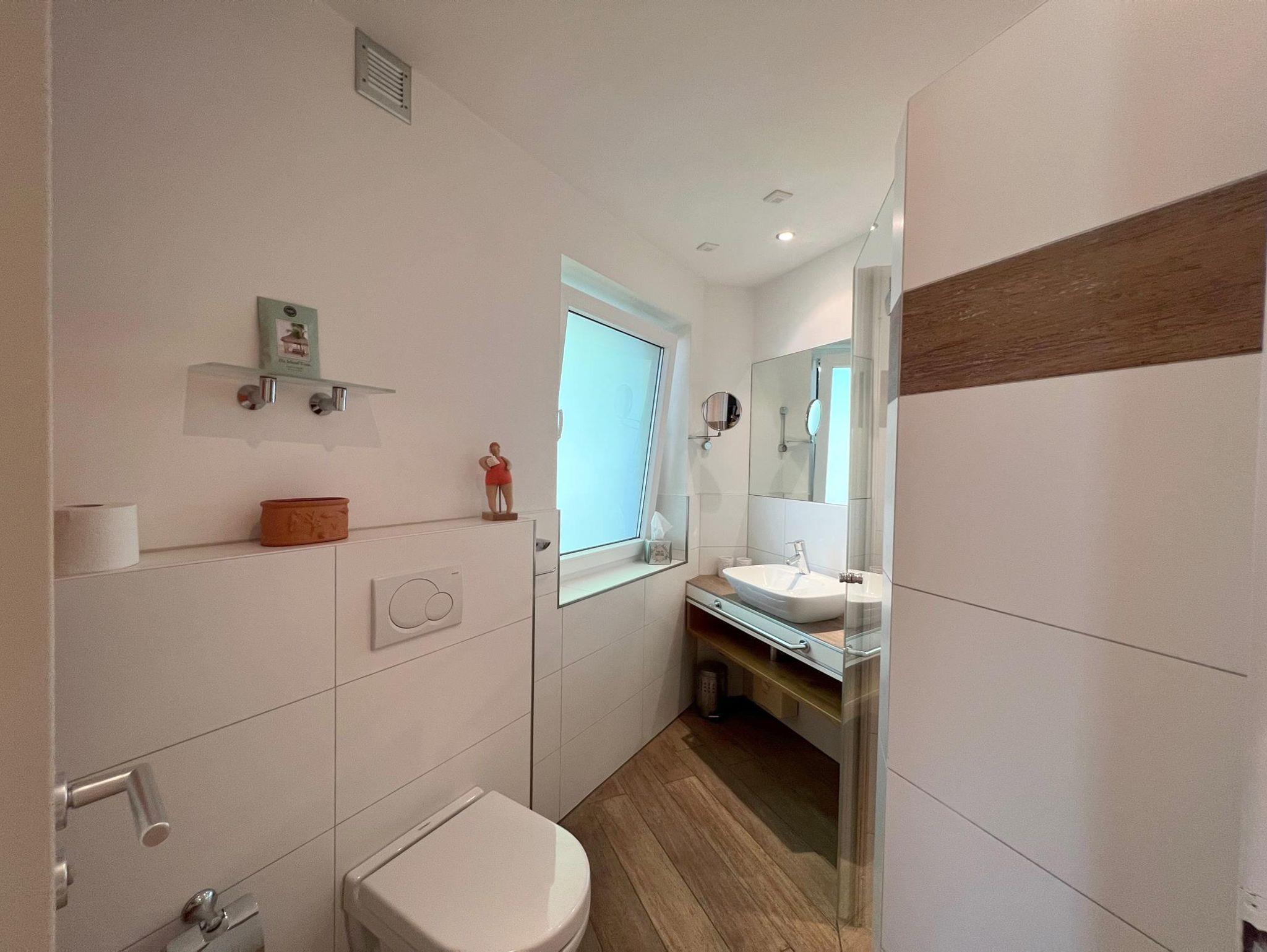 Bad:Dusche bodengleich, große Duschkabine, Waschtisch, WC, Kosmetikspiegel, Spiegel, Einbauradio, moderne E-Heizung