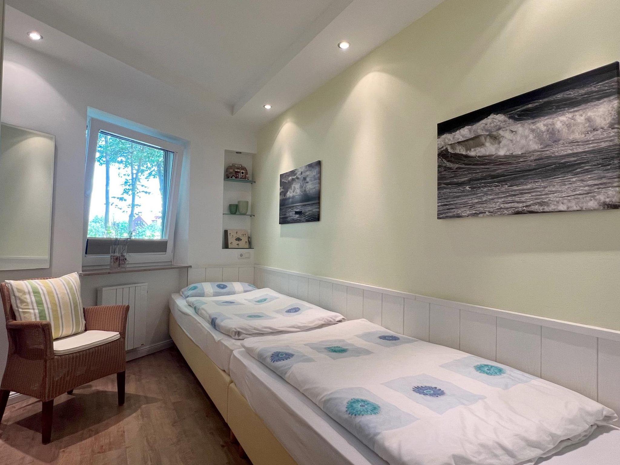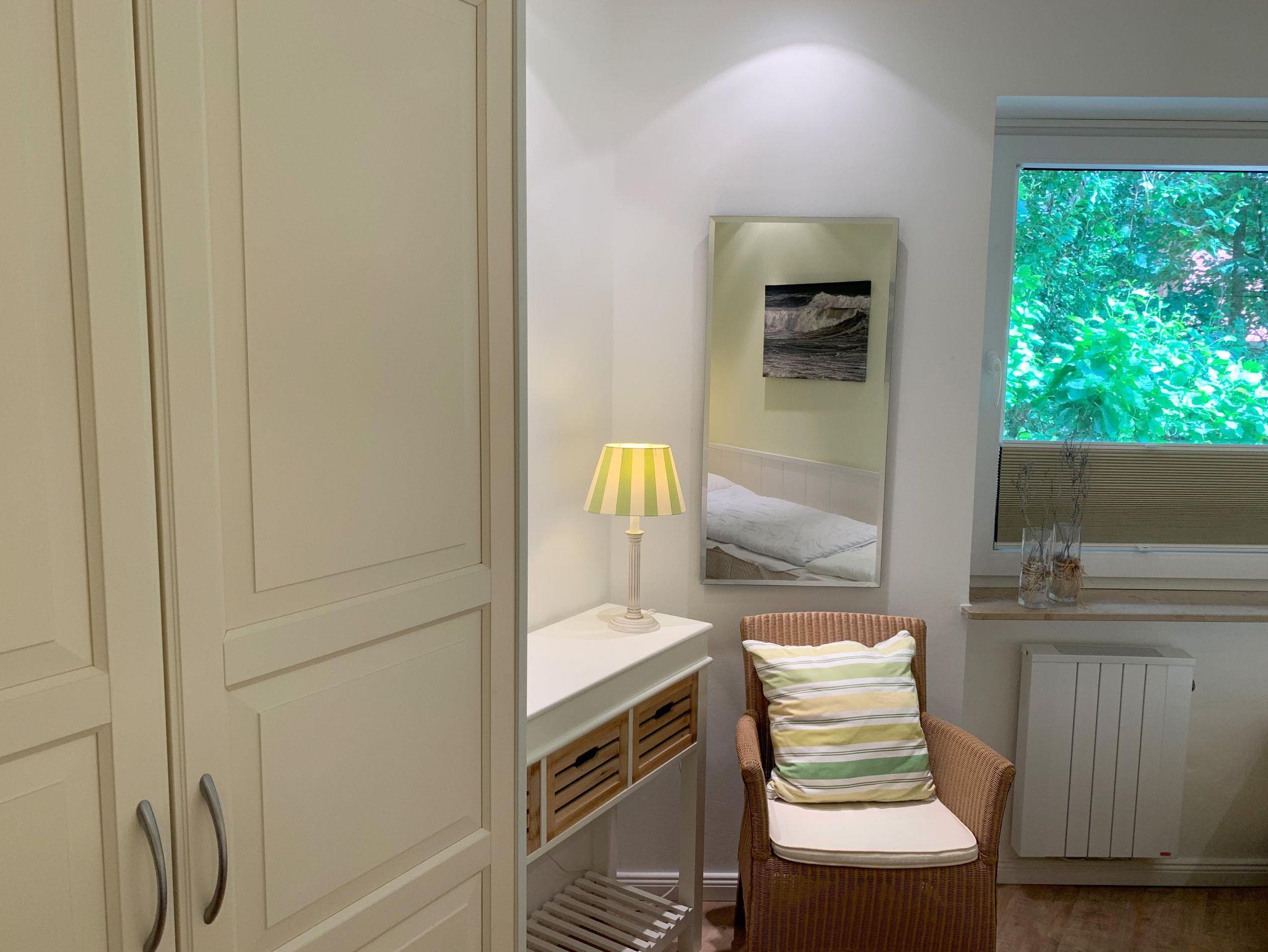 Schlafzimmer:2 Einzelbetten, Kleiderschrank, Konsolentisch, Rattansessel, Spiegel, moderne E-Heizung