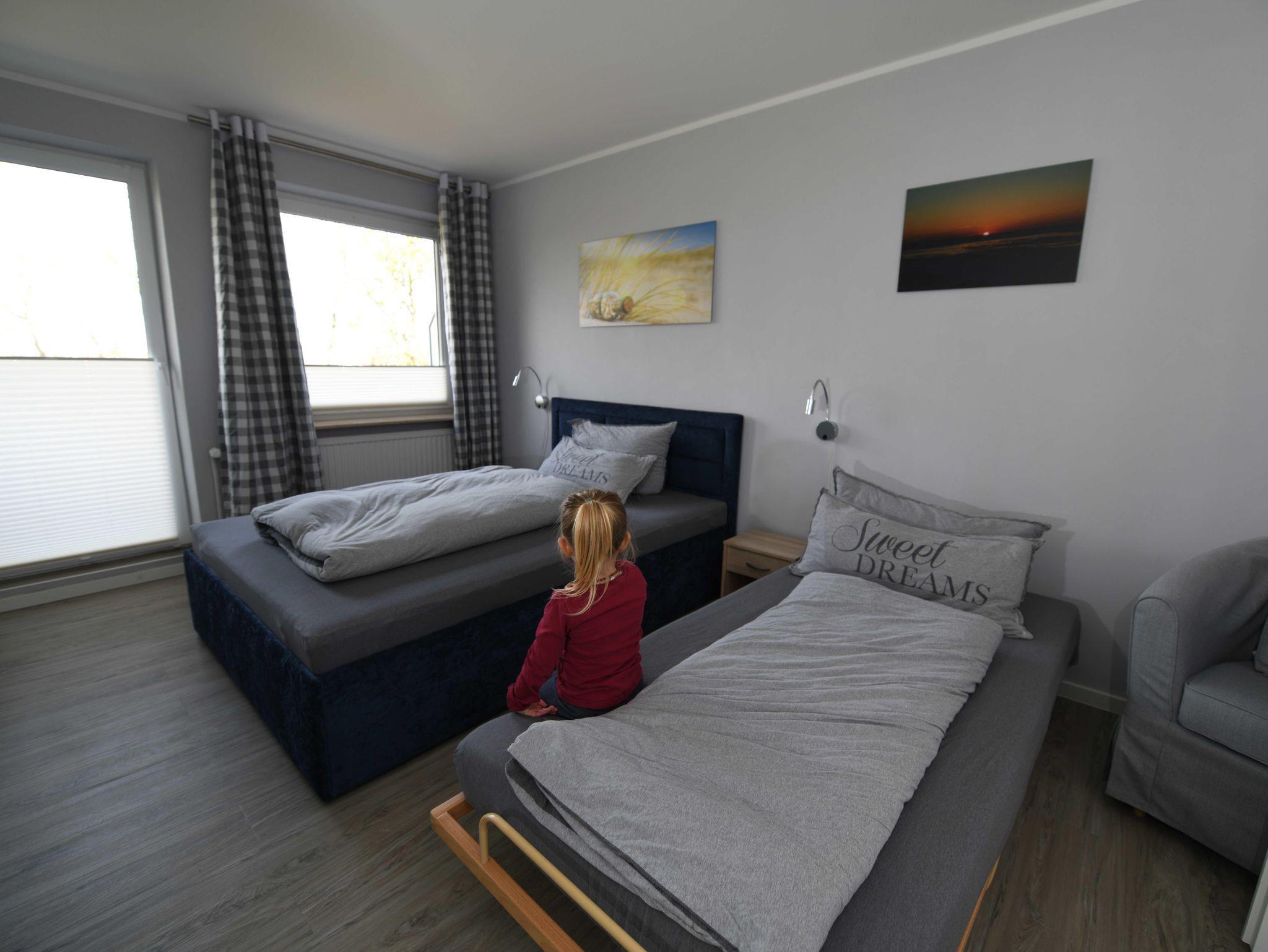 - 1x Schlafzimmer (1x Einzelbett 1,40 m und 1x Einzelbett 1,00 m) mit Duschbad (innenliegend) und Balkon (Westseite)