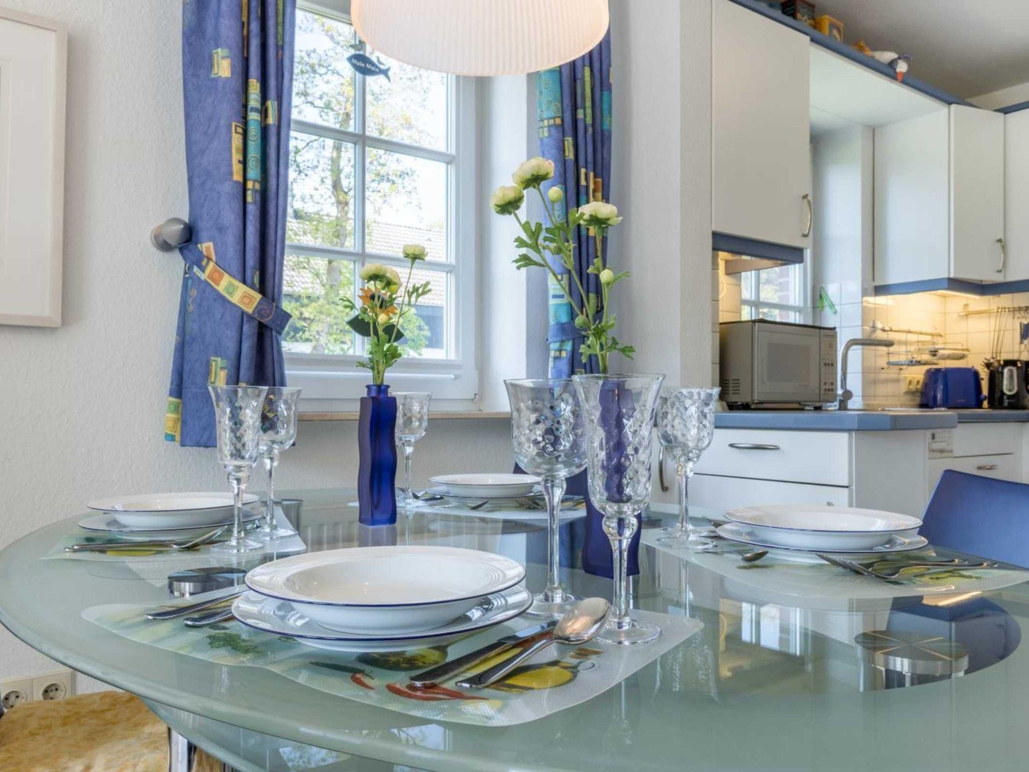 Wohnzimmer mit Sofa, 2 Sesseln, TV (Kabel), DVD-Player, Stereo-Kompaktanlage mit CD-Player und Esstisch mit 4 Stühlen. Direkter Zugang zur sonnigen, möblierten Gartenterrasse nach Süd-Westen. Kenner werden sich über das Fliegengitter in der Terrassentür freuen. Offene Küche mit Backofen, Mikrowelle, Geschirrspüler, Kühlschrank mit Gefrierfach DeLonghi Nespresso Kapsel-Kaffeemaschine.