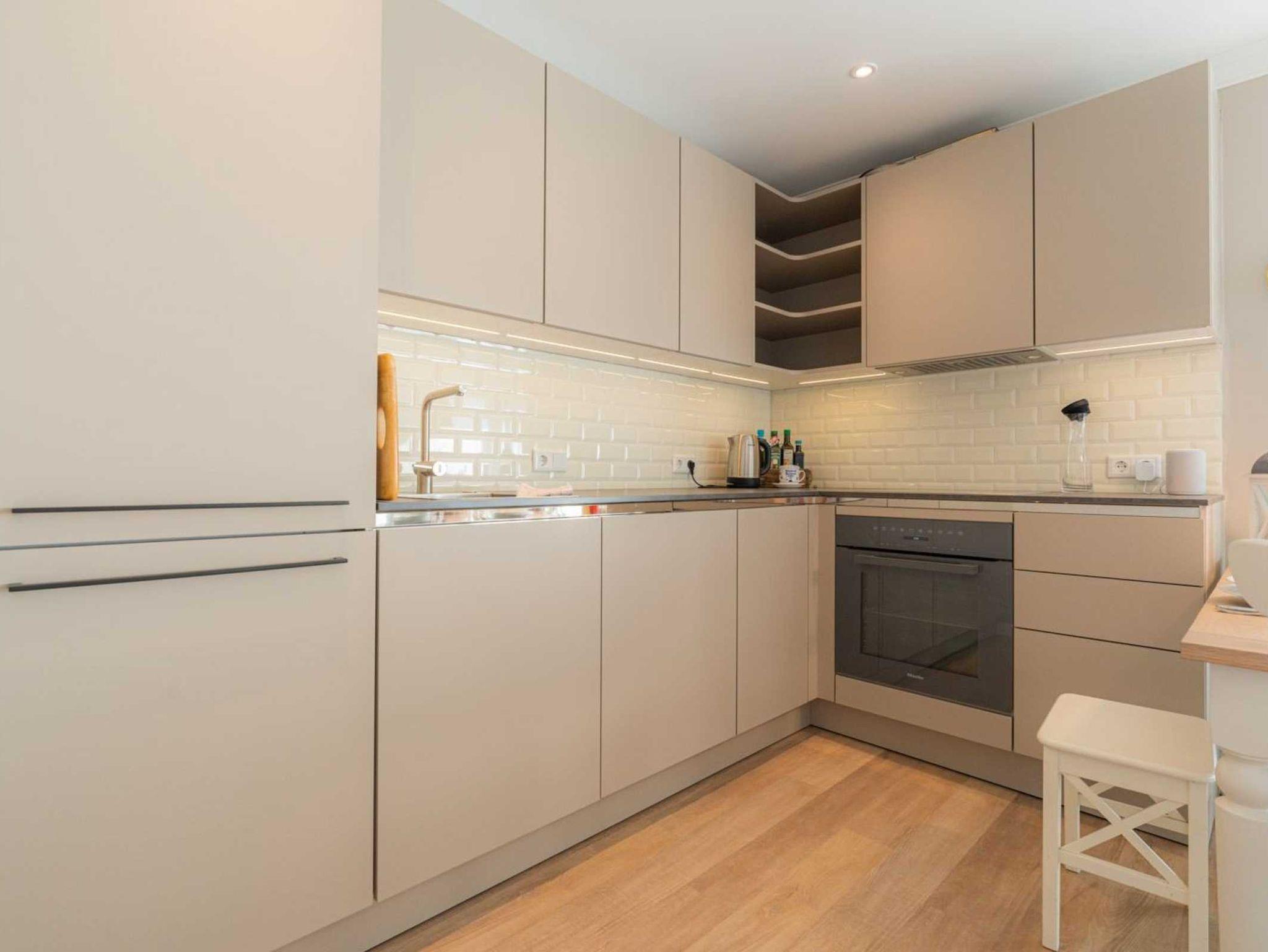 Wohn-/Schlafzimmer mit Doppelbett (2x 100x200cm), großem Ecksofa, SMART-TV mit Sky-Abo (Sat), Alexa-Soundsystem, Kleiderschrank und Esstisch für 4 Personen. Direkter Zugang zum möblierten West-Balkon. Offene Küche mit Induktionsherd, Backofen, Geschirrspüler, Kühl-Gefrier-Kombination, Nespresso DeLonghi Kapsel-Kaffeemaschine und Nestlé SpecialT-Teemaschine.