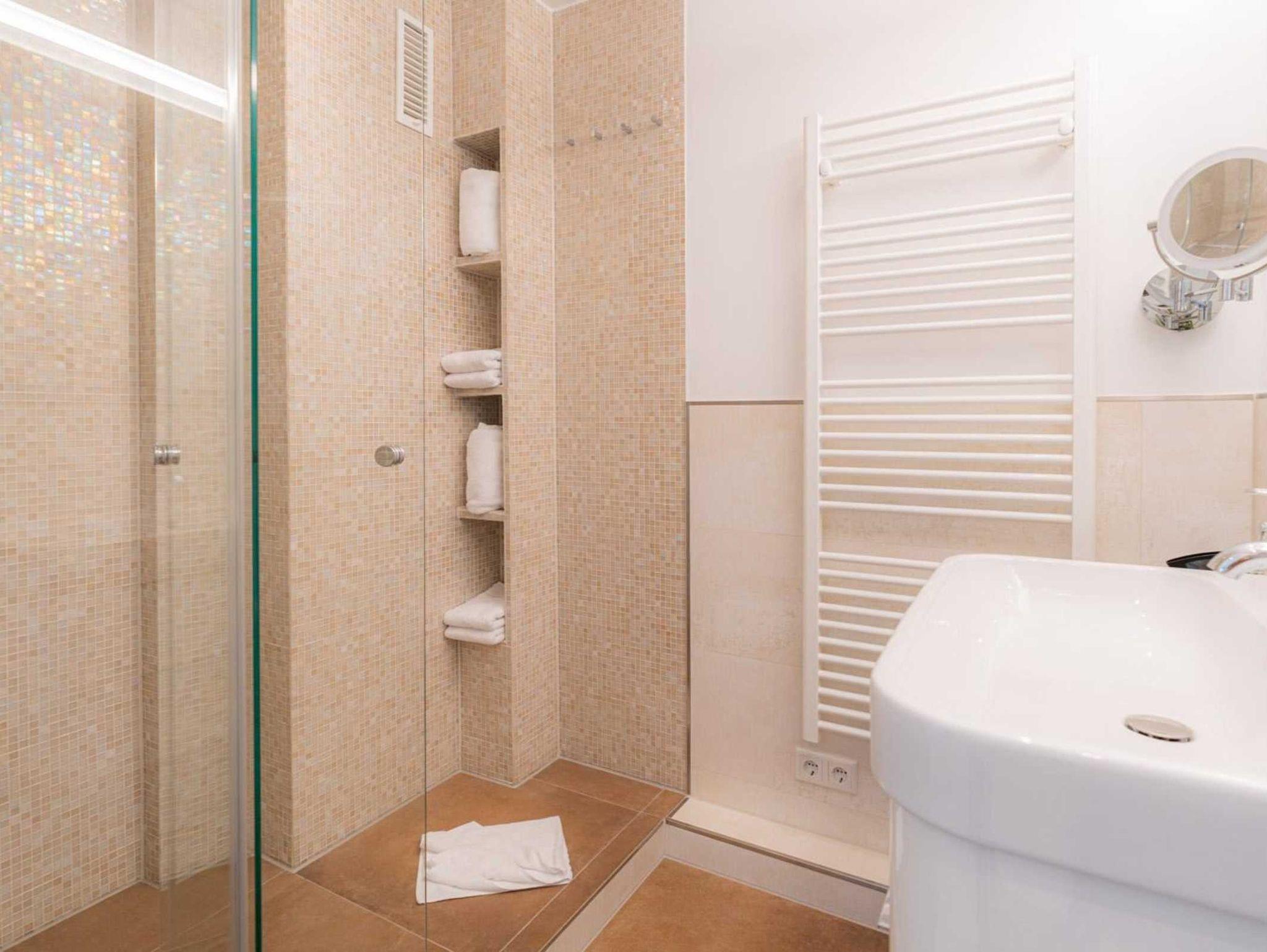 Badezimmer (Duschbad) mit Dusche, WC, Handtuchwärmer, Fußbodenheizung und Föhn.
