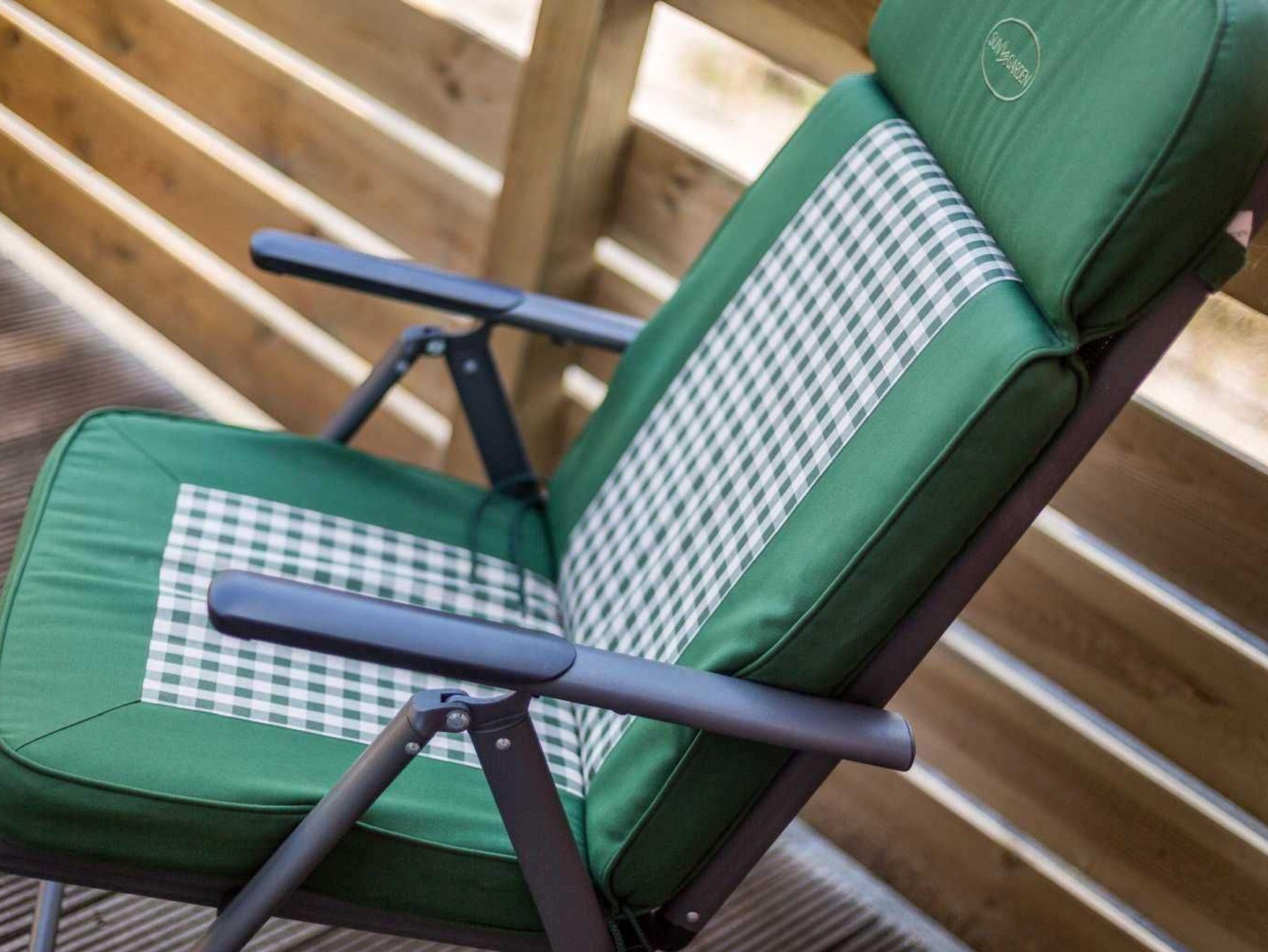 Wohnzimmer mit Sofa (2er), 2 Sesseln, kleinem TV (Kabel) und Esstisch mit 4 Stühlen. Offene Küche mit Herd mit 3 Kochstellen, Mikrowelle, Geschirrspüler und Kühlschrank mit Gefrierfach.