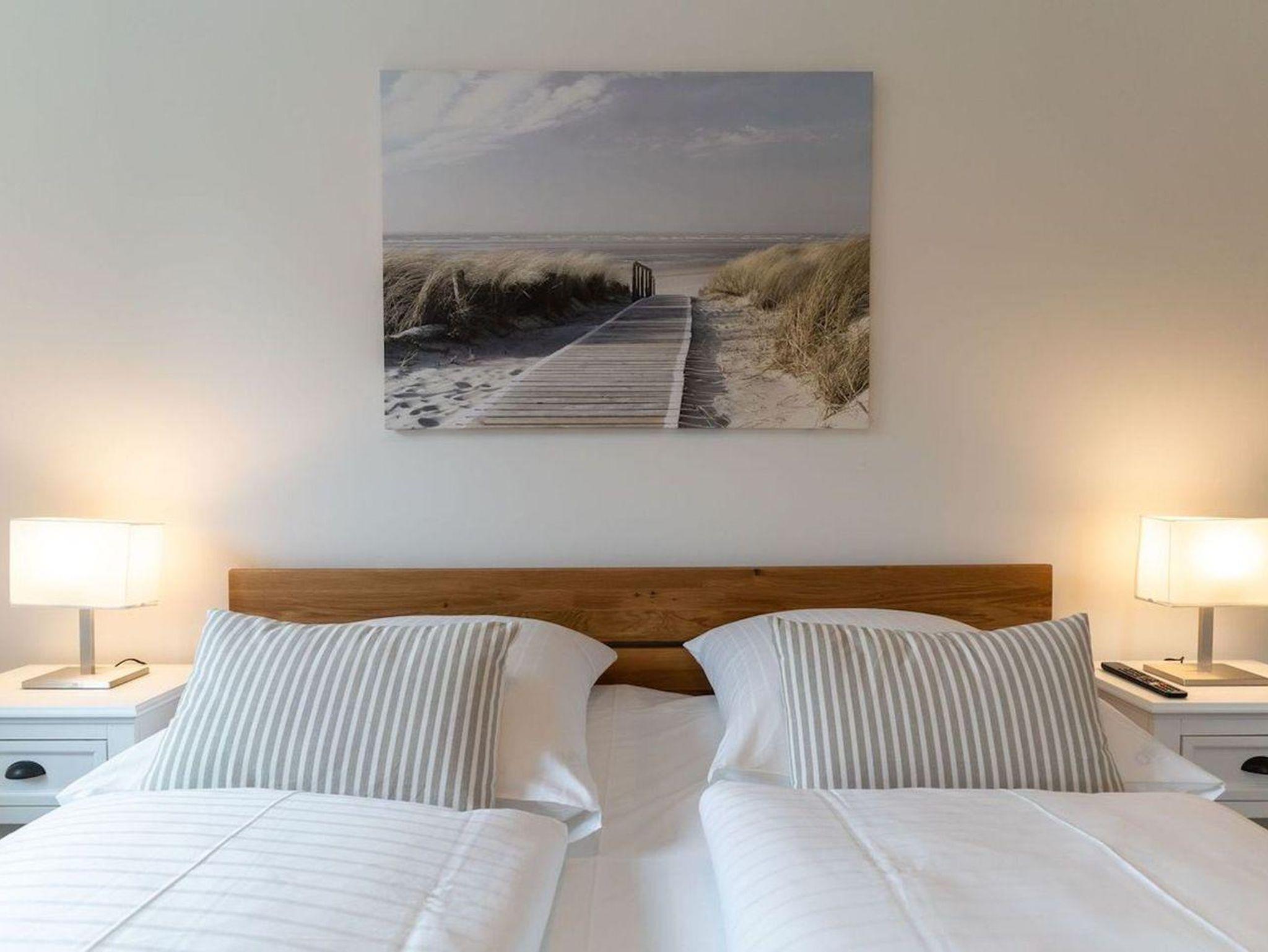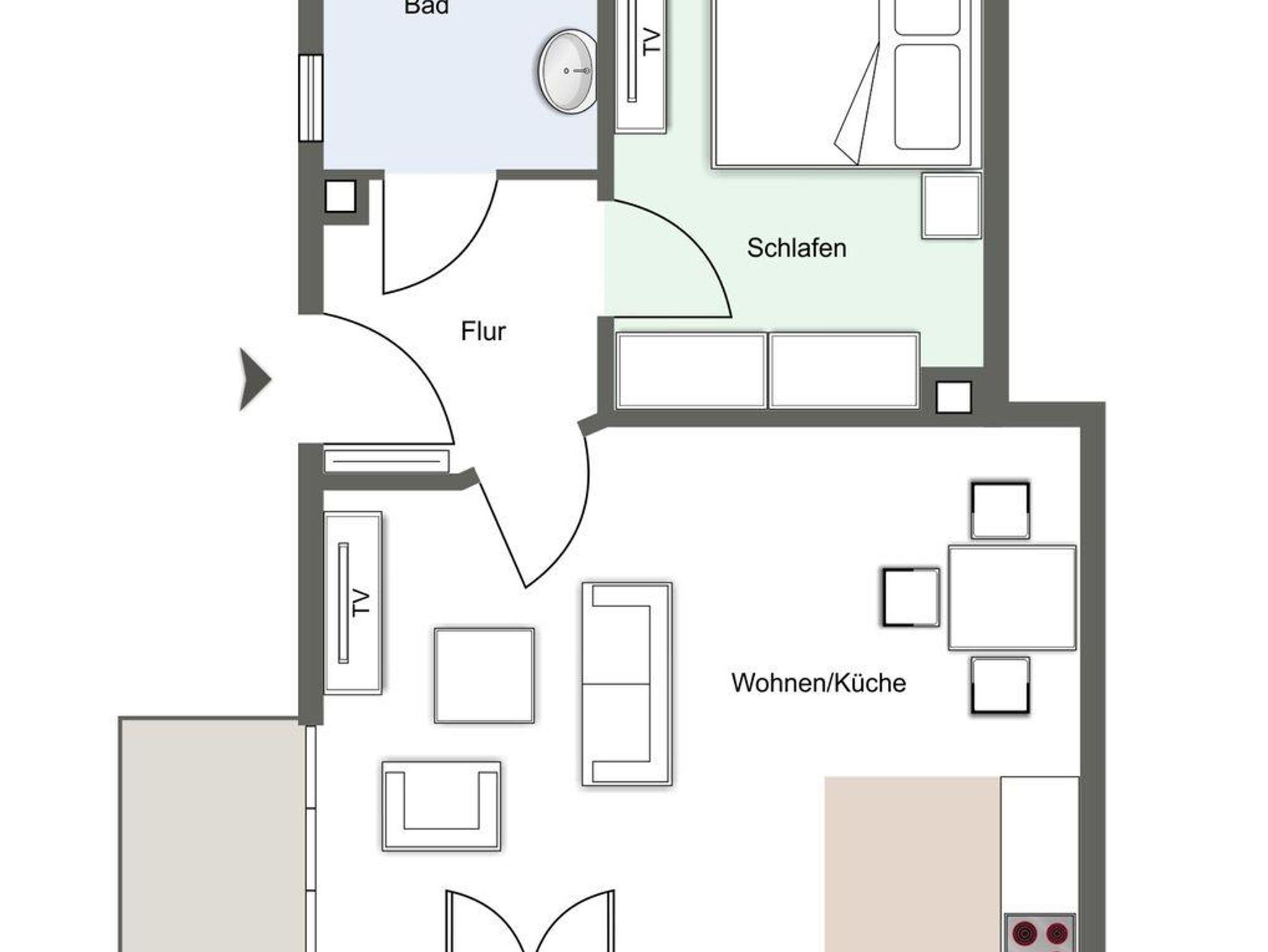 Vom Flur gelangen Sie ins Doppelschlafzimmer mit TV. Zusätzlich gibt es im Wohnzimmer ein gemütliches Schlafsofa für eine Personen. Das Duschbad bietet genügend Platz für Ihre Utensilien.