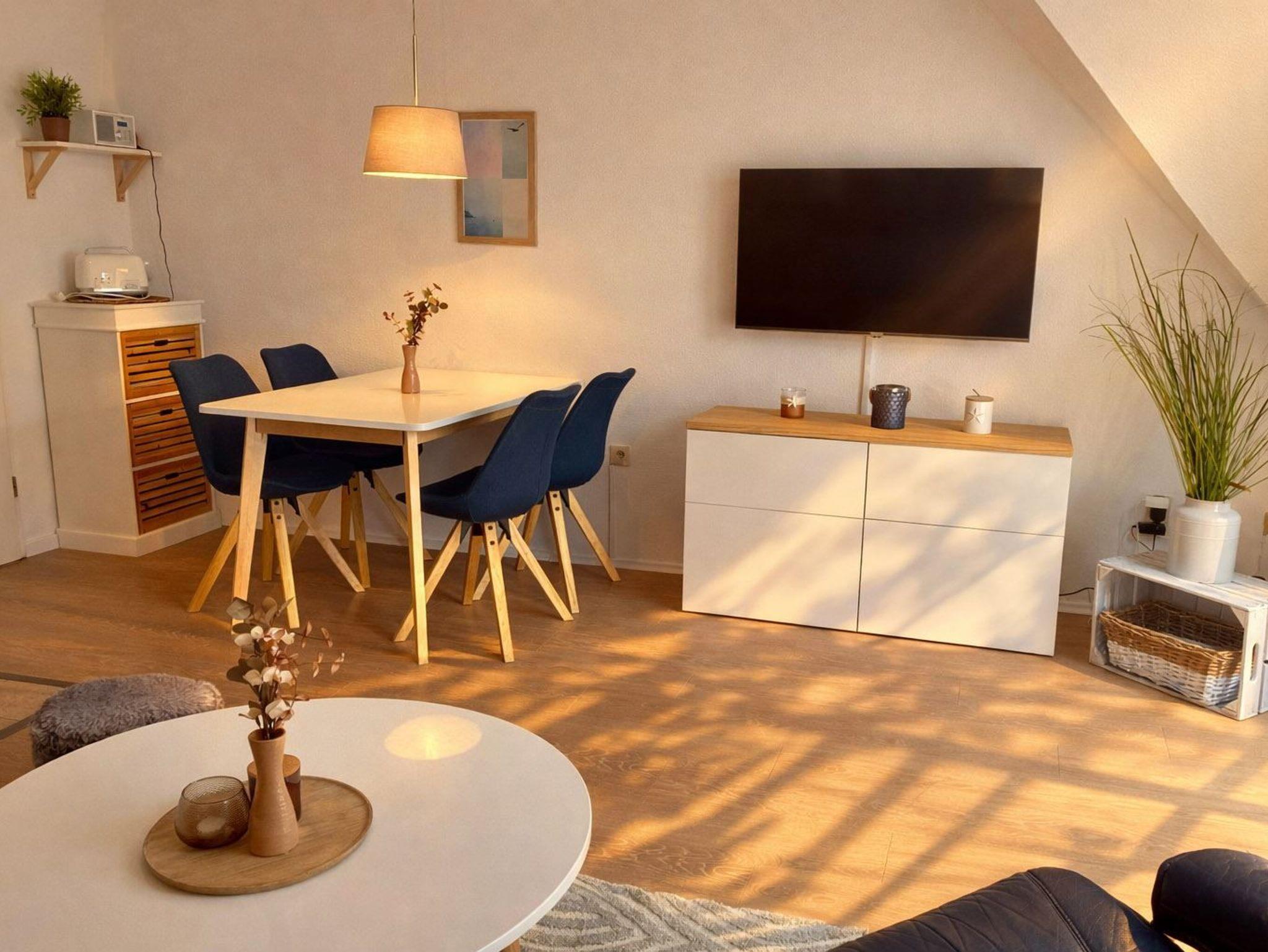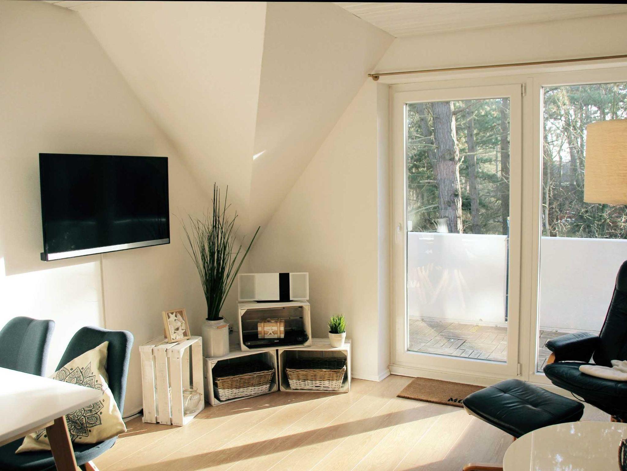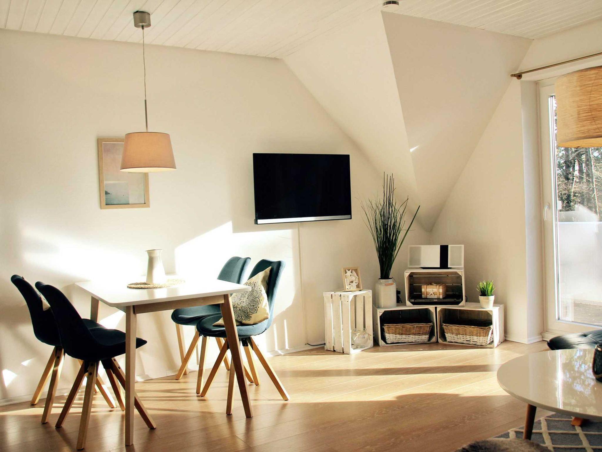 Die nordisch eingerichtete Ferienwohnung verfügt über einen modernen Wohn-/Essbereich, der zu geselligen Abenden einlädt. Der nach Süd-Osten ausgerichtete, großzügige Balkon bietet einen herrlichen Ausblick auf das gegenüberliegende Waldgrundstück und garantiert trotz der zentralen Lage im Herzen des Ortsteils Bad absolute Ruhe.