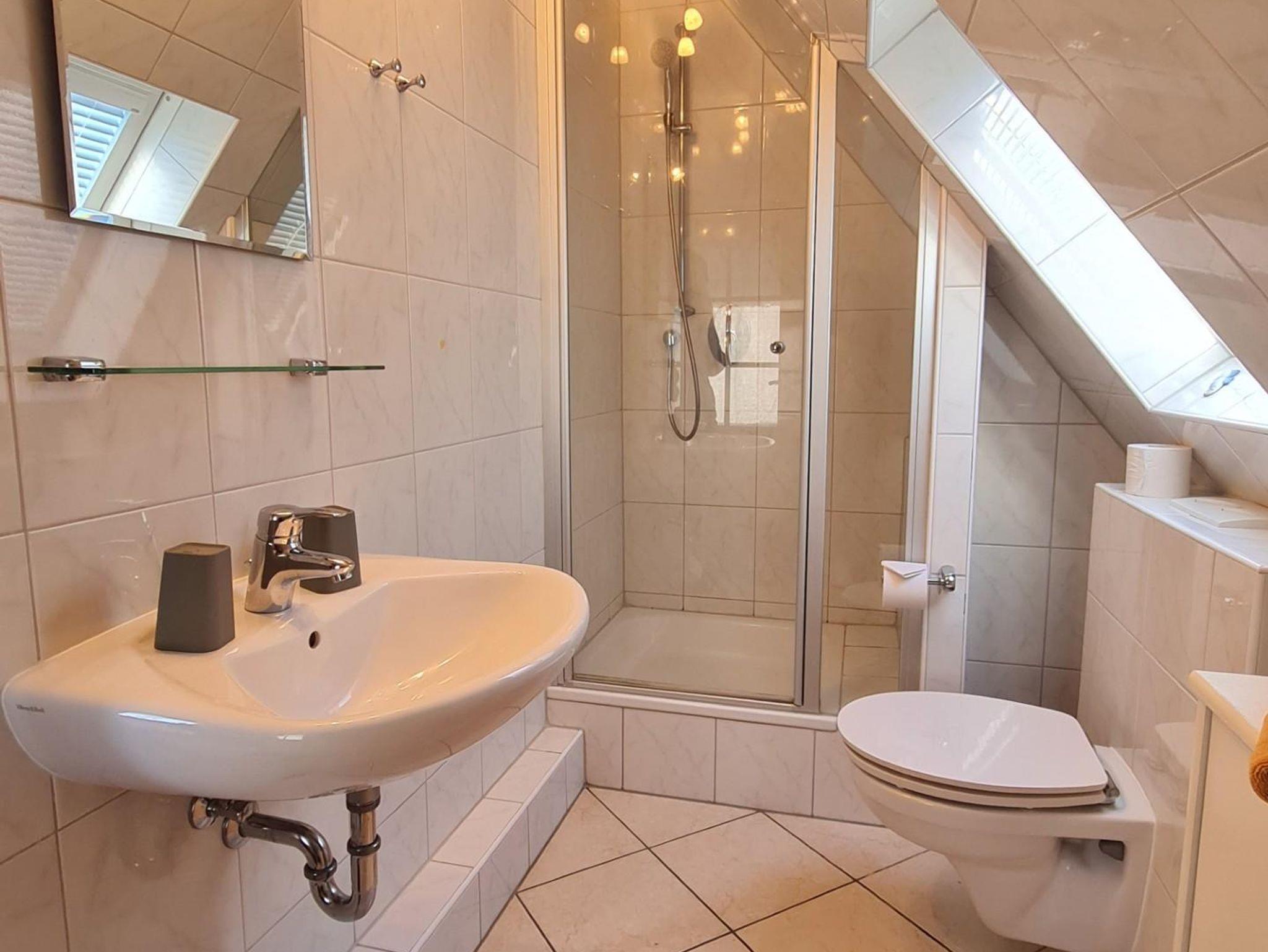• Badezimmer: Modernes Bad mit Dusche und WC.