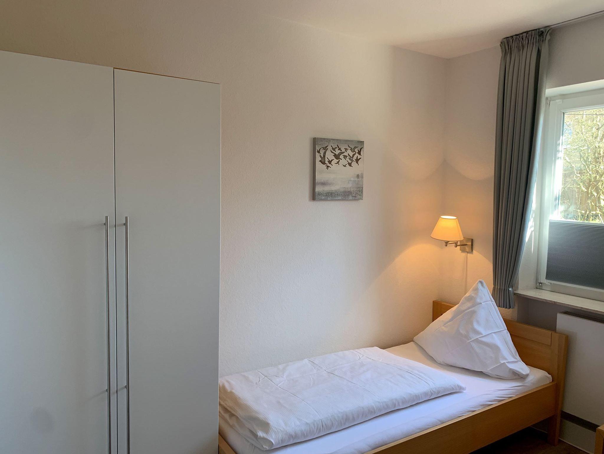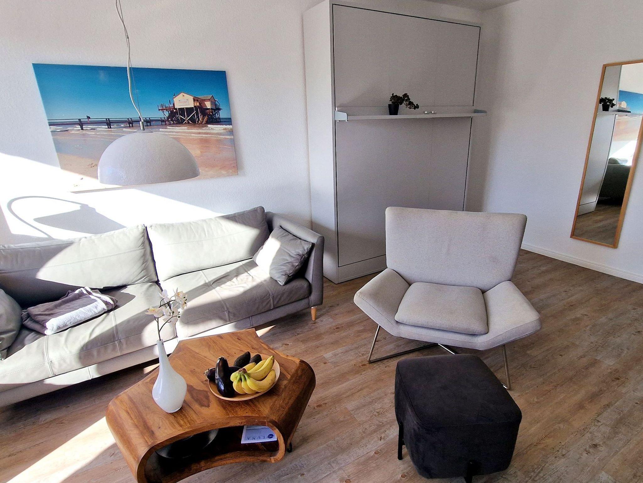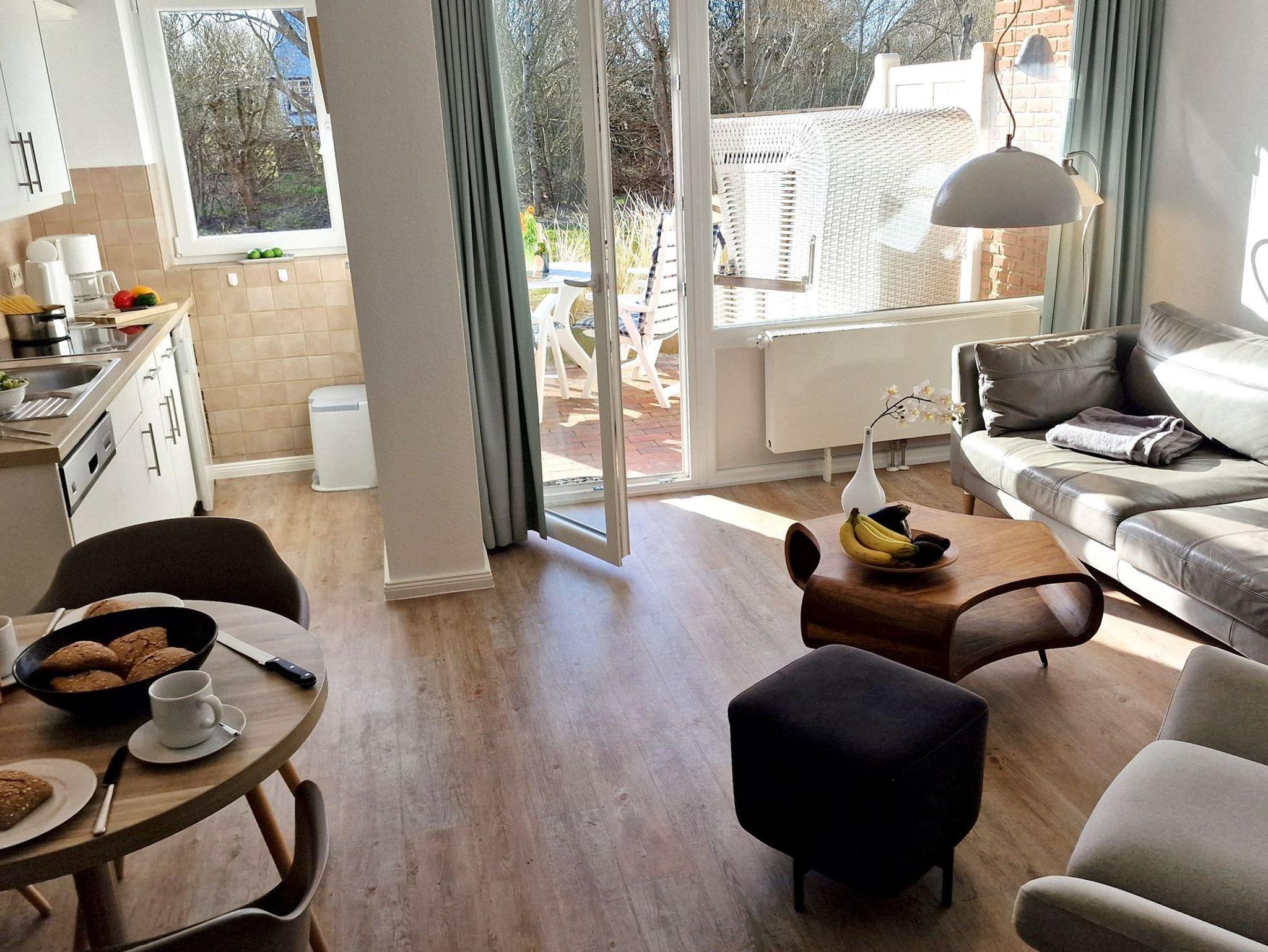 Sie teilt sich wie folgt auf: Eingangsdiele mit Garderobe, Schlafzimmer mit 2 Einzelbetten, Duschbad mit WC. Der großzügige Wohnraum mit direktem Zugang zur Terrasse und Garten überzeugt mit seiner gemütlichen Sitzecke mit direktem Blick nach draußen, moderne, weiße Küche, Essecke und als weitere Schlafmöglichkeit 1 Doppelschrankbett. Die Fußböden der Ferienwohnung sind aus Designerparkett oder Fliesen, Allergikergeeignet.