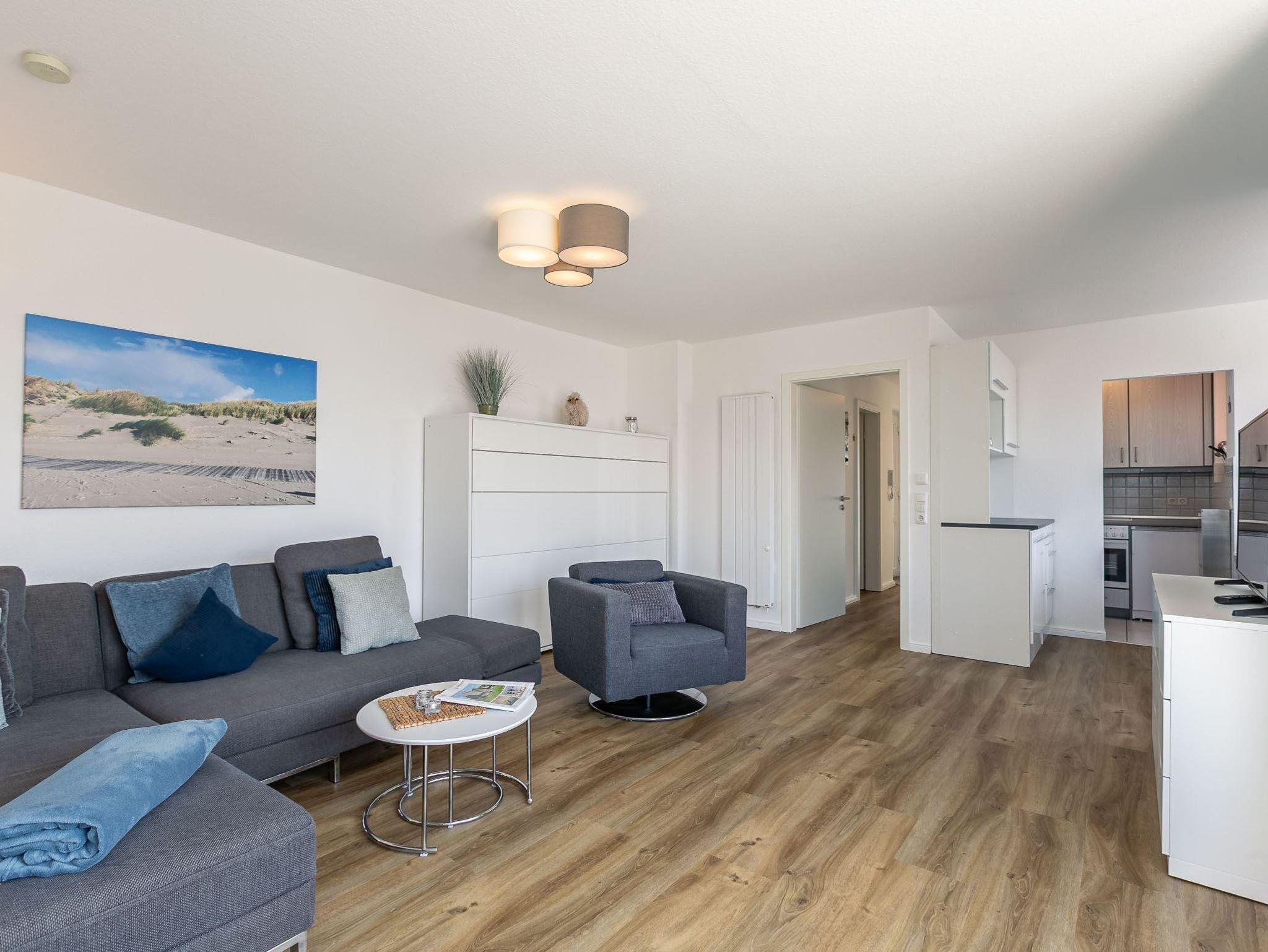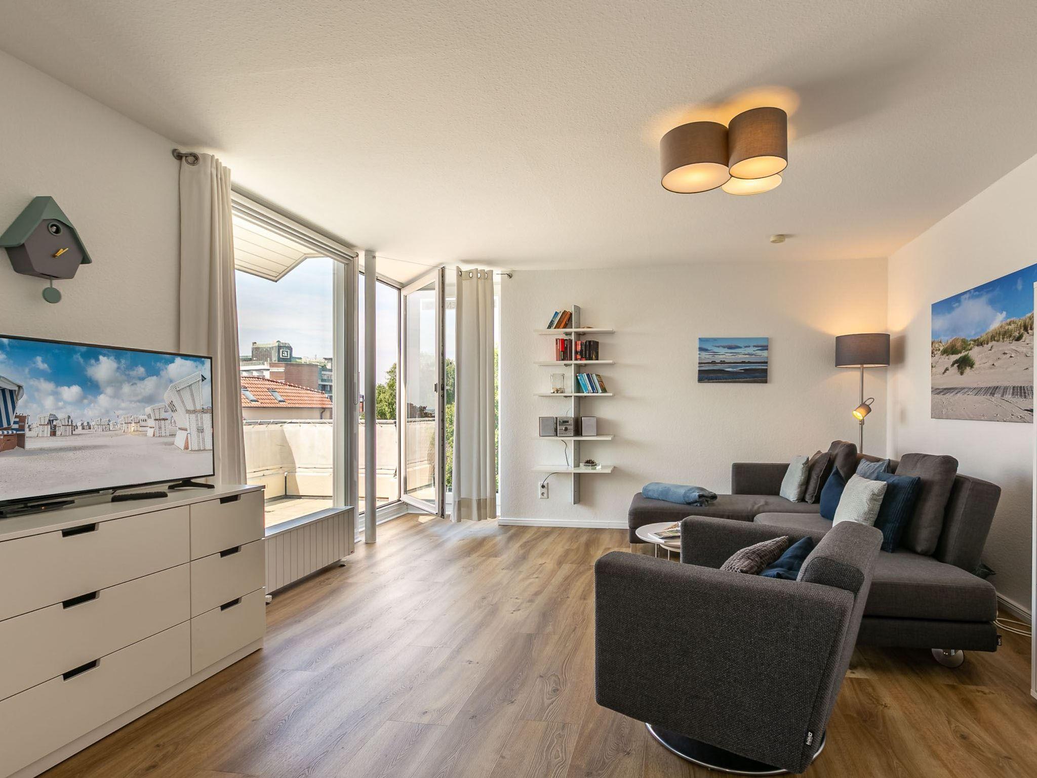 Wohnzimmer mit Ecksofa, Sessel, ausklappbarem Doppelbett (140x195cm), SMART-TV (Kabel) und Hifi-Anlage. Direkter Zugang zum sonnigen, möblierten Eckbalkon nach Südwesten mit herrlichem Ausblick auf die Seebrücke und kleinem Meerblick. Essecke mit Tisch und 4 Stühlen.