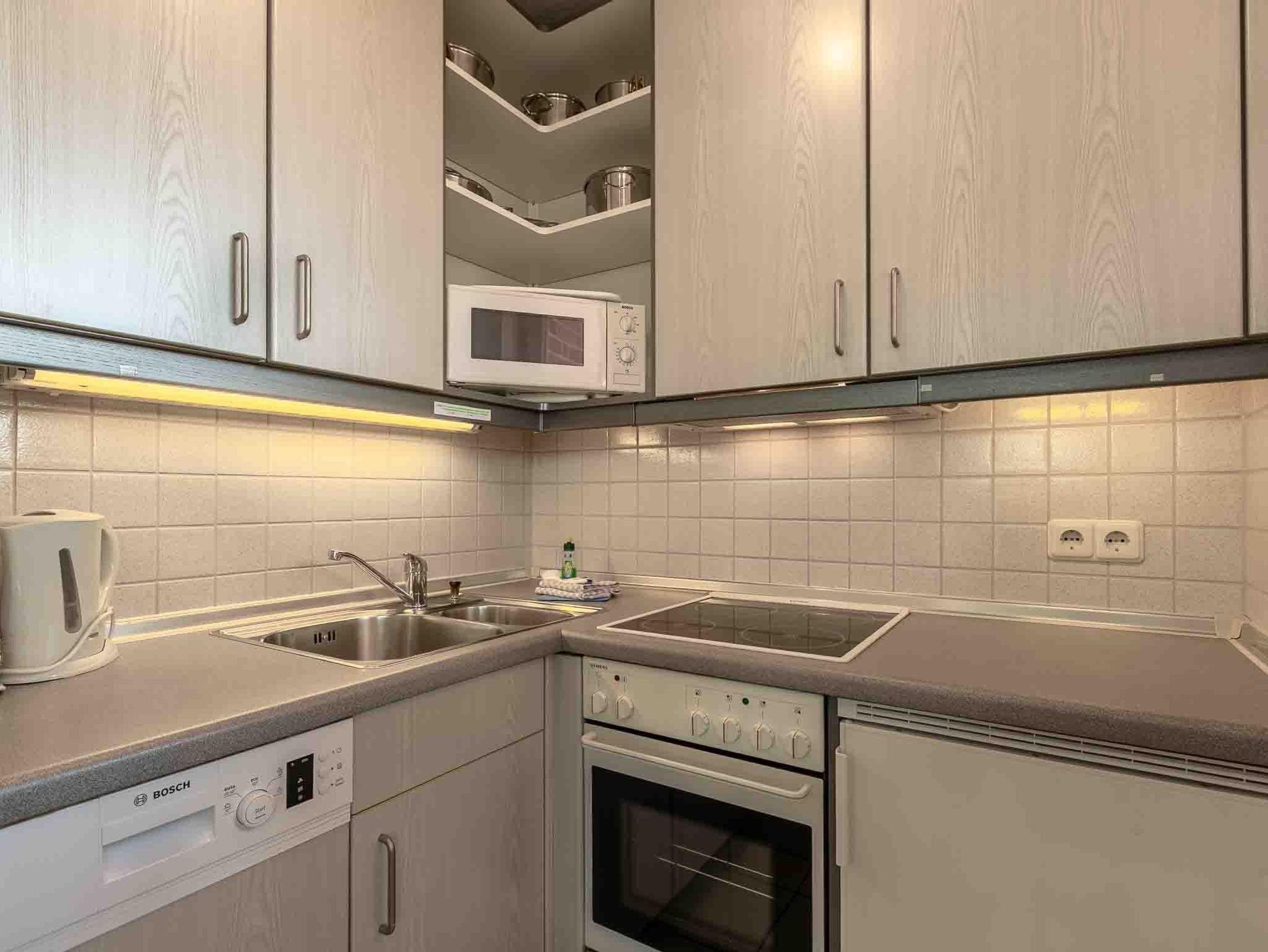Kleine, halboffene Küche mit Backofen, Mikrowelle, Kühlschrank mit Gefrierfach und Geschirrspüler.