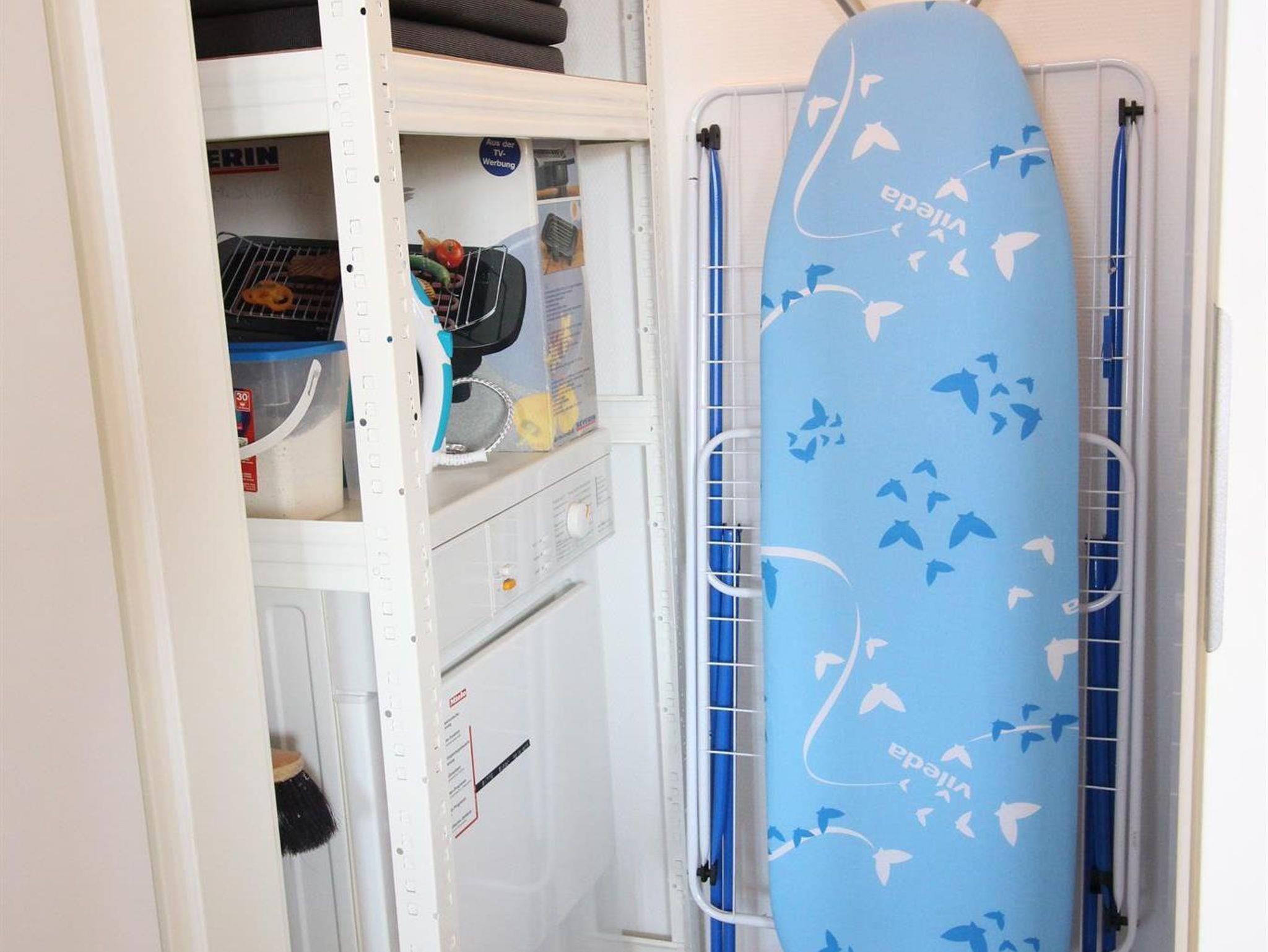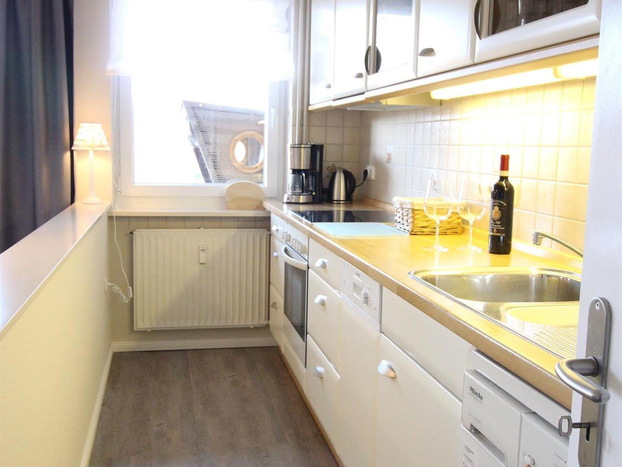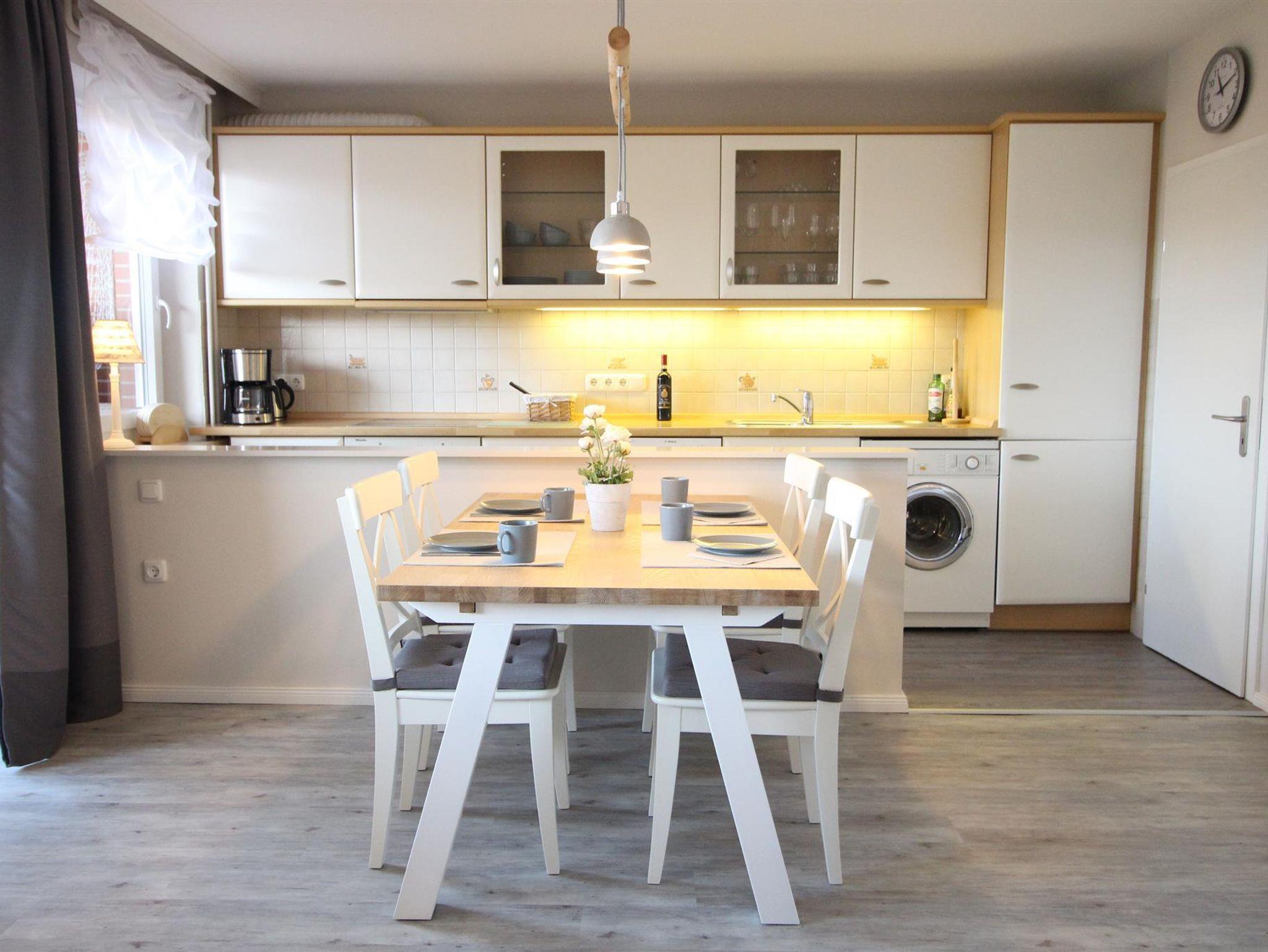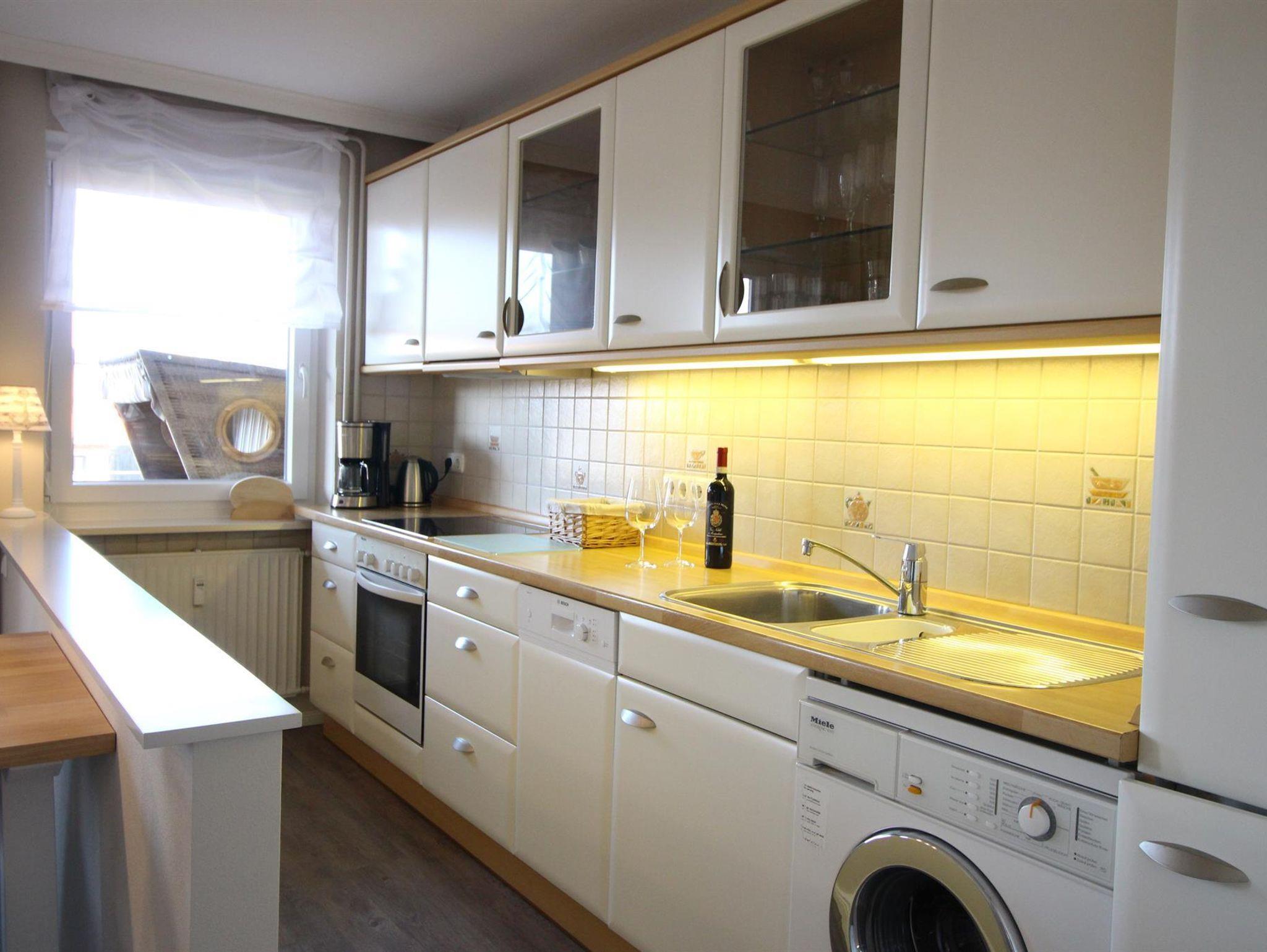 Die Küchenzeile ist mit einer halbhohen Wand vom Wohnraum abgetrennt. Waschmaschine und Trockner sind vorhanden.