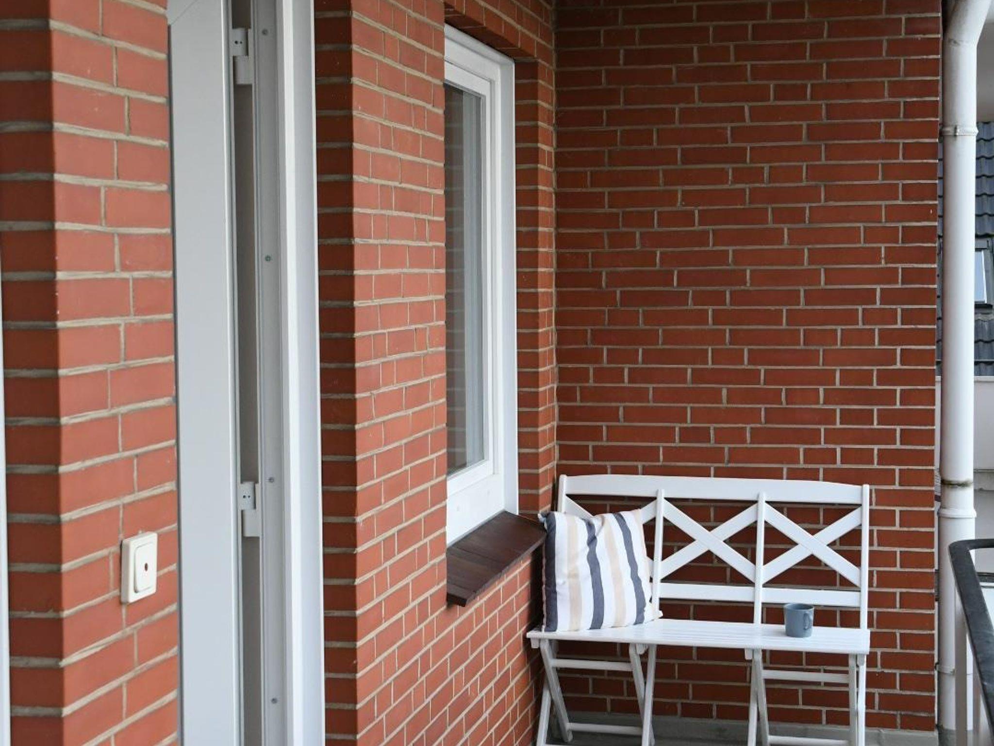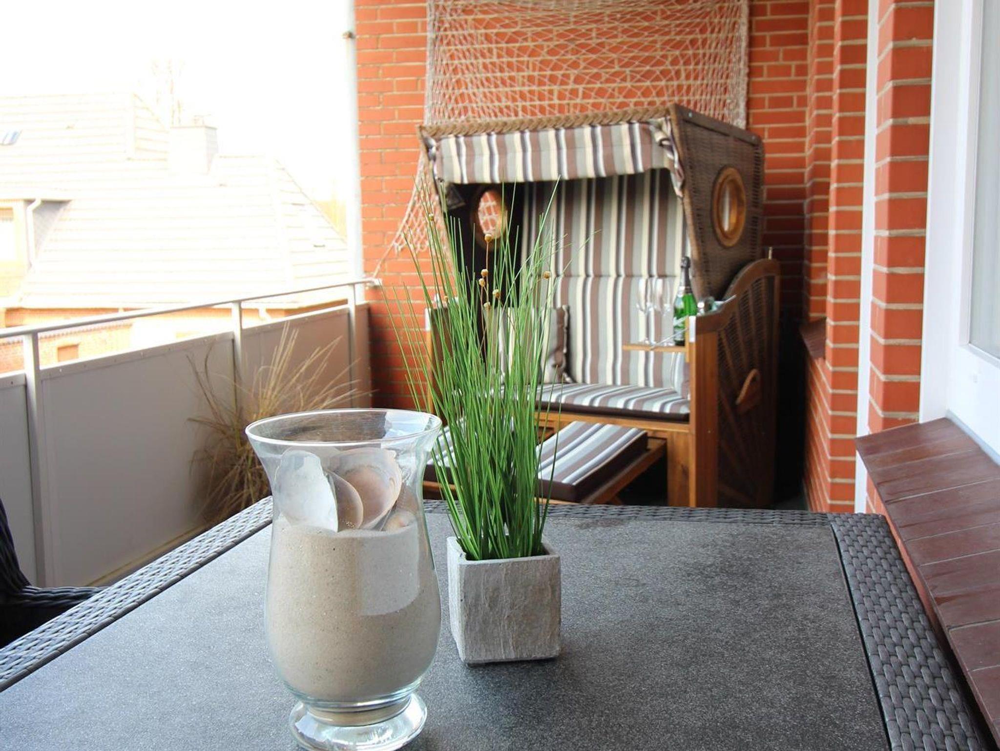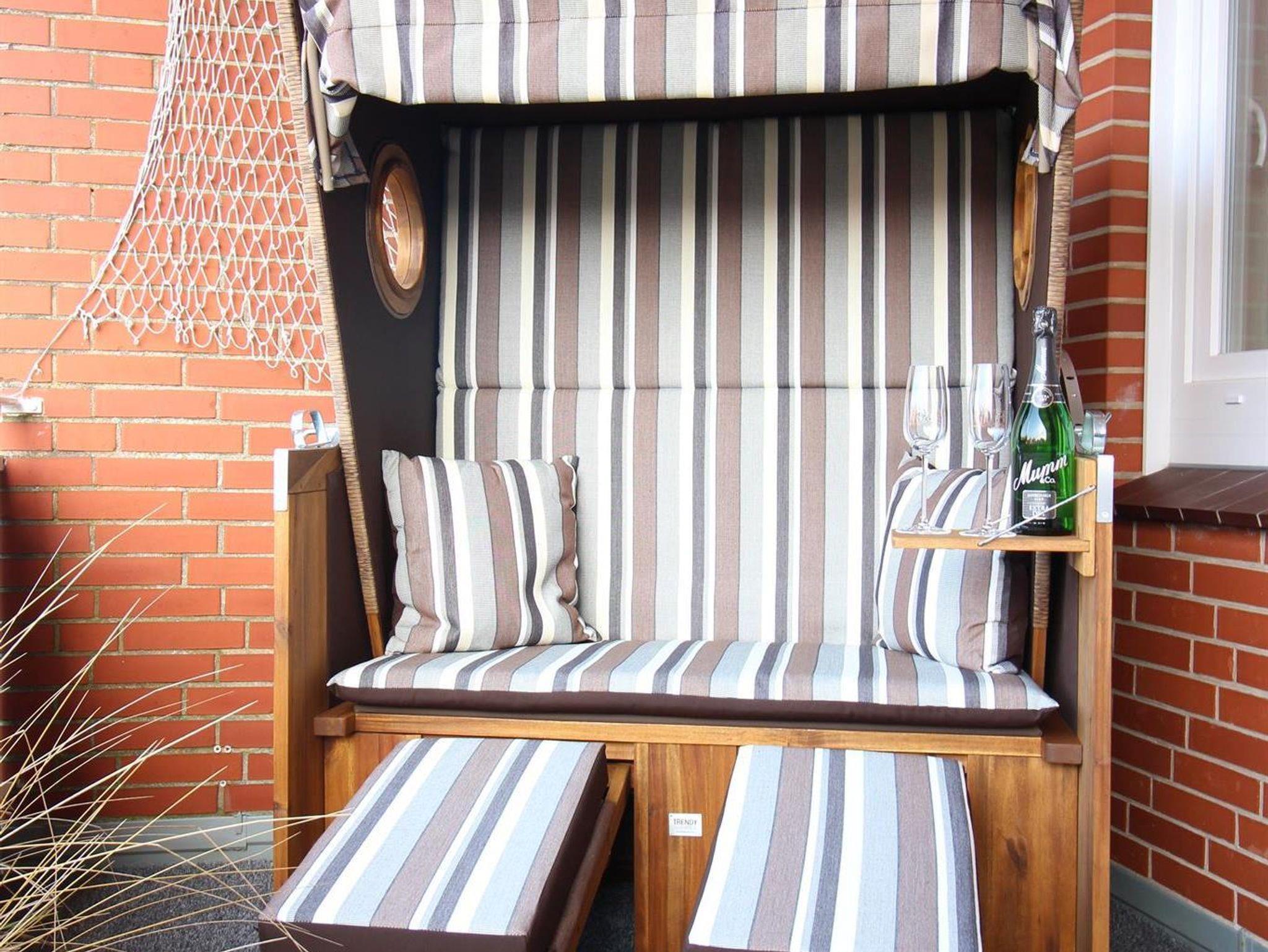 Der große Westbalkon lädt mit Strandkorb und einer Terrassengarnitur auch nach einem erlebnisreichen Urlaubstag zur Entspannung an der frischen Nordseeluft ein.