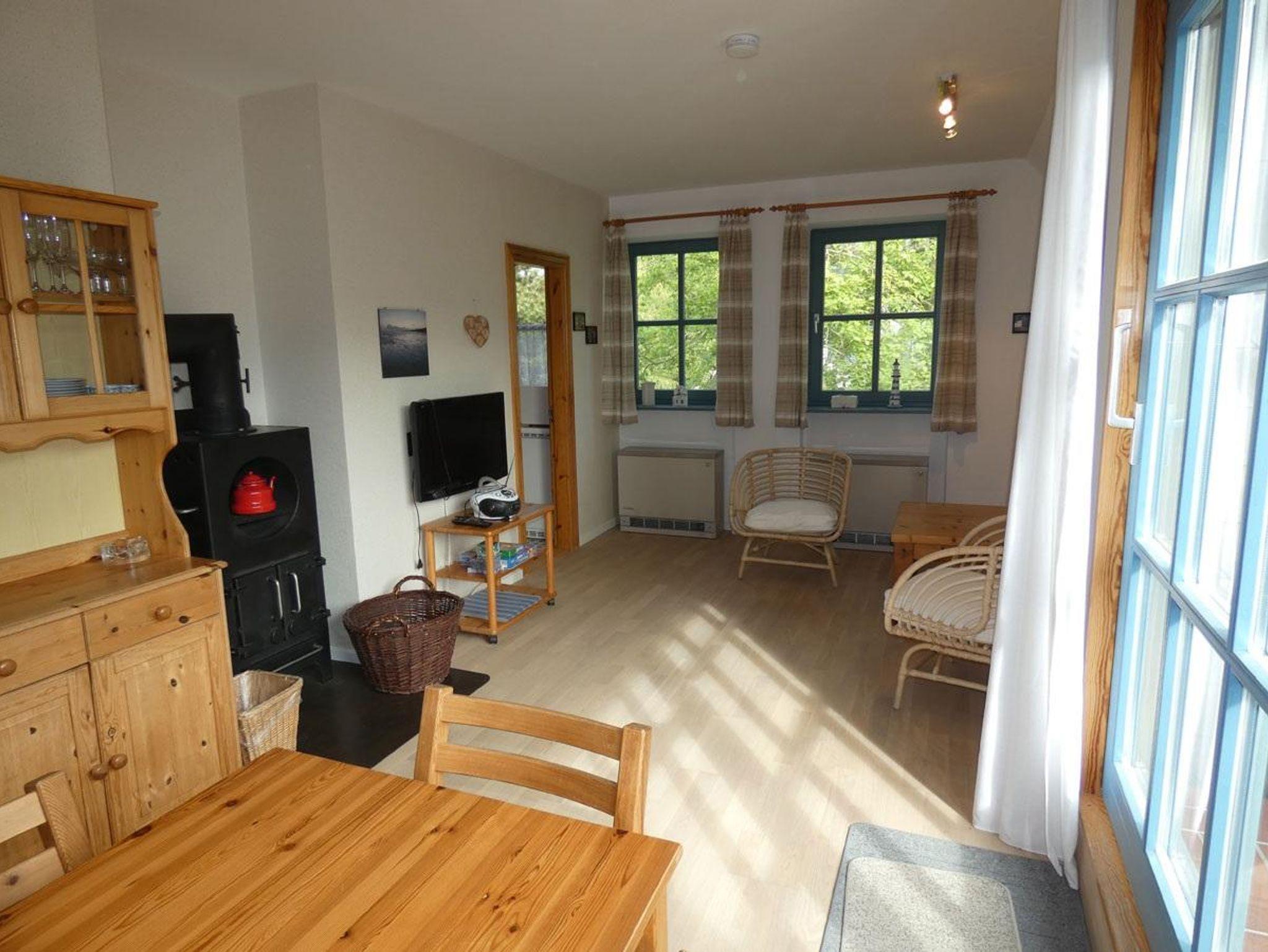 Die Wohnung Rico im Obergeschoß verteilt sich über 2 Etagen auf 75qm. Im Obergeschoß finden Sie einen Wohnschlafraum mit Schlafcouch, Sitz- und Essecke, dänischem Kaminofen, sowie eine sonnige Fensterfront mit Ausgang zum Balkon vor. Die Ferienwohnung ist im skandinavischen Stil mit einer separaten Küche, Insektenschutzfenstern, einem Duschbad, sowie einem separatem WC ausgestattet. Ein Schlafzimmer mit einem Doppelbett läst zum Schlummern ein. Ein weiterer Schlafraum mit 2 Einzelbetten und Kindergitter (ein dritter Schlafplatz wäre hier möglich), einem Couchtisch und zwei Sesseln ist über die Wendeltreppe im Dachgeschoß erreichbar. Bettwäsche und Handtücher sind auf Anfrage mietbar.