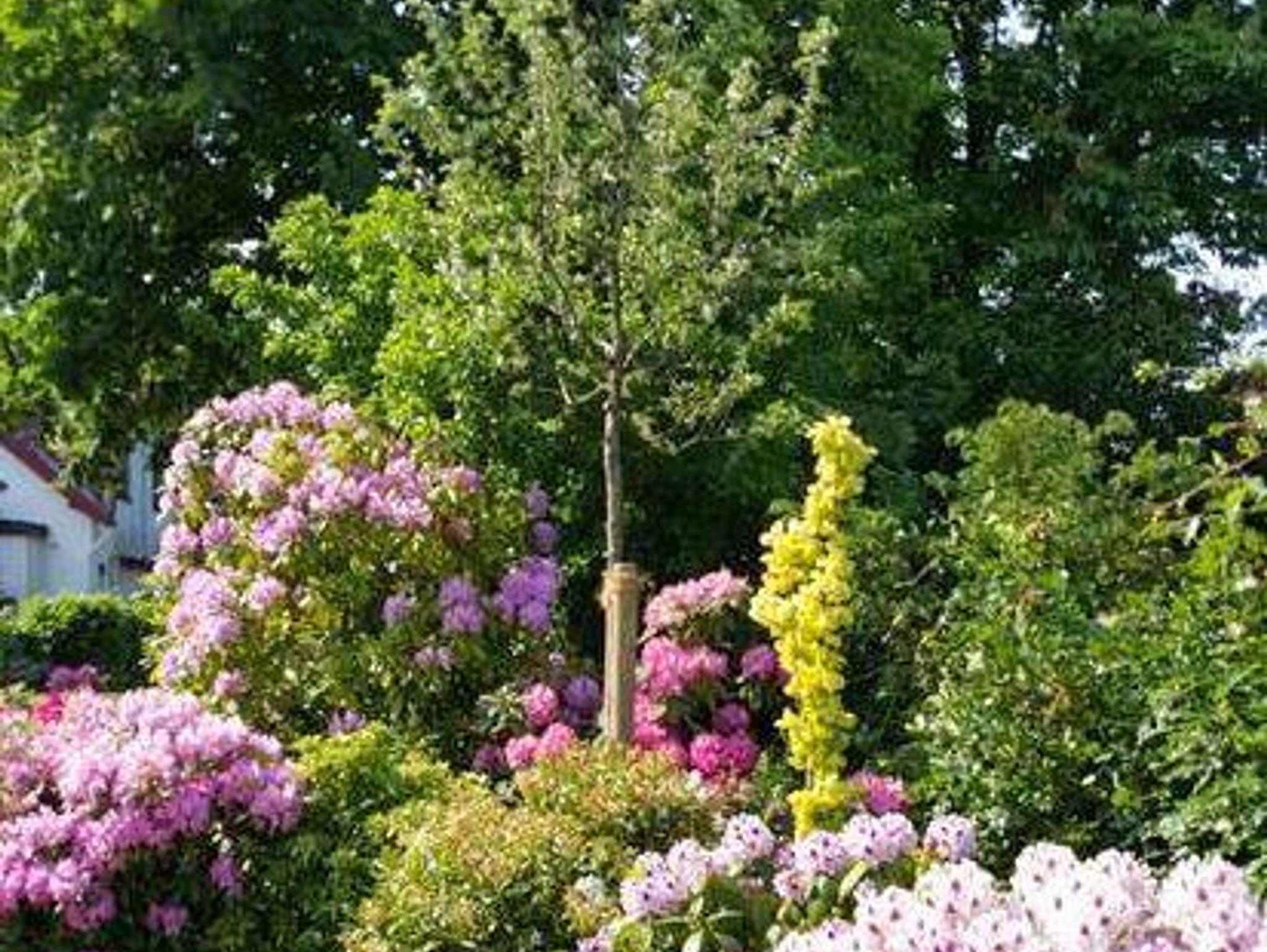 Ein hübscher von Bäumen, Rhododendronbüschen und Rosen eingerahmter Garten mit Liegen, Tischgruppen