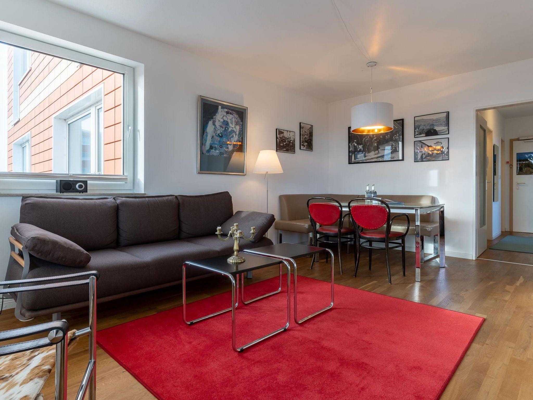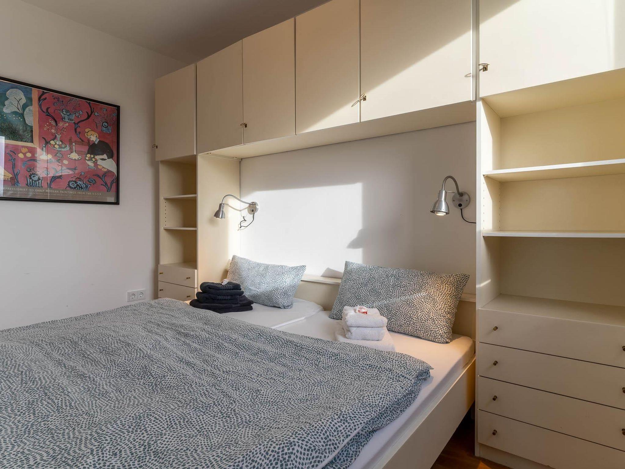 Die Wohnung hat einen Schlafraum mit einem Doppelbett, einem weiteren Schlafraum mit einem Einzelbett und einem großzügigen Wohnraum mit einem Schlafsofa und einer Sitzecke.