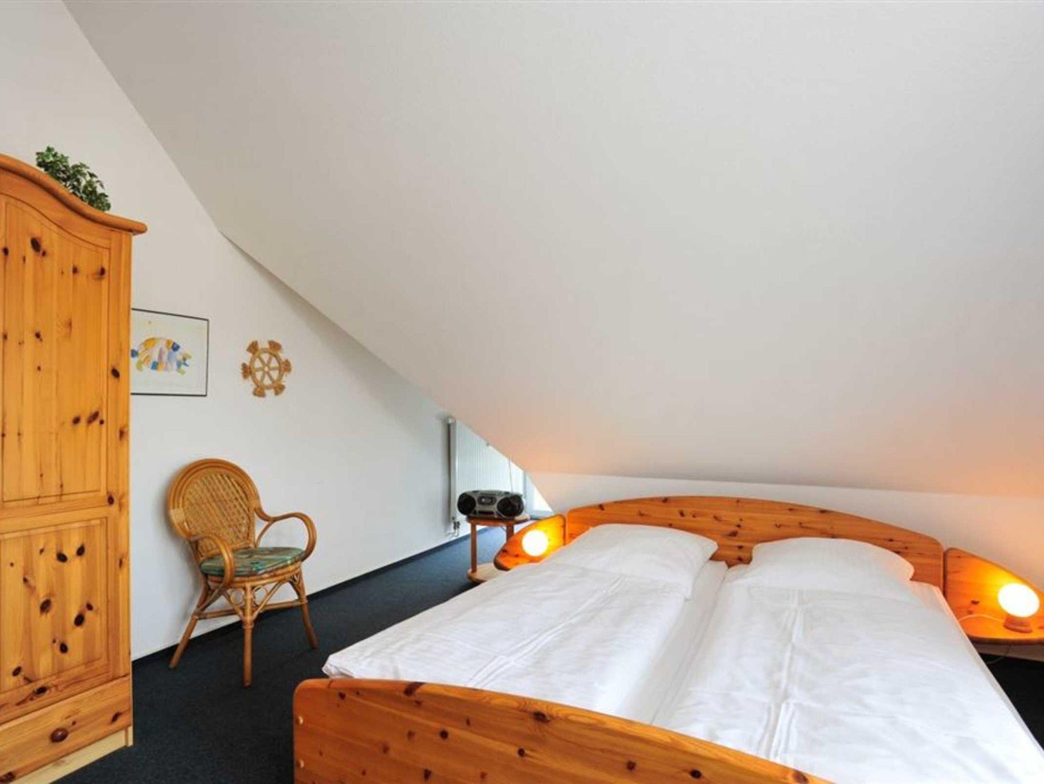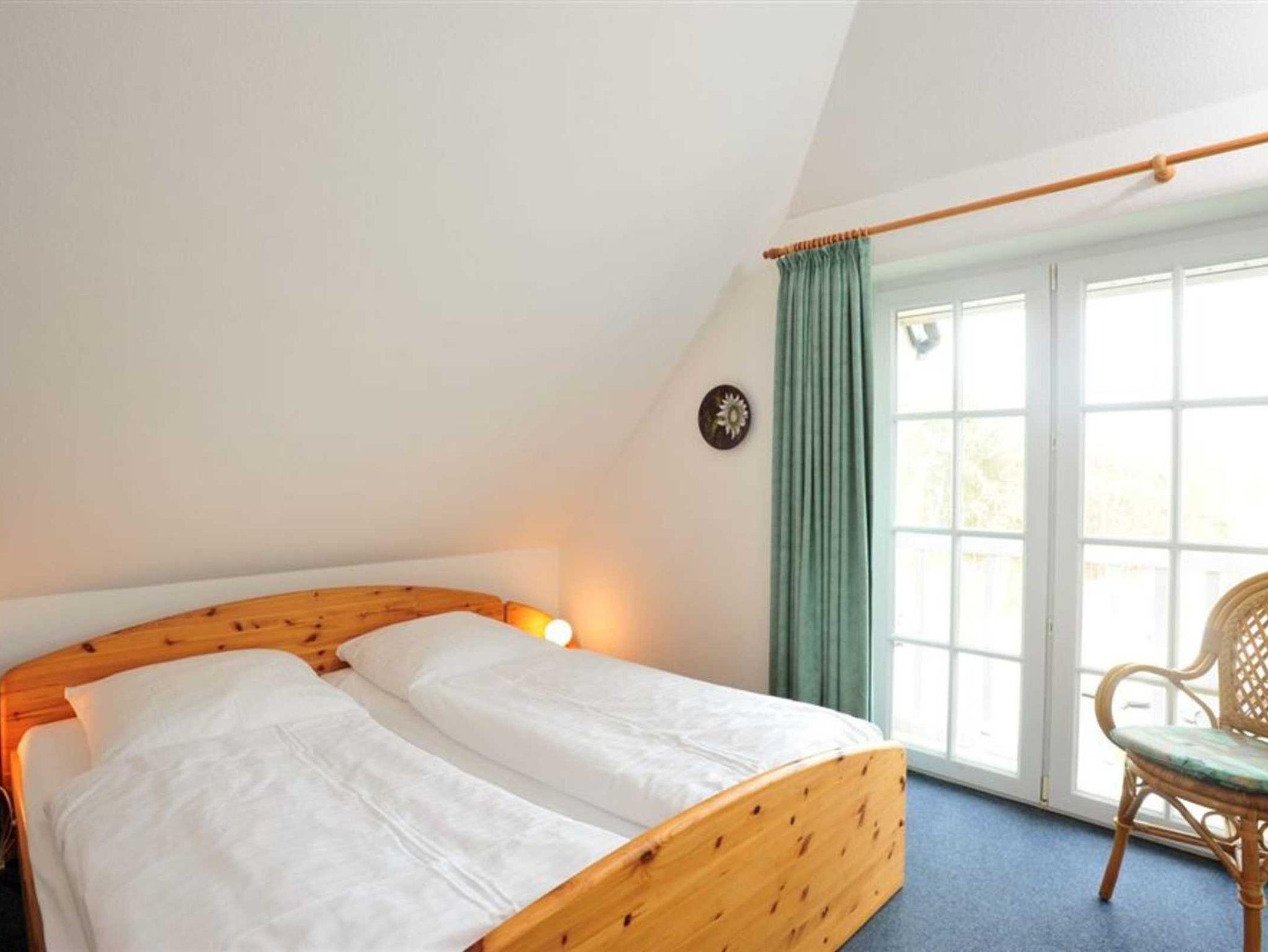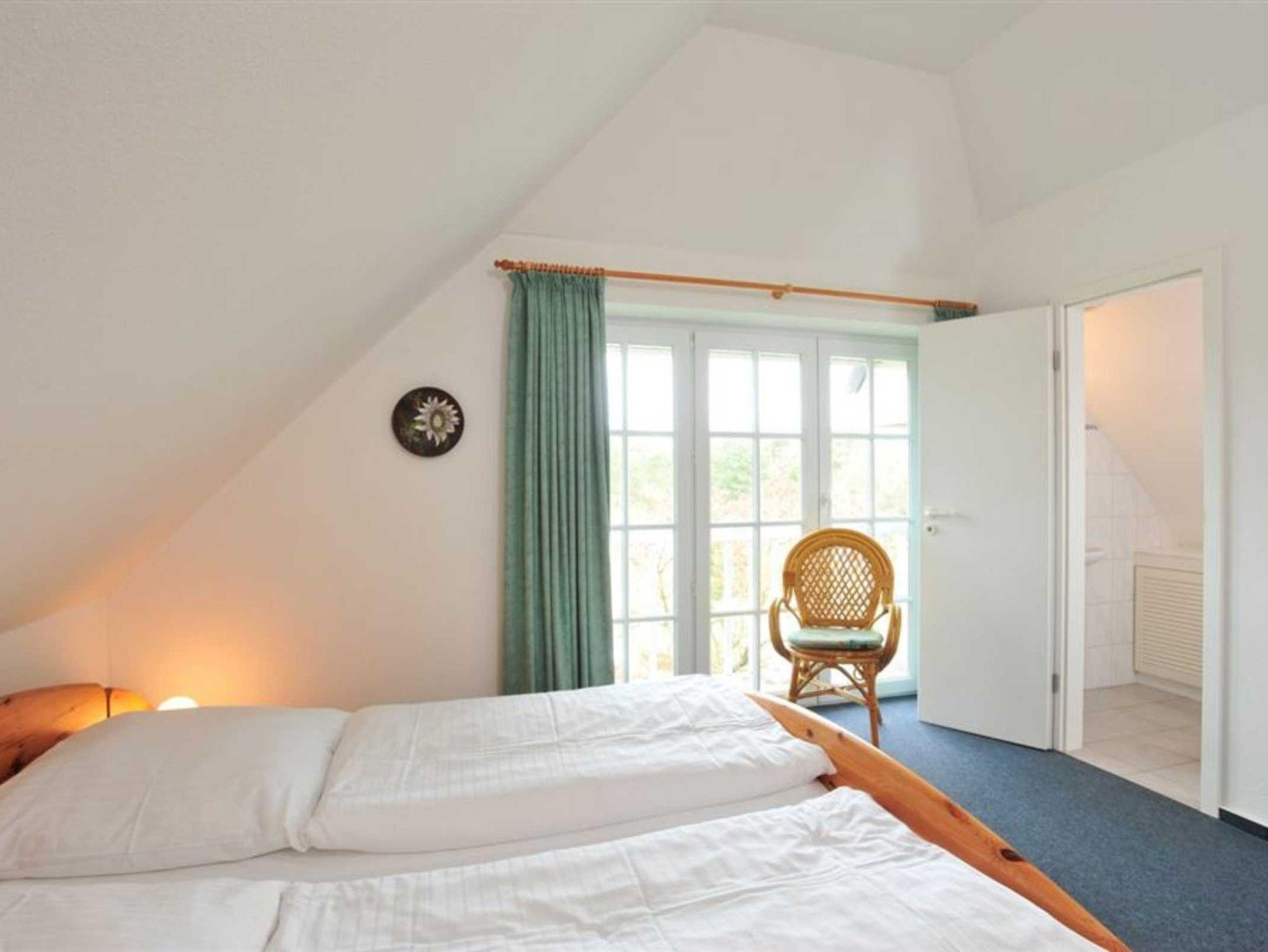 Schlafzimmer mit Doppelbett (2x 90x200cm), Kleiderschrank, 2 Stühlen und Radio mit CD-Player. En-suite dazu ein kleines Badezimmer mit WC.