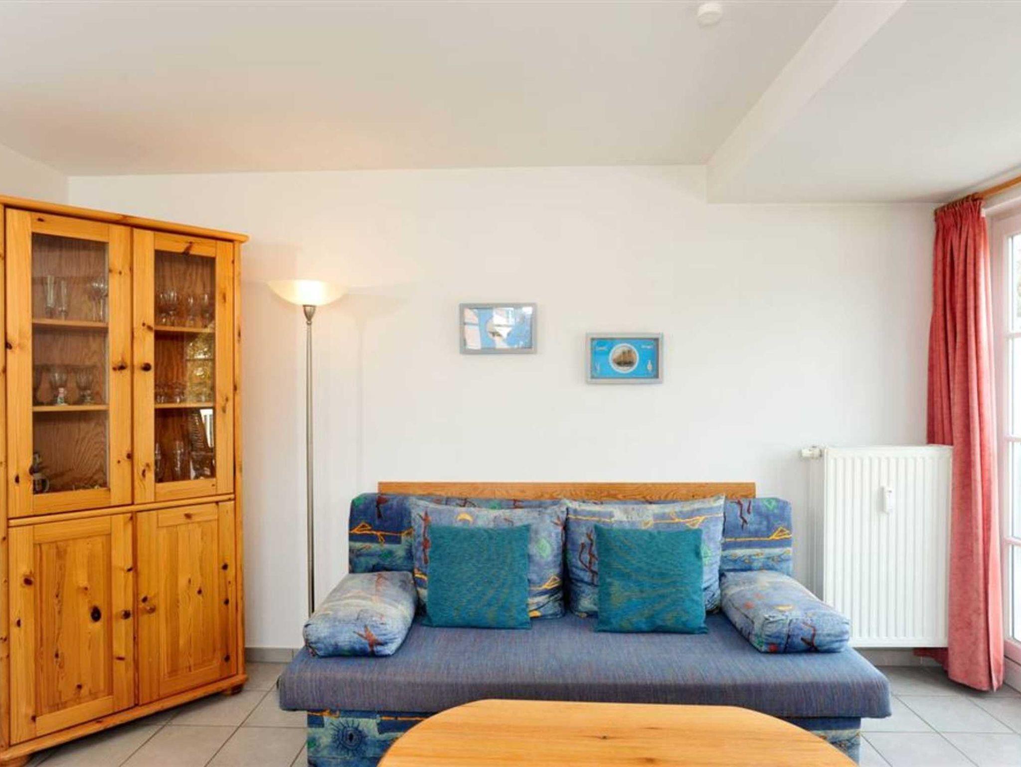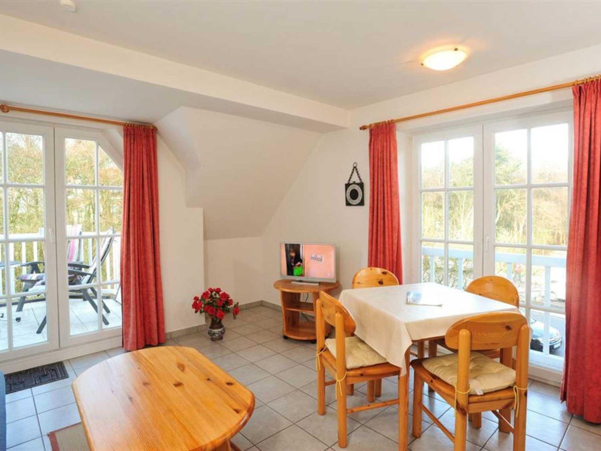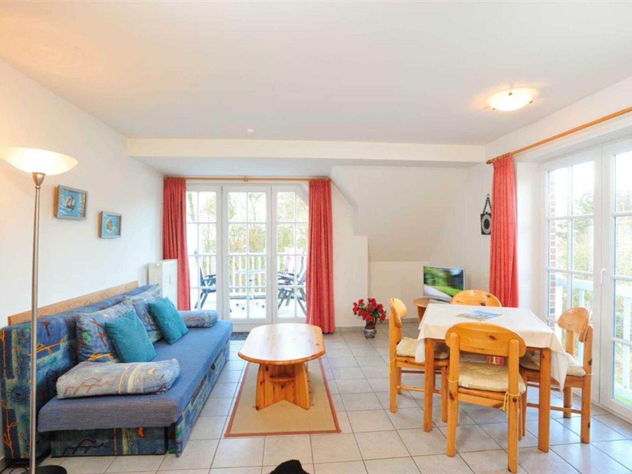 Wohnzimmer mit ausziehbarem Schlafsofa (160x200cm), TV (Kabel), Stereo-Kompaktanlage und Esstisch mit 4 Stühlen. Direkter Zugang zum möblierten Balkon nach Süden mit Waldblick. Offene Küche mit Backofen, Mikrowelle, Geschirrspüler, Kühlschrank mit Gefrierfach und Radio.