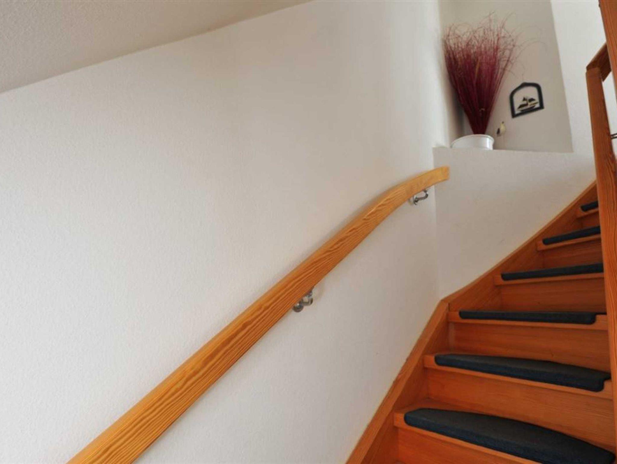Flur mit Garderobe, Spiegel und Abstellkammer mit Staubsauger im Eingangsbereich. Vom Flur führt eine Treppe zum DG.