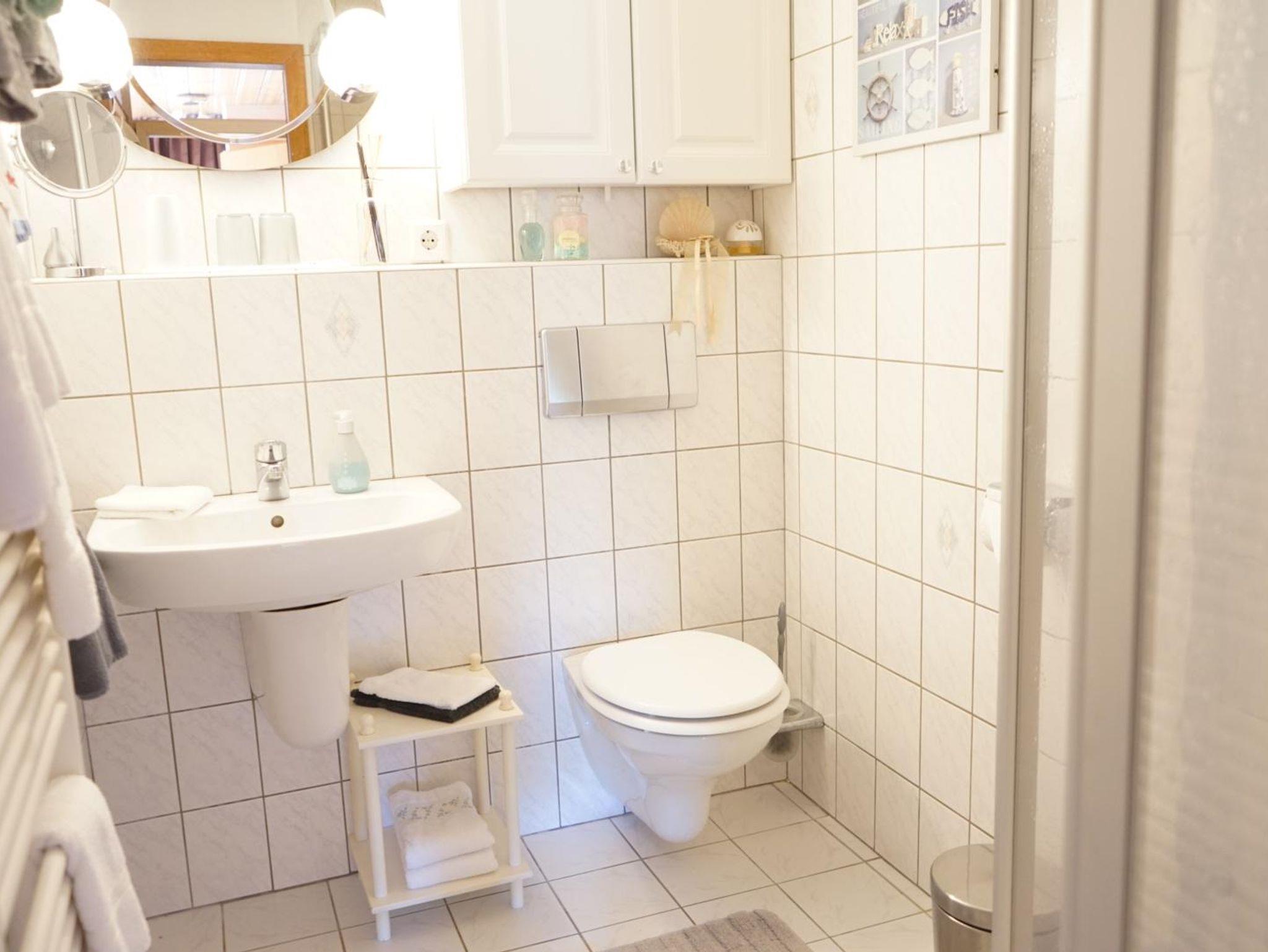 Das eigene Badezimmer ist mit Dusche, einem Waschbecken mit Spiegel und einem WC ausgestattet.
