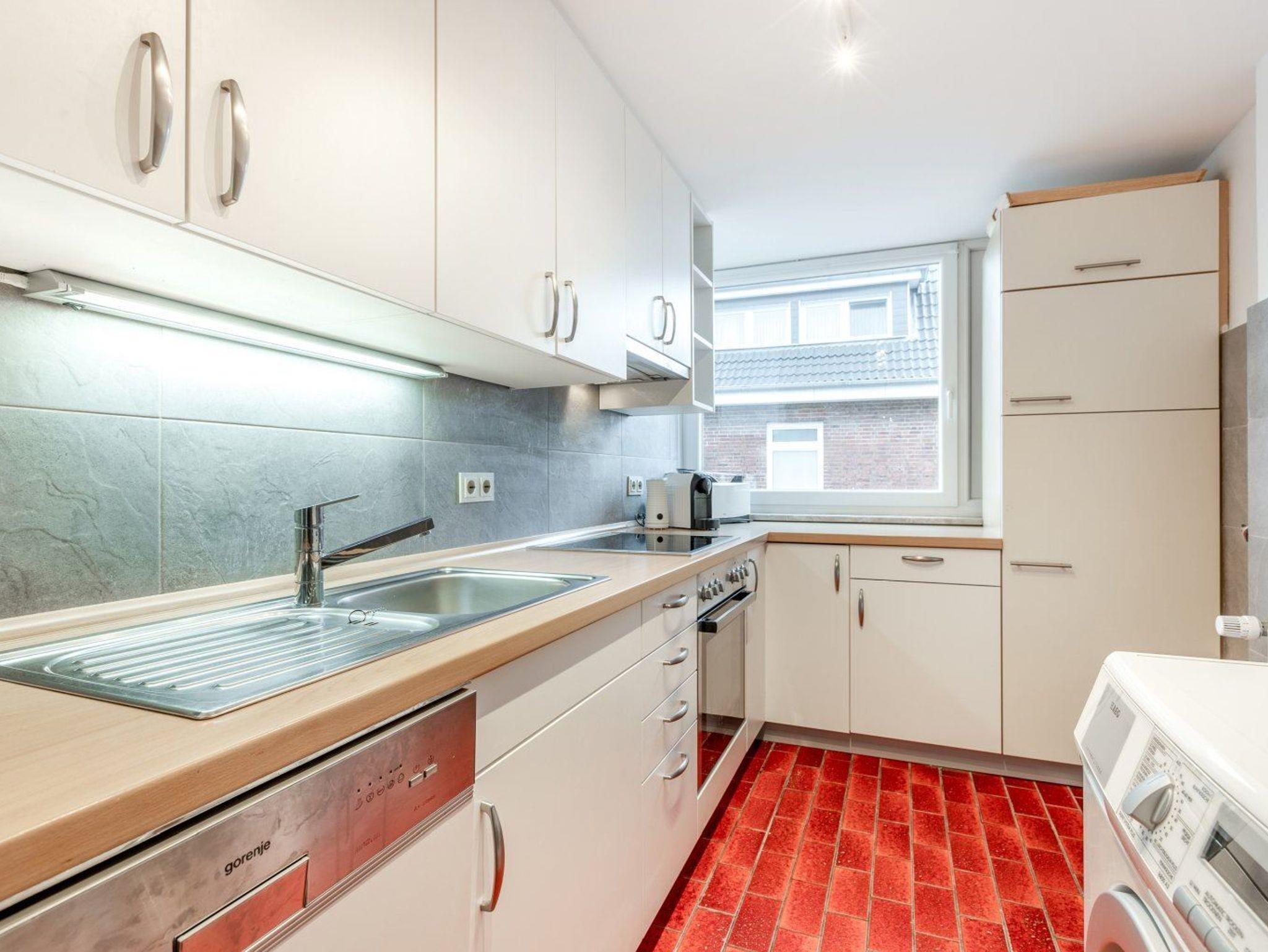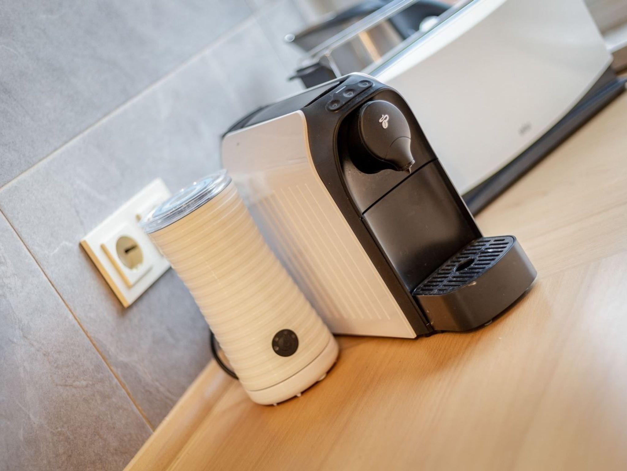 Separate Küche mit Backofen, Mikrowelle, Geschirrspüler, Kühlschrank mit Gefrierfach, Tchibo Cafissimo Kapsel-Kaffeemaschine und Wasch-Trockner (gegen Gebühr).