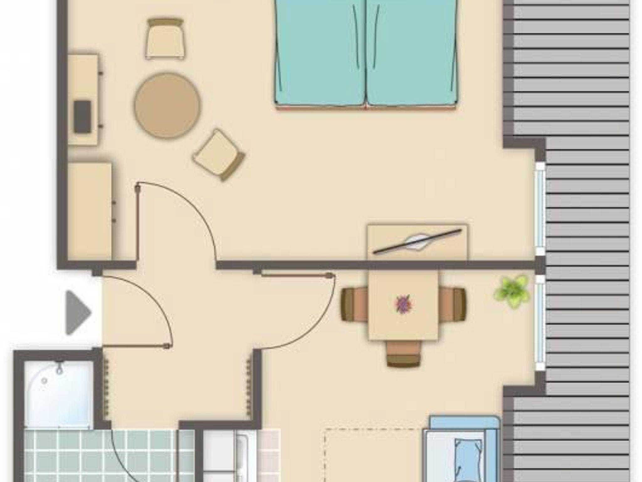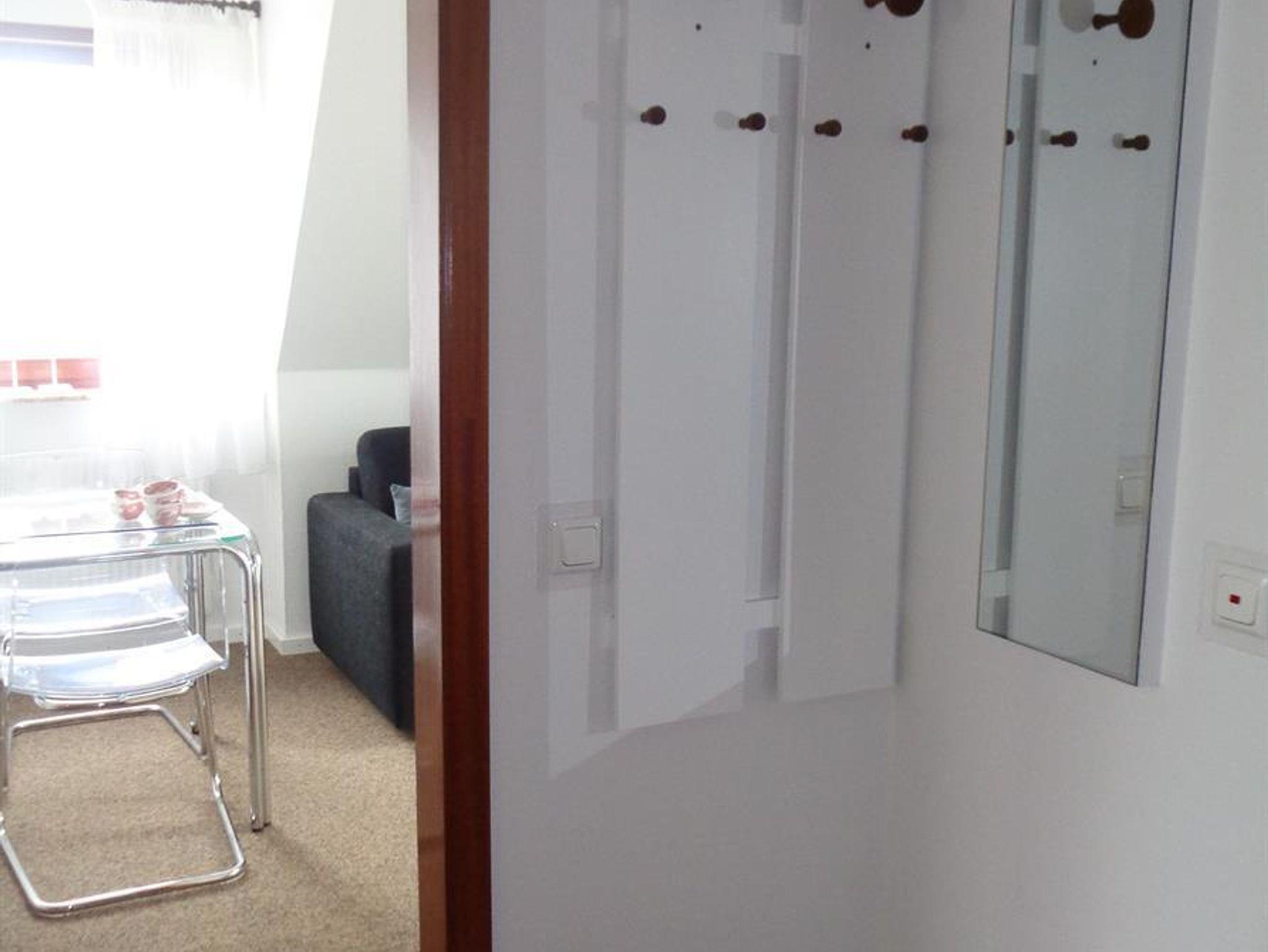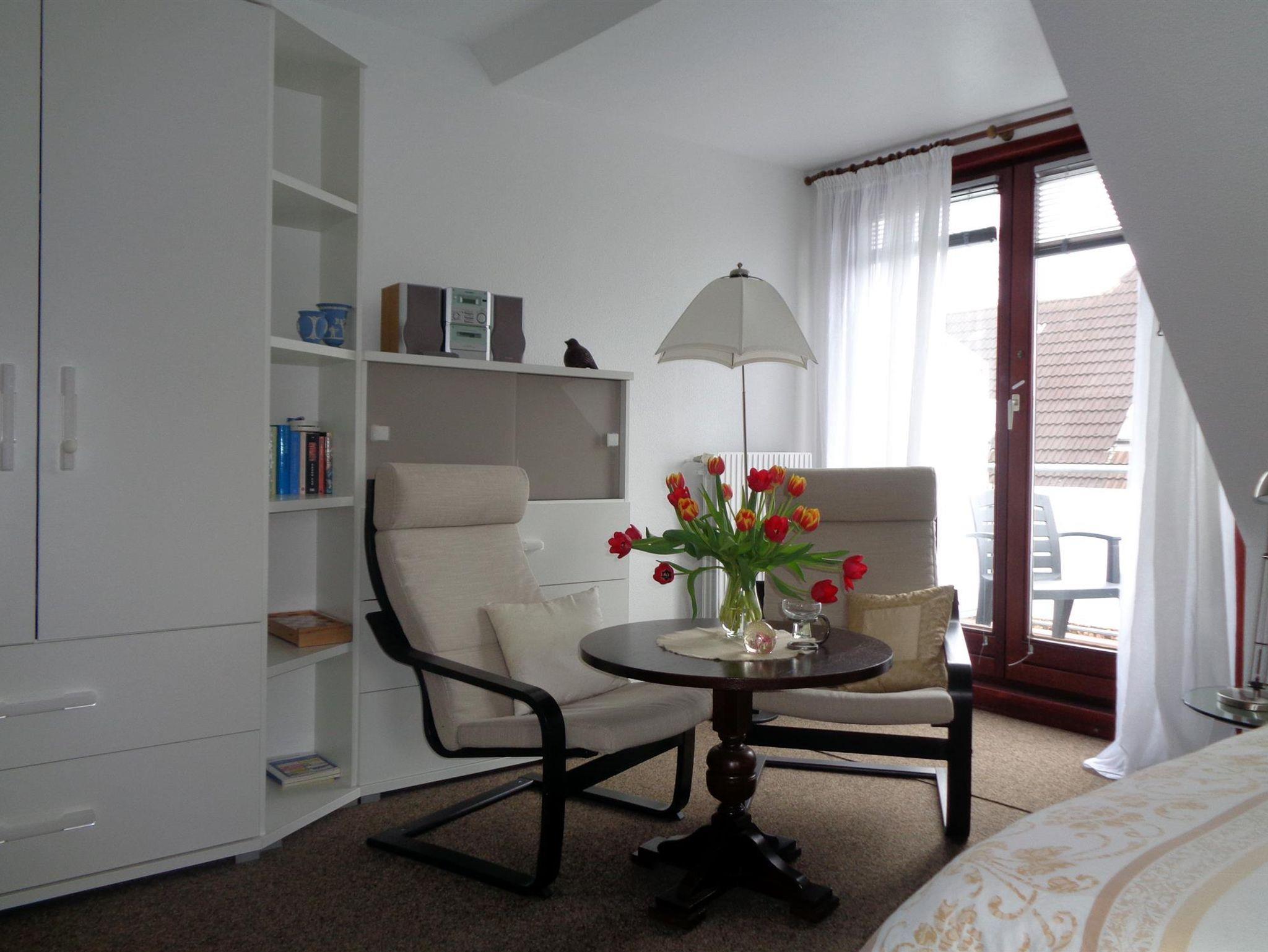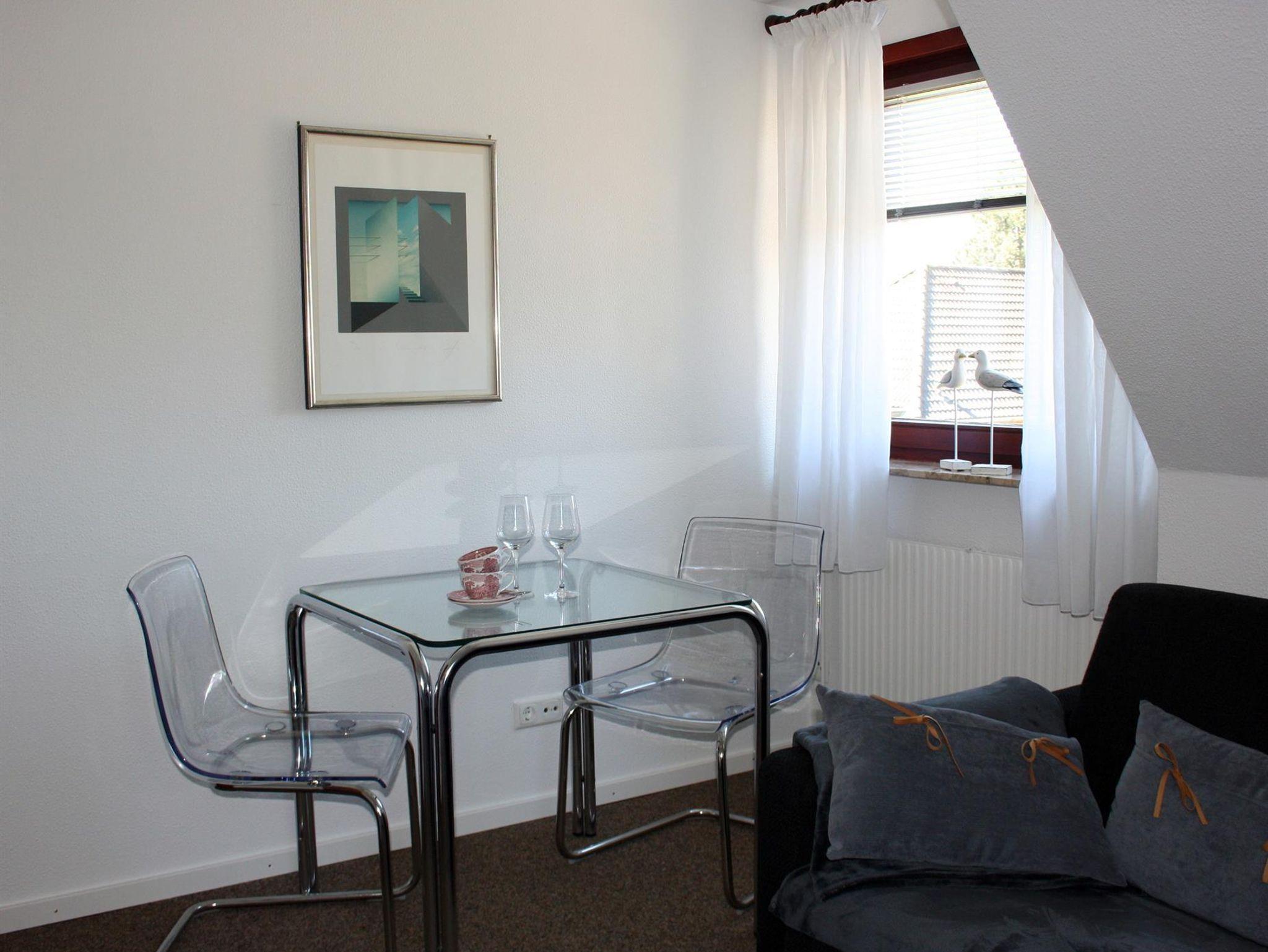Die Zweiraum-Ferienwohnung liegt im Dachgeschoss (1. OG). Die Treppe nach oben ist bequem. Sie kommen durch einen Flur in einen kombinierten Wohnschlafraum mit Sofa, Küchenzeile und Esstischgruppe.