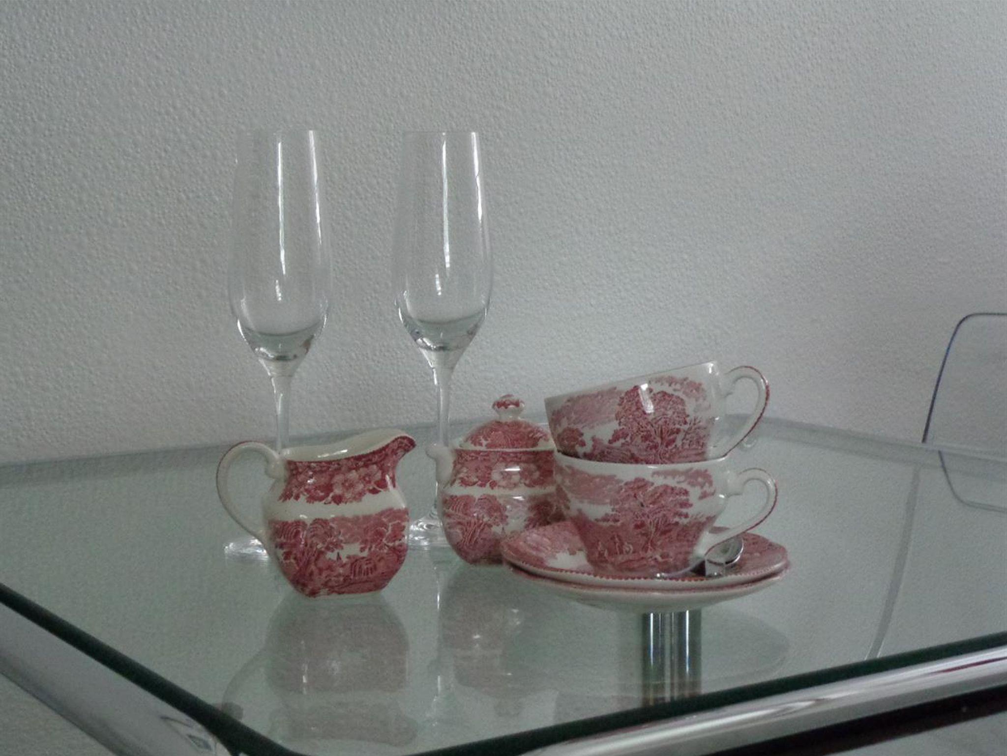 z.B. rotes Wedgwoods-Geschirr und einer Holz-Sesselgruppe zusammengestellt .