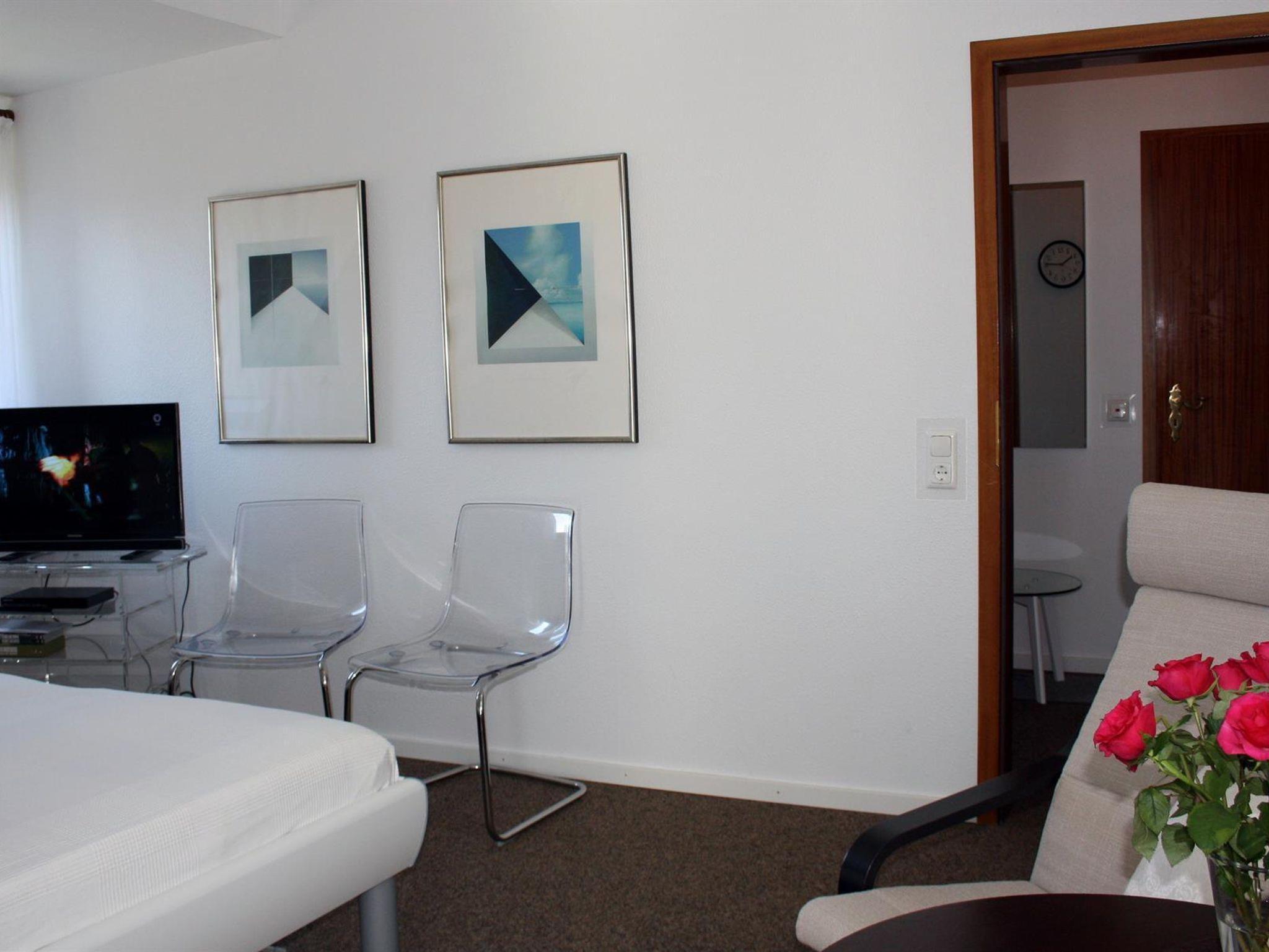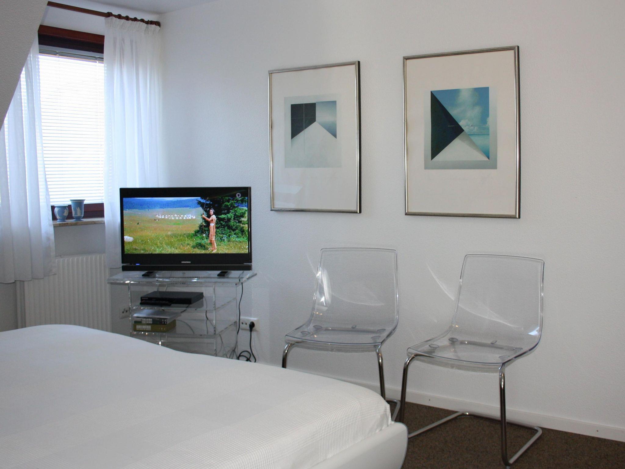 Kleiderschrank und eine Stereoanlage. Von dort gelangen Sie auf den möblierten Balkon.