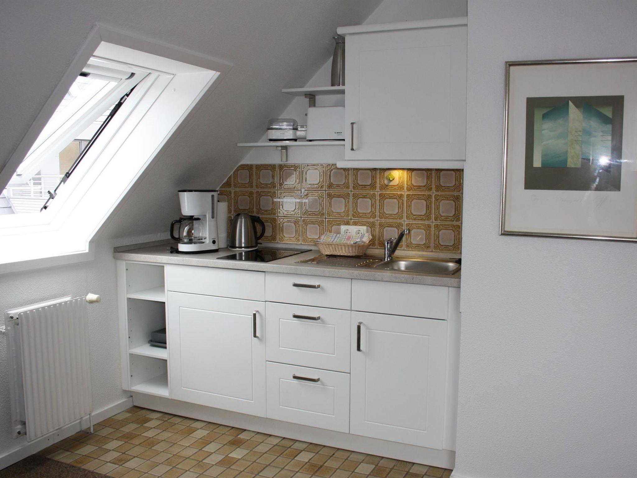 Die Küchenzeile ist u.a. mit 2-Platten-Cerankochfeld, Kaffeemaschine, Wasserkocher, Eierkocher,