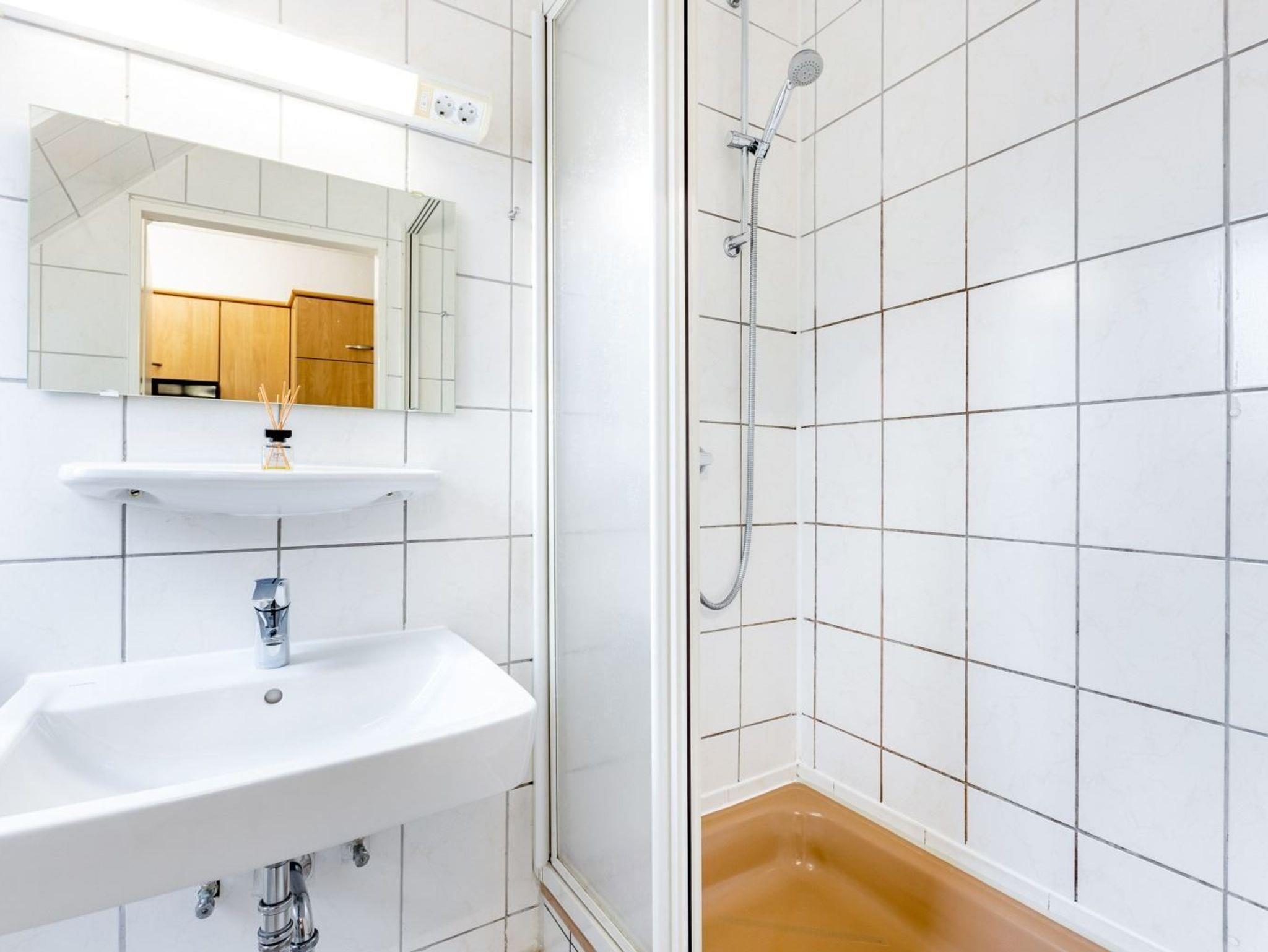 Badezimmer (Duschbad) mit Dusche, WC, Föhn und Tageslicht.