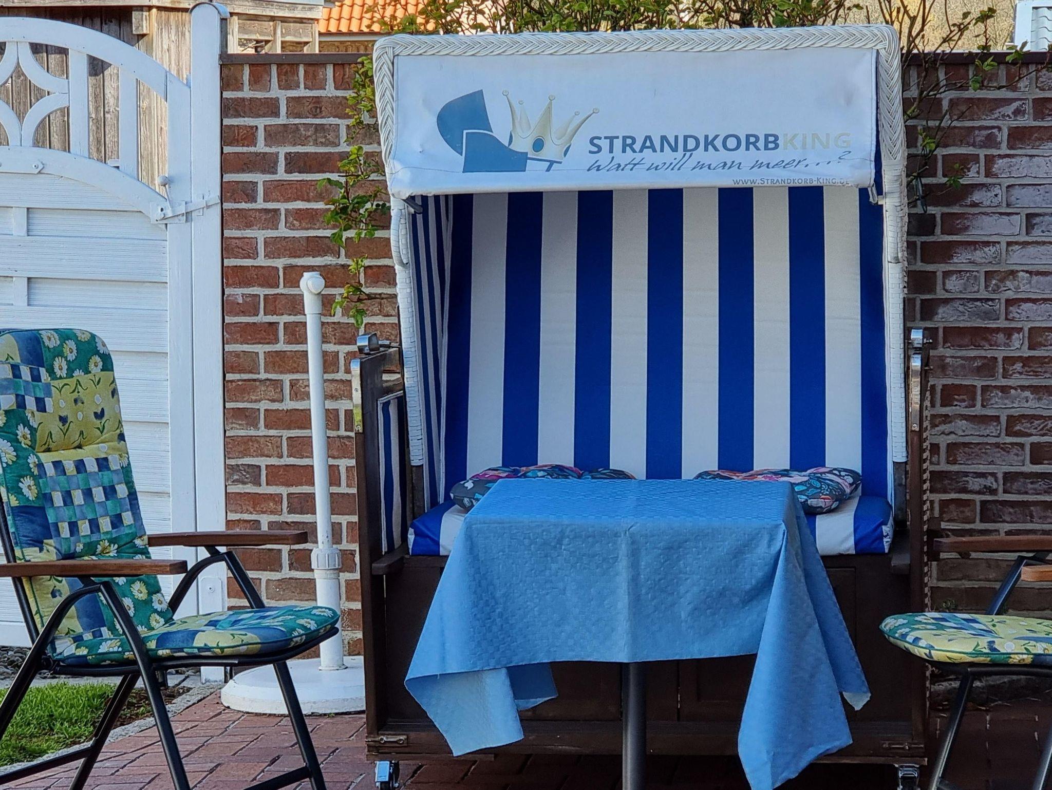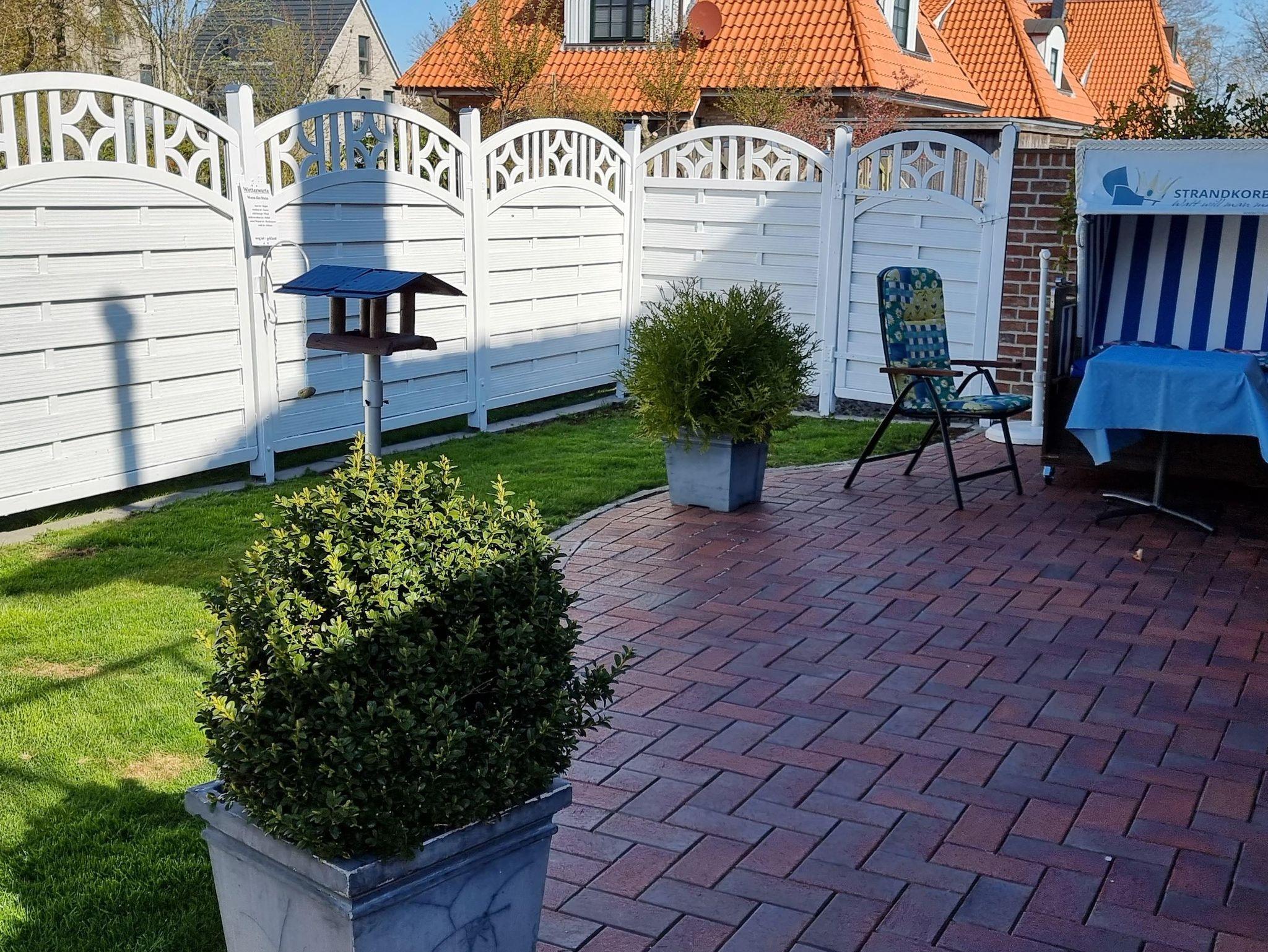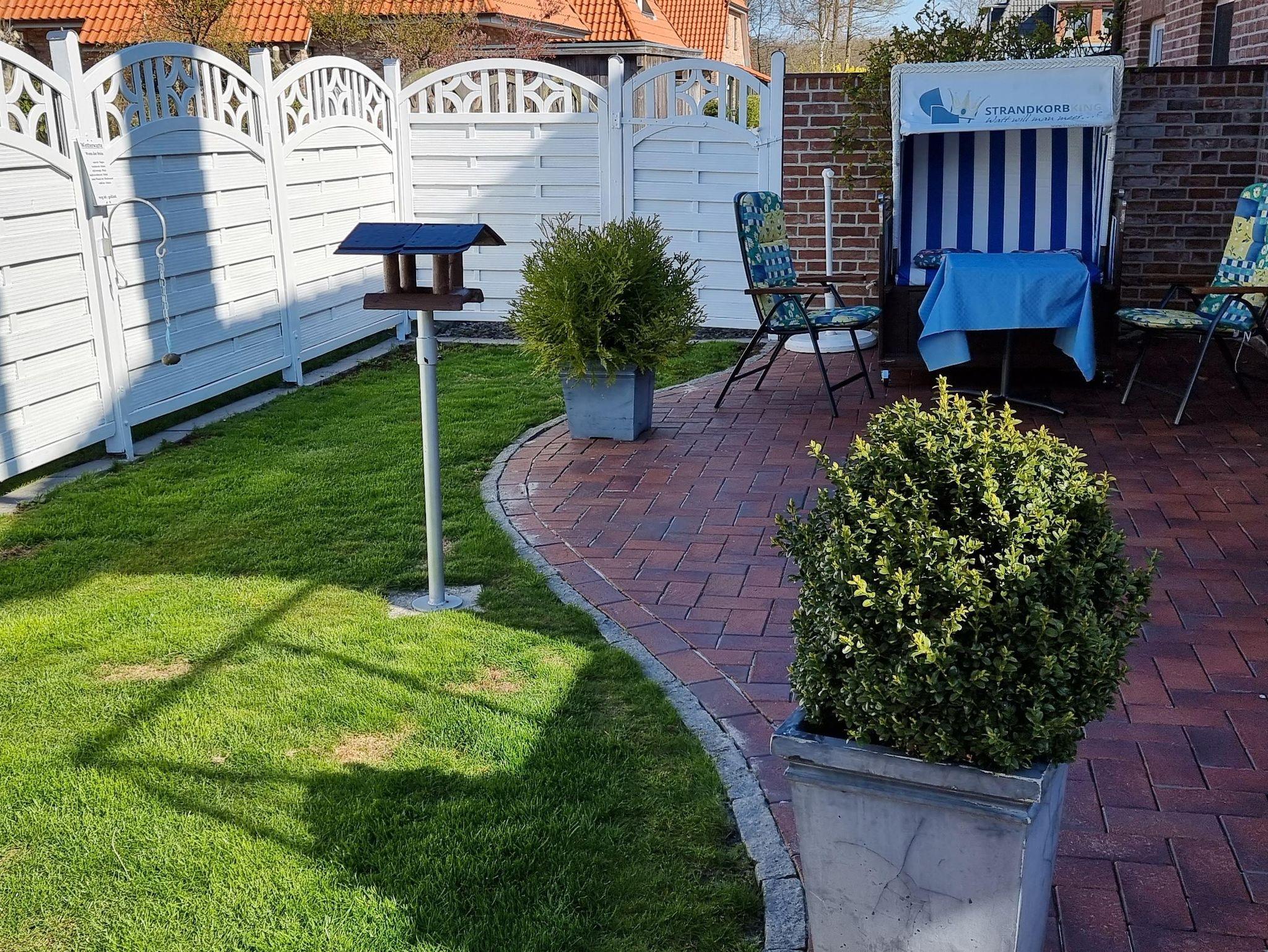 Zur Ferienwohnung gehört eine eigene Terrasse mit Zugang zum Garten. Ein kleines Gartenhaus mit Sitzecke und Grillmöglichkeit steht zur Verfügung.