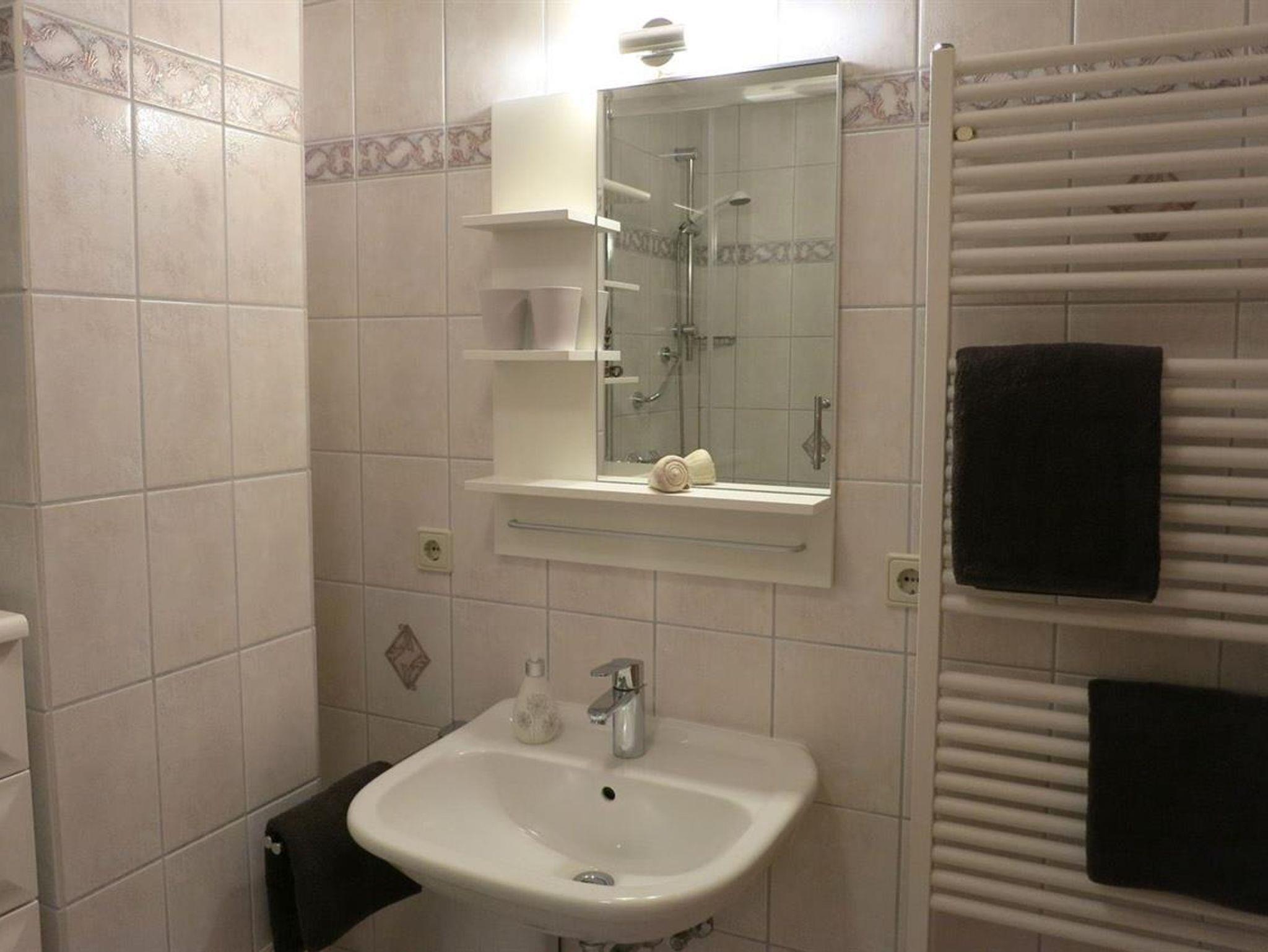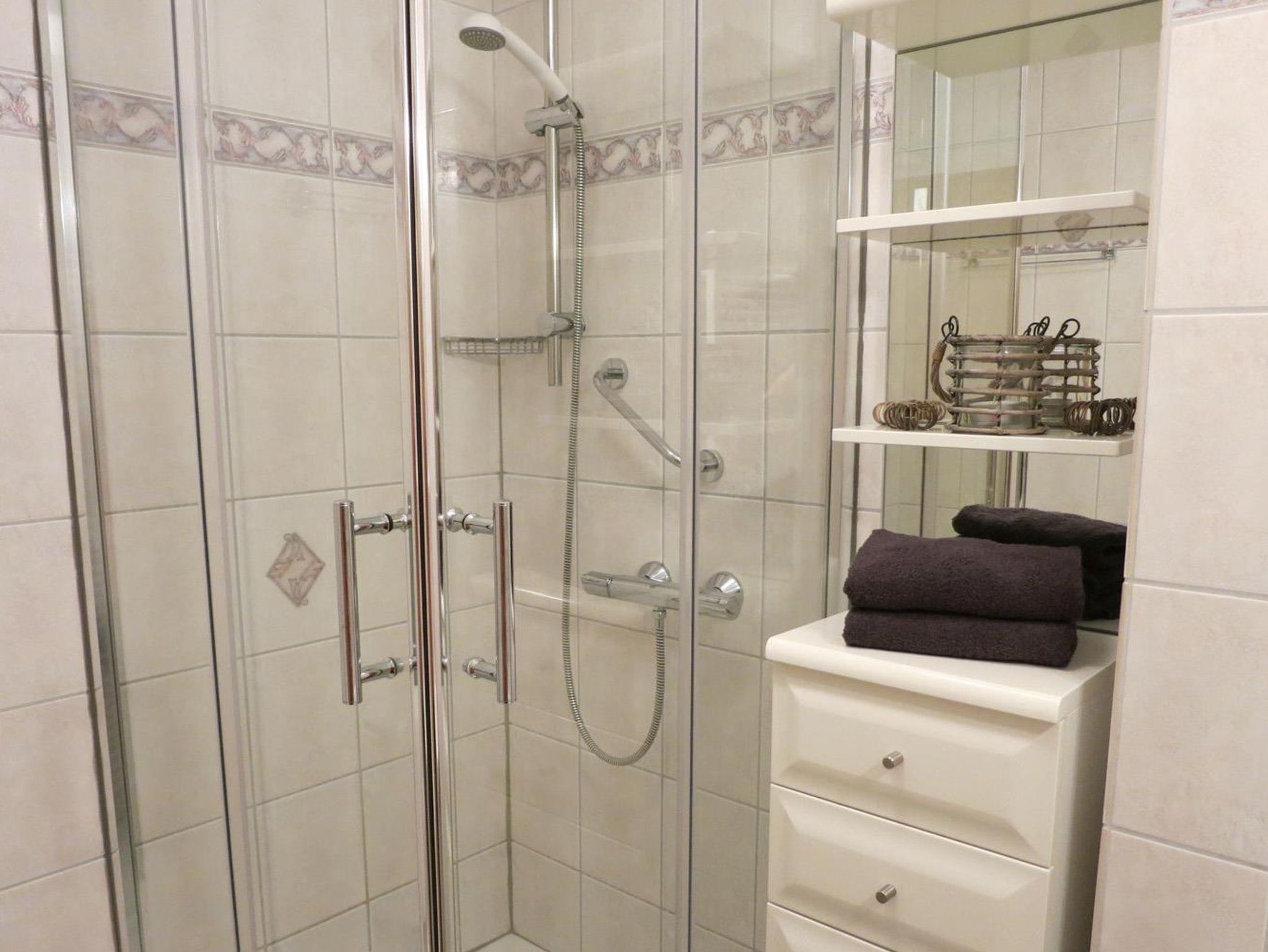 Bad: Duschkabine, Waschbecken, WC, Schrank, Spiegel beleuchtet, Deckenlampe, Föhn, beheizbarer Handtuchhalter, Handtuchstangen- u. Haken, Lüftungsanlage